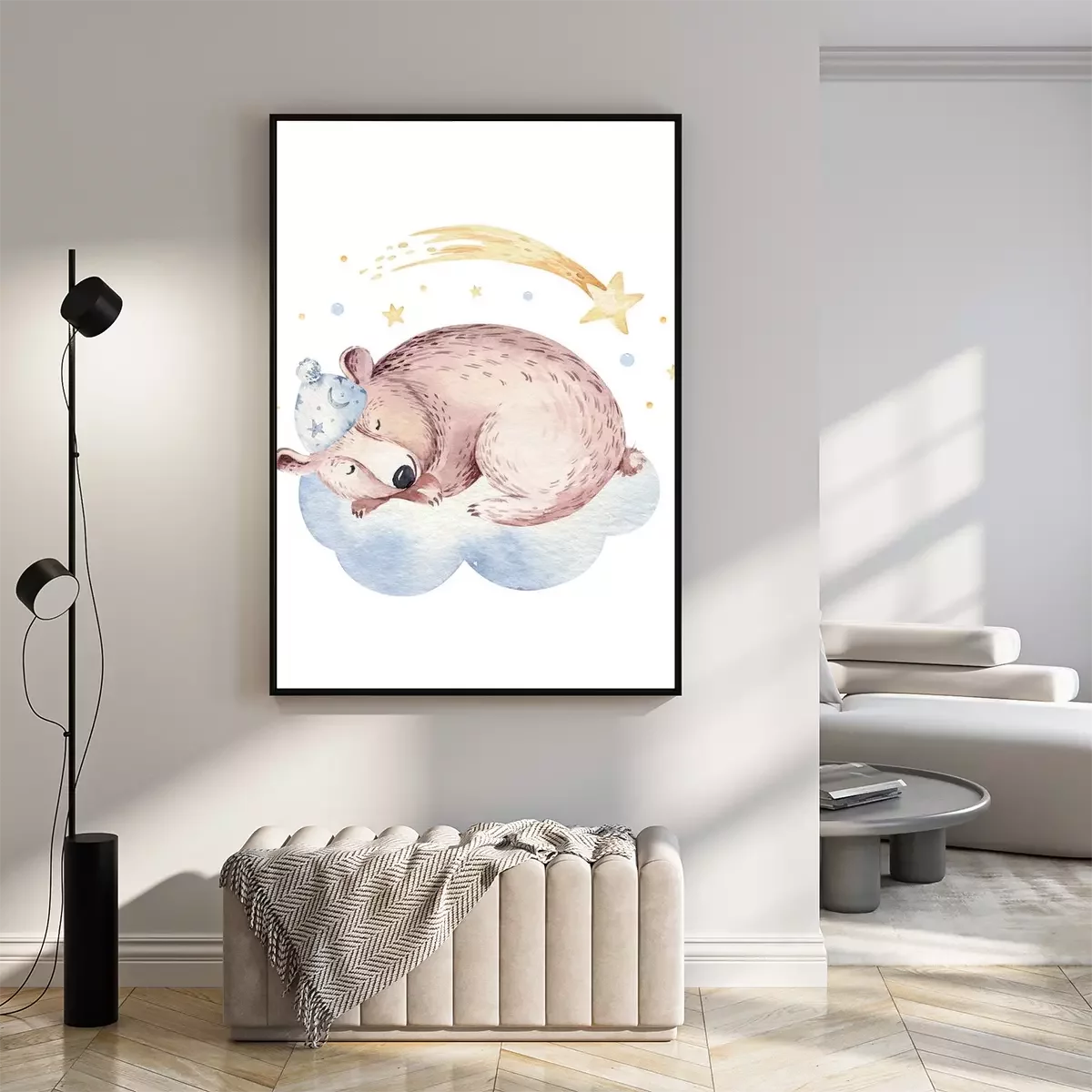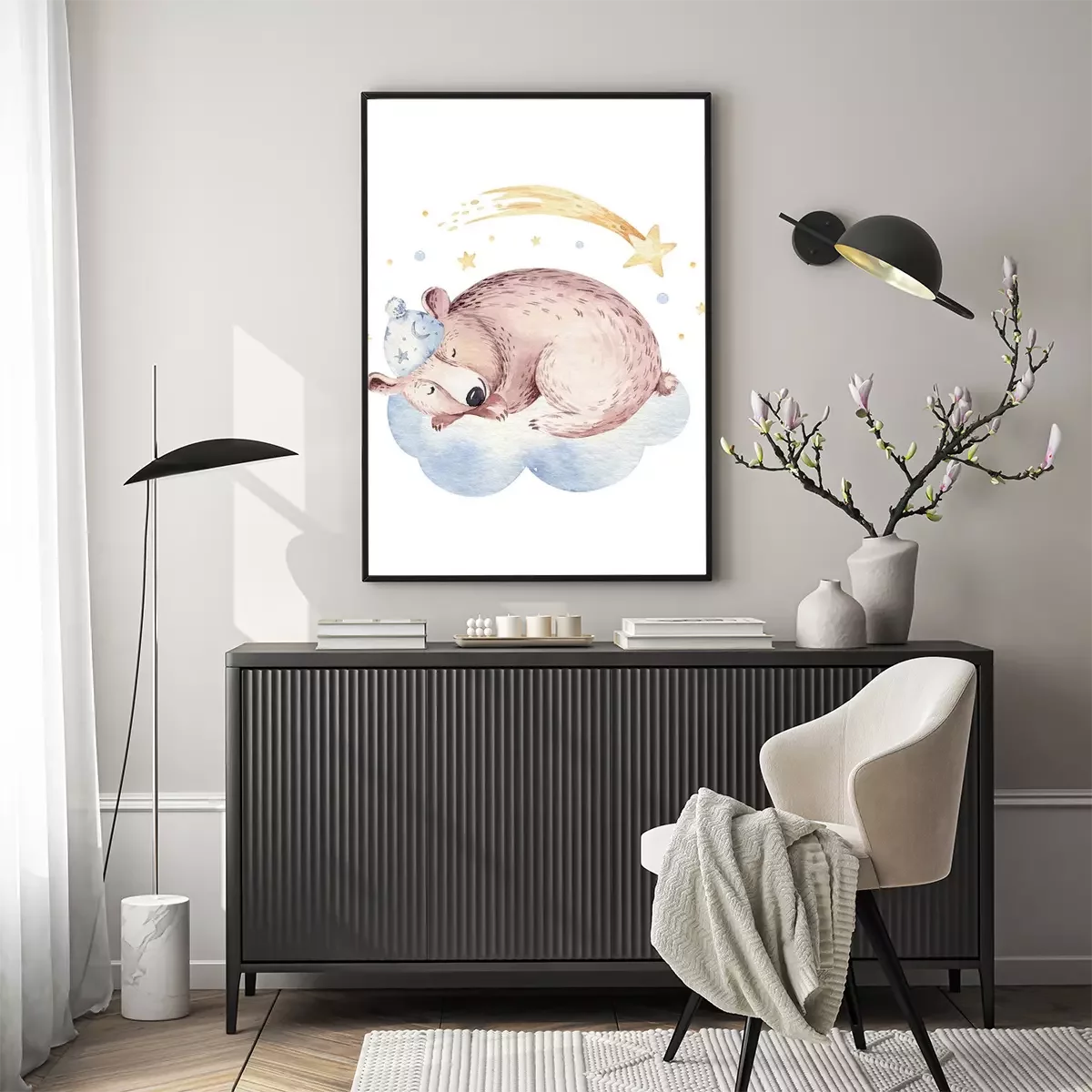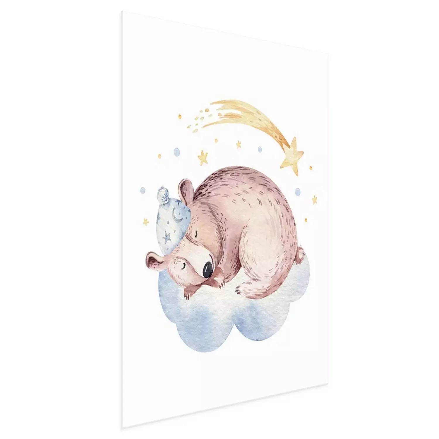 Poster: Een beer die op een wolk slaapt en een vallende ster