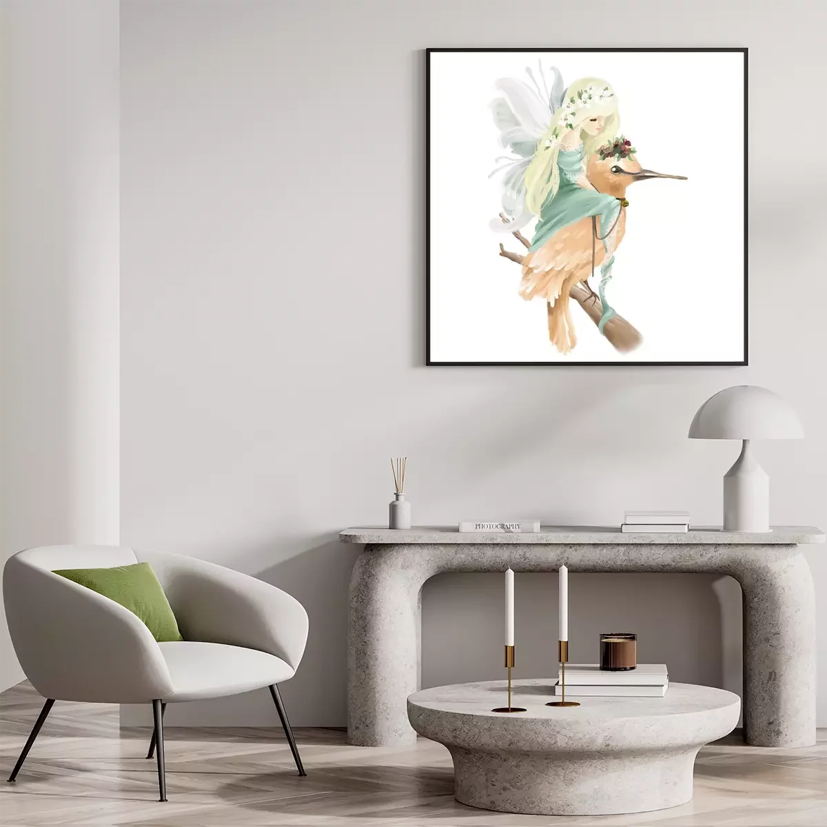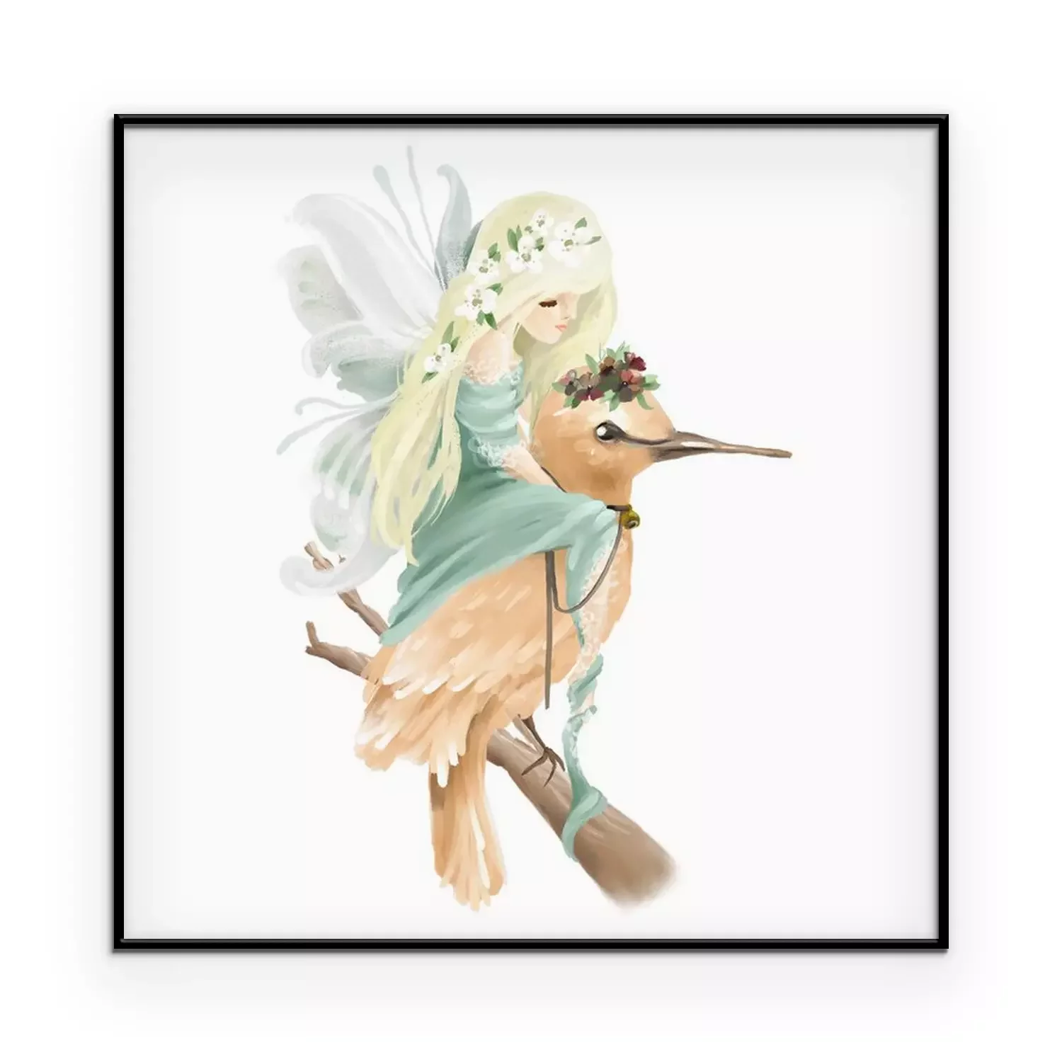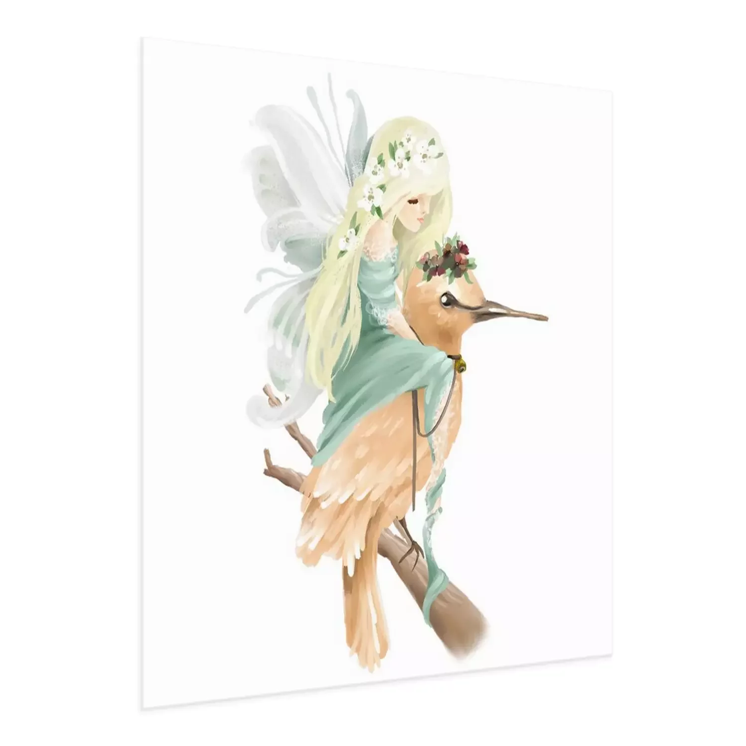 Poster: Een bosfee zittend op een vogel