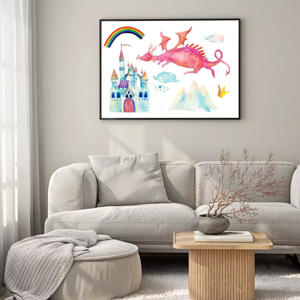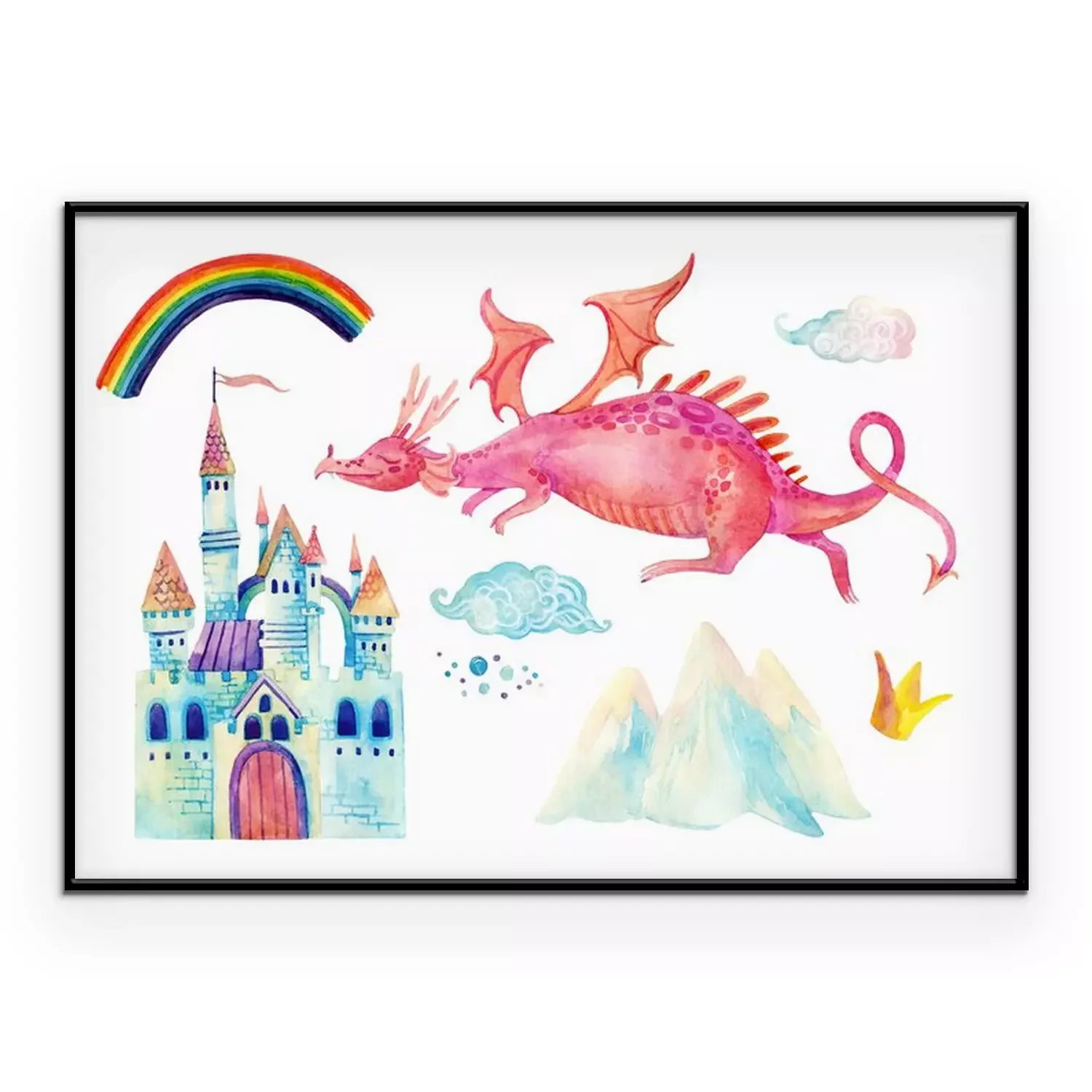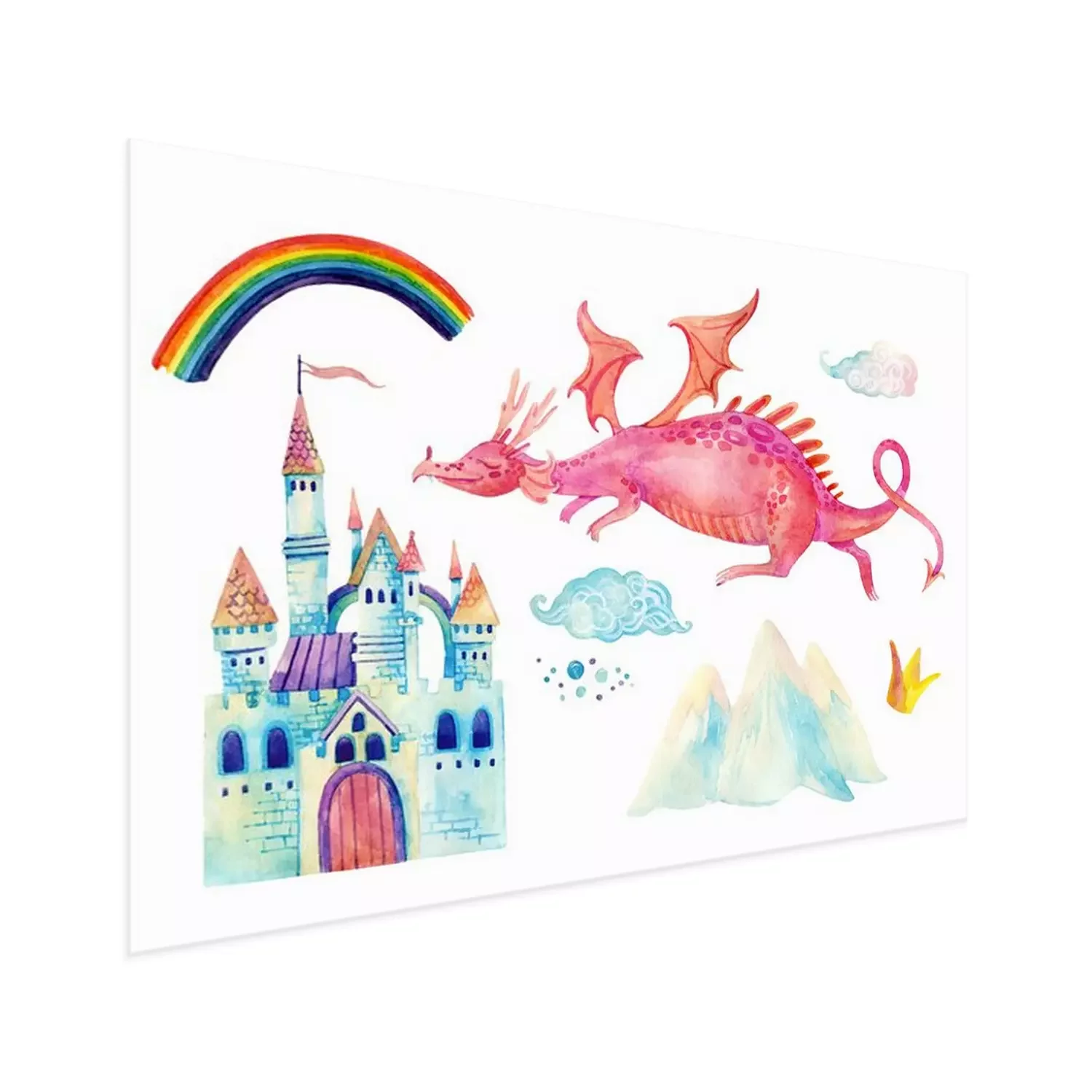 Poster: Een draak die naar het kasteel vliegt en een regenboog