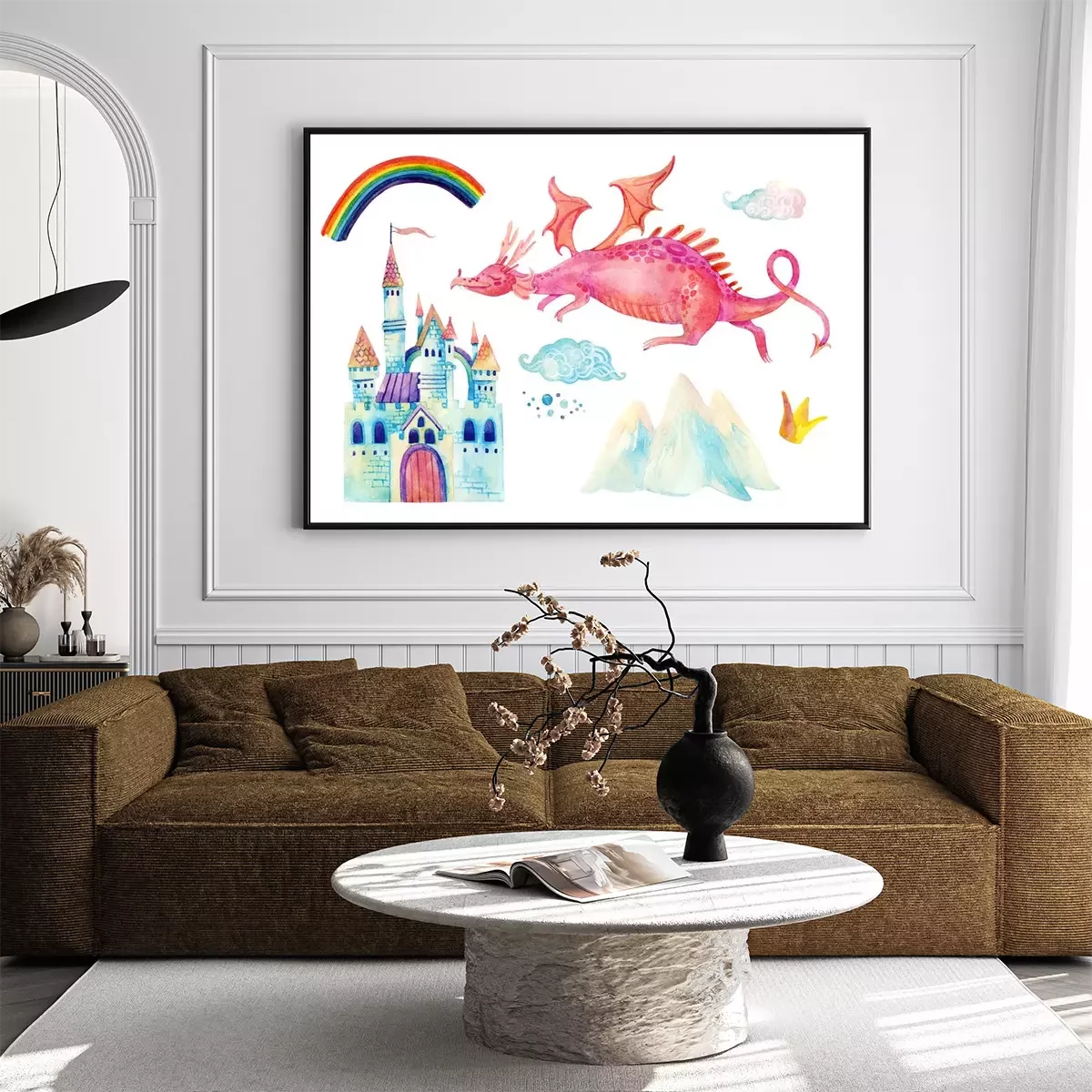 Poster Een draak die naar het kasteel vliegt en een regenboog