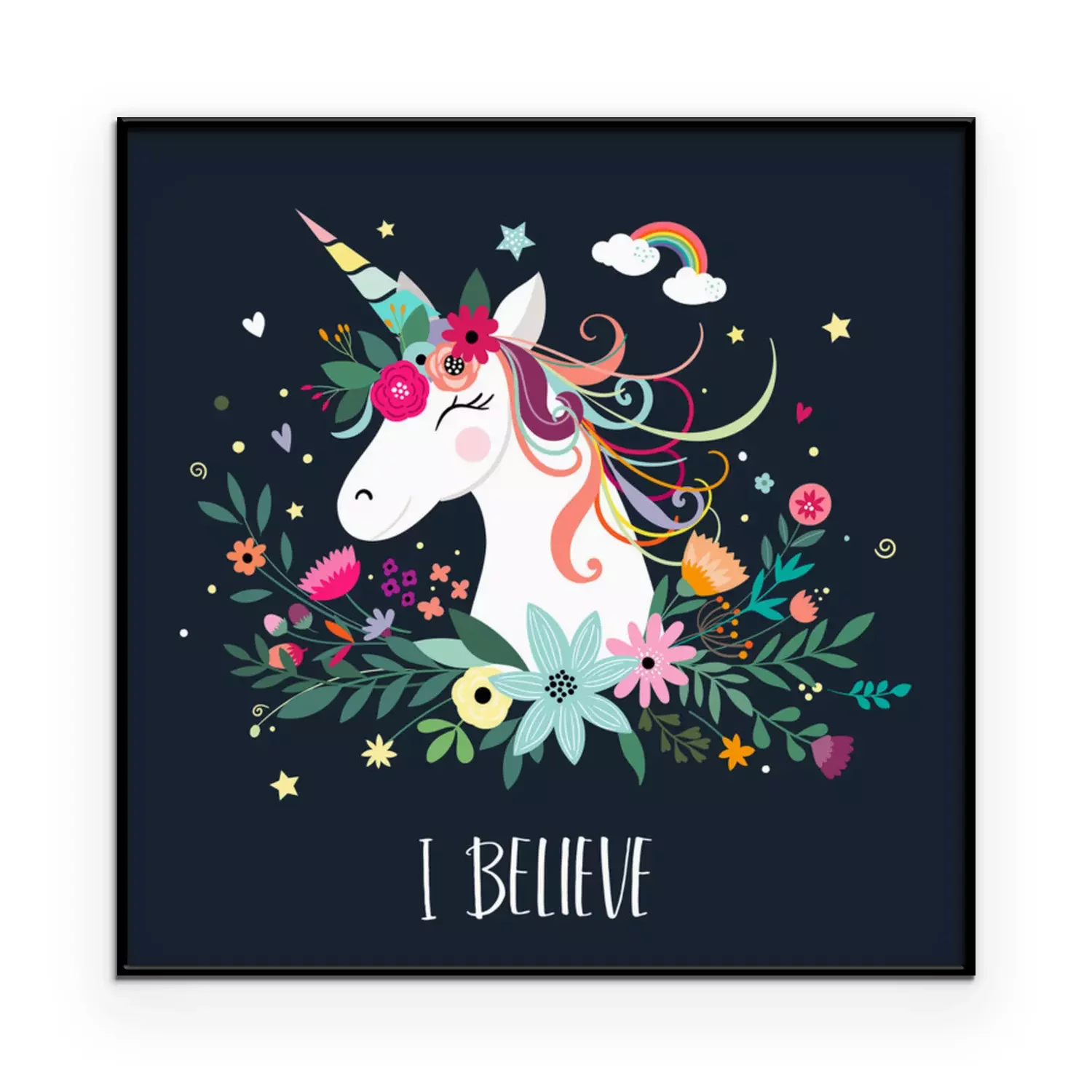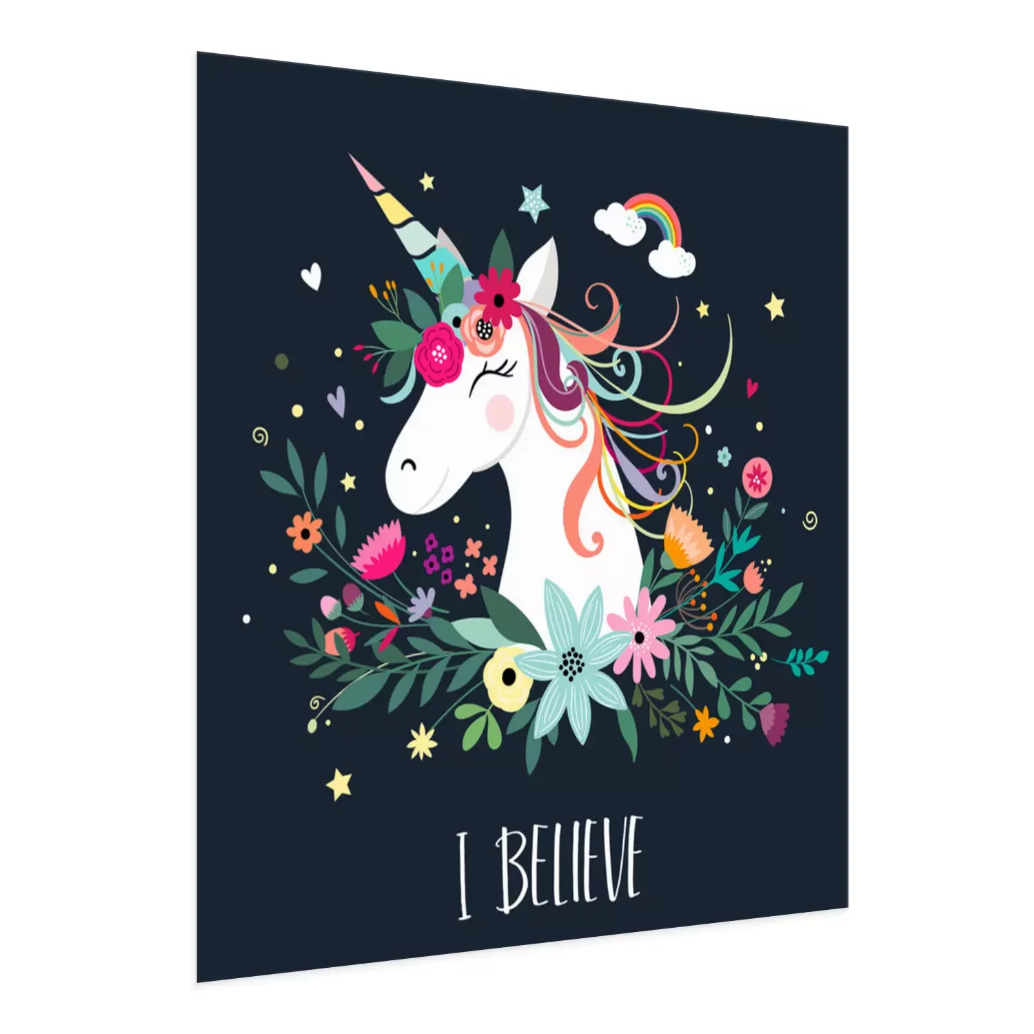 Poster: Een eenhoorn die achter bloemen vandaan gluurt