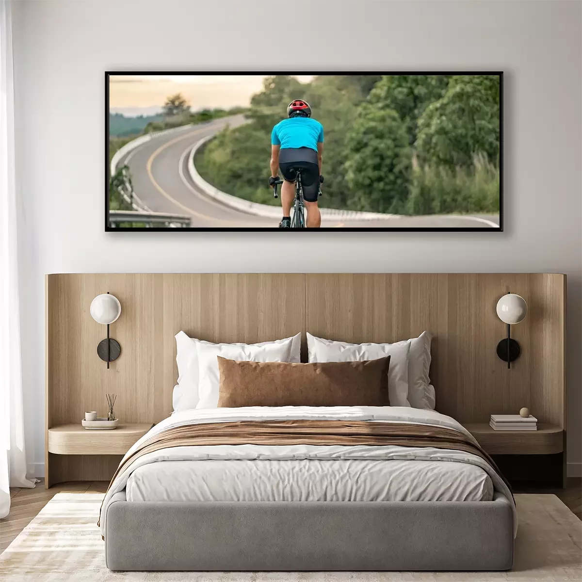 back view of a cyclist on top of a mountains winding road, riding a black bicycle down a hill, wearing bike helmet and blue cycling jersey, with grey clouds sunset sky and forest in the background.