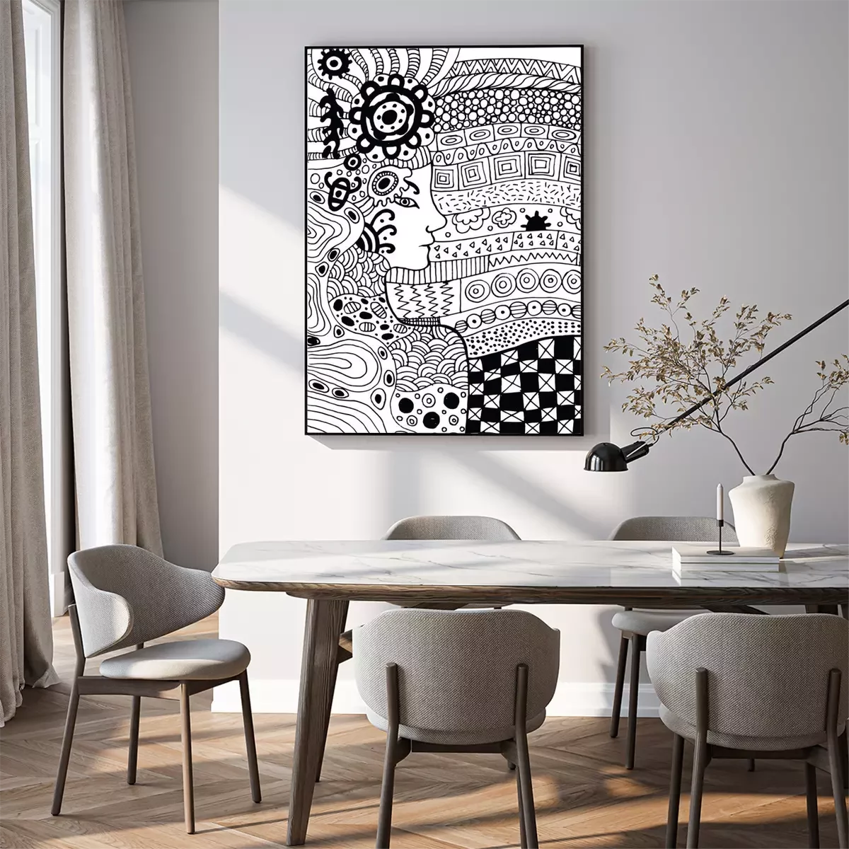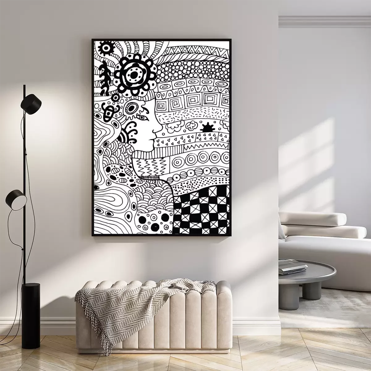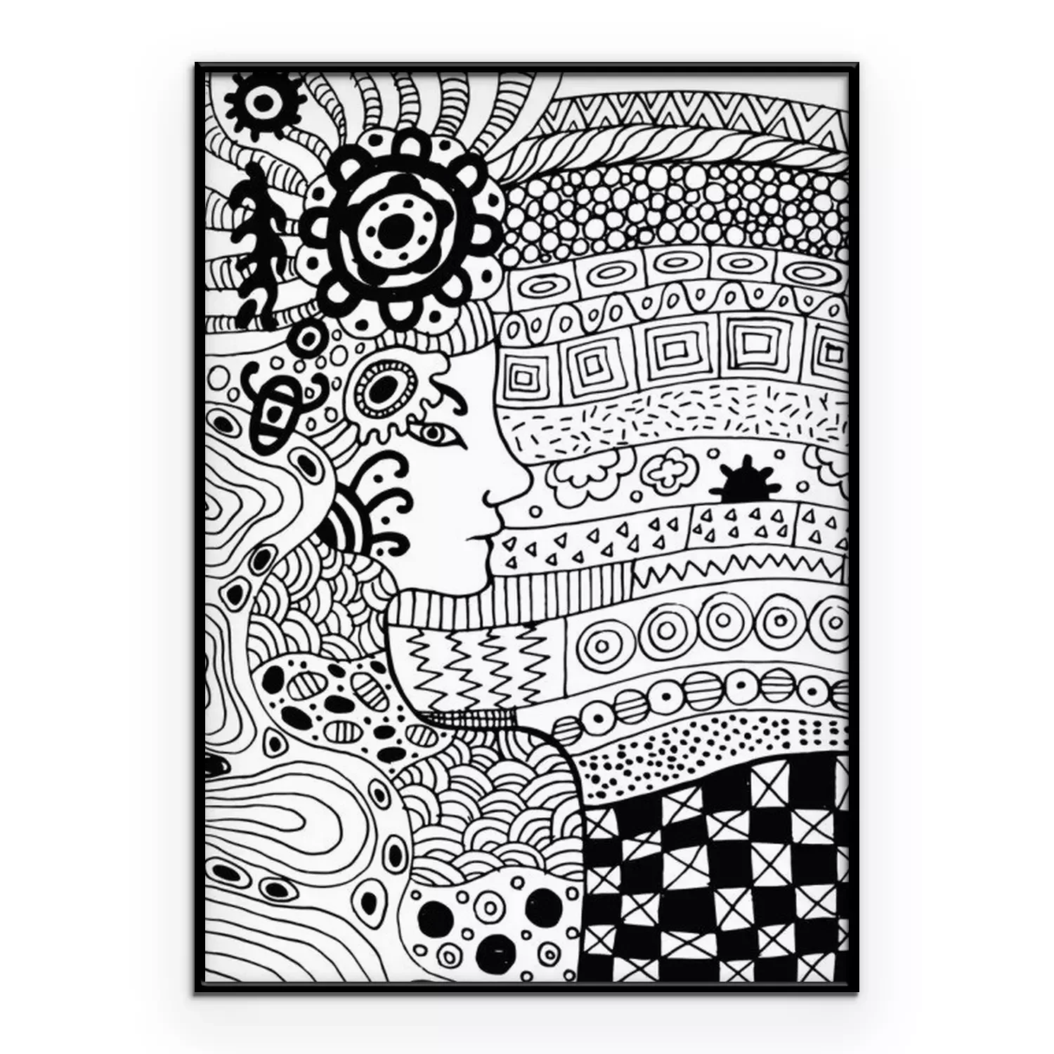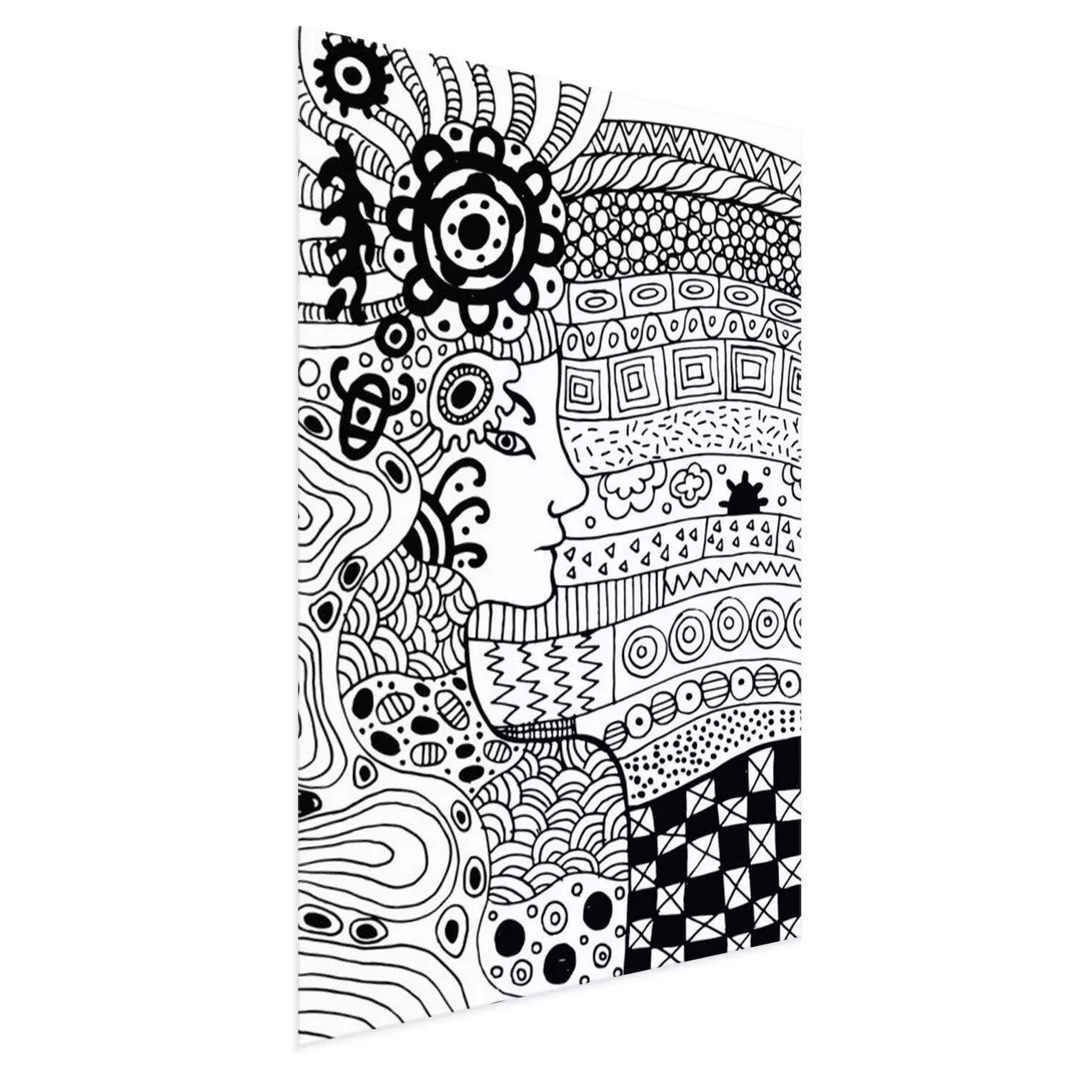 Poster: Een gezicht dat uit zwarte en witte patronen tevoorschijn komt