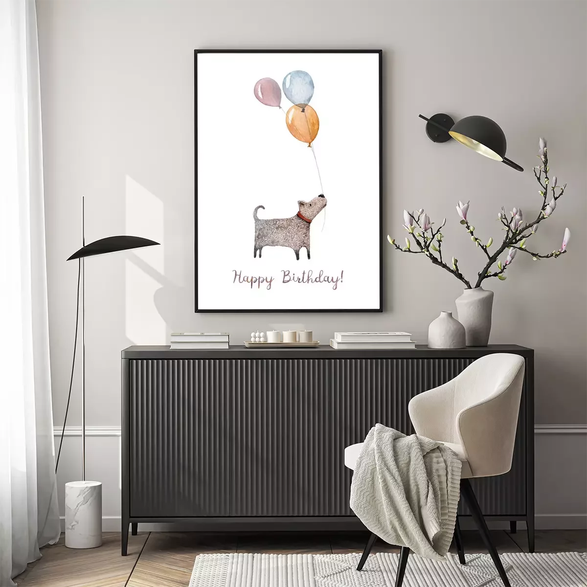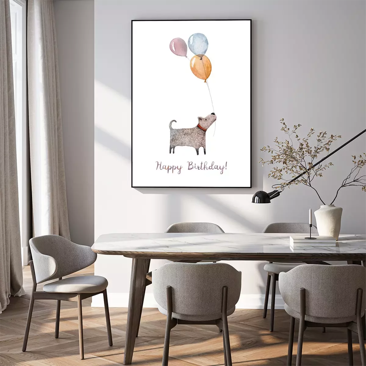 Poster: Een hond met drie kleurrijke ballonnen in zijn bek