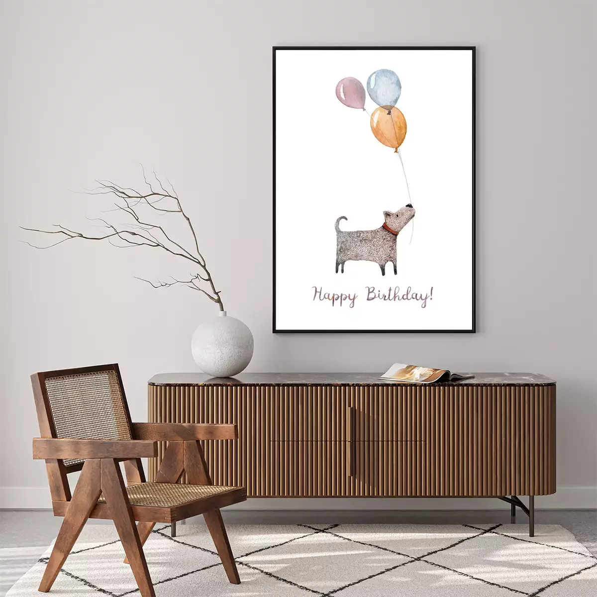 Poster Een hond met drie kleurrijke ballonnen in zijn bek