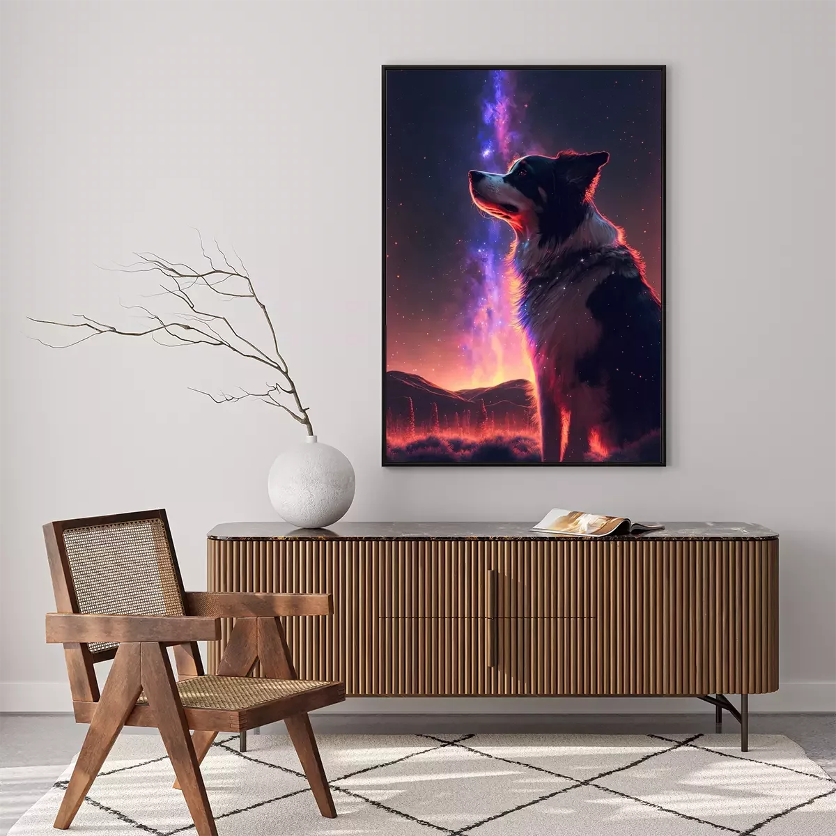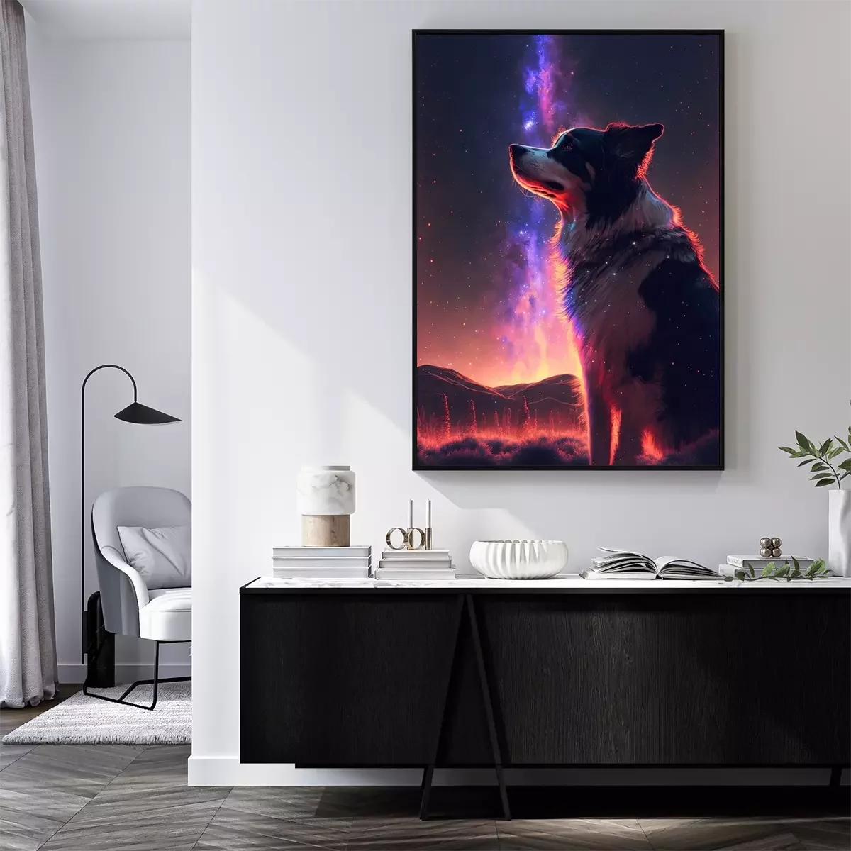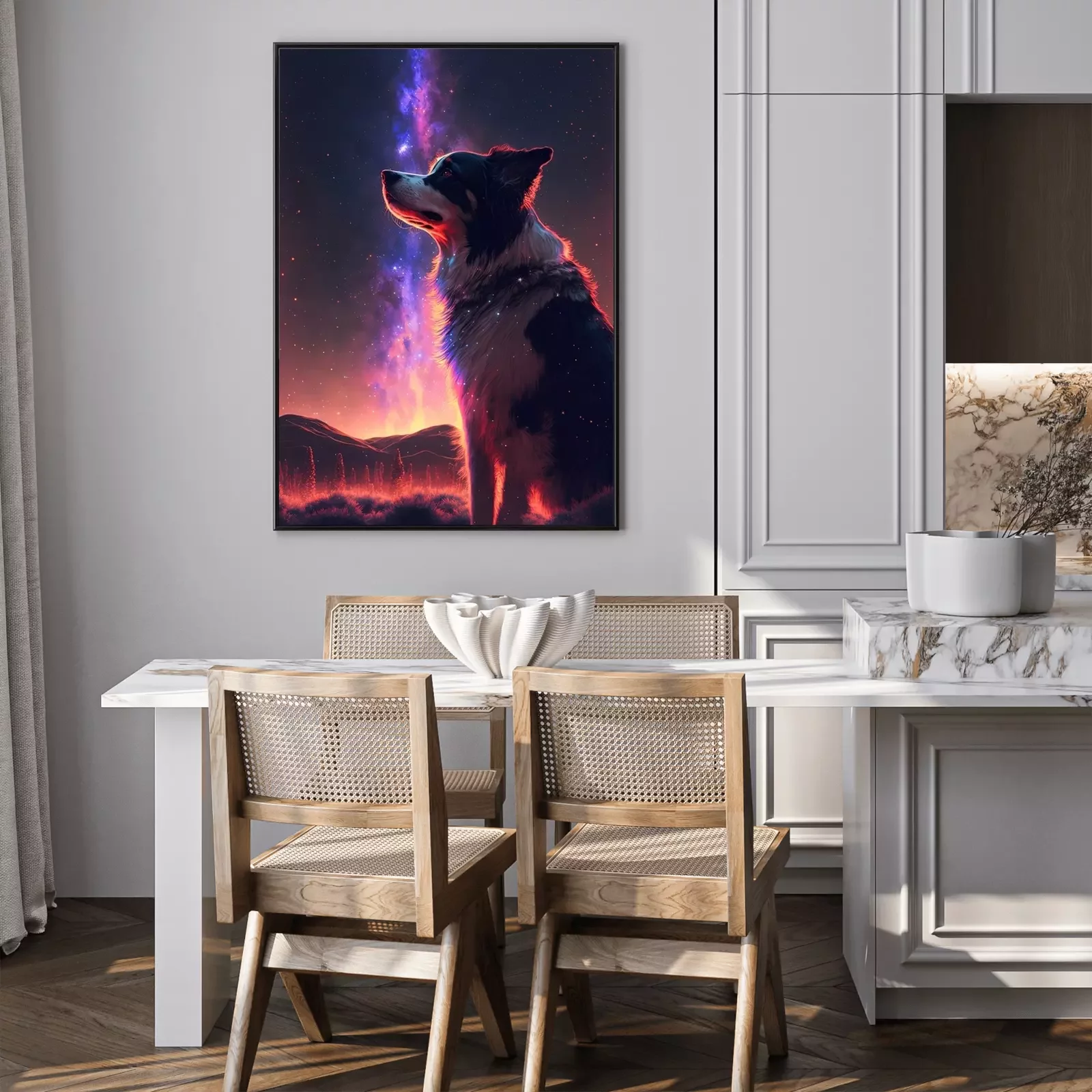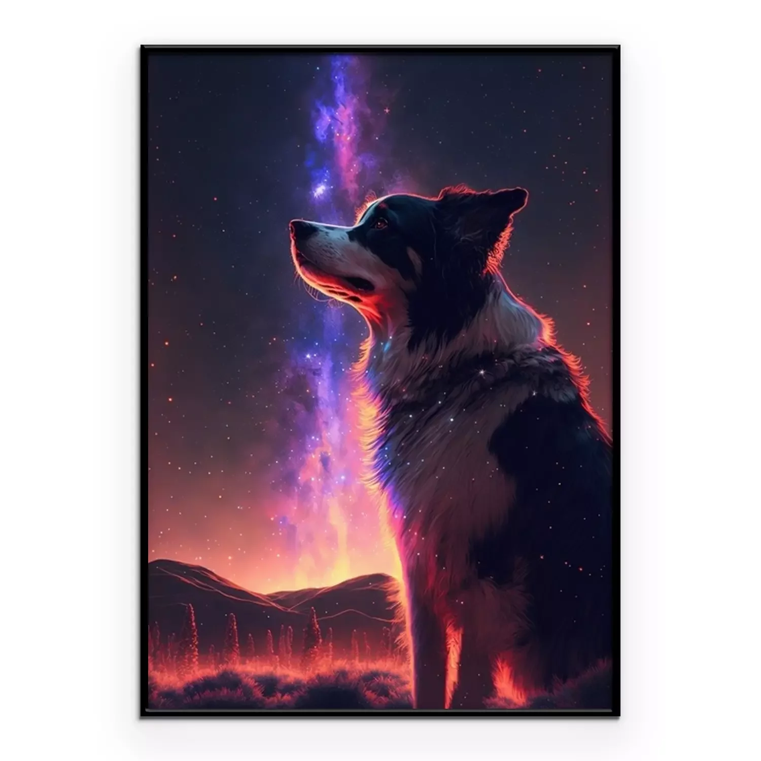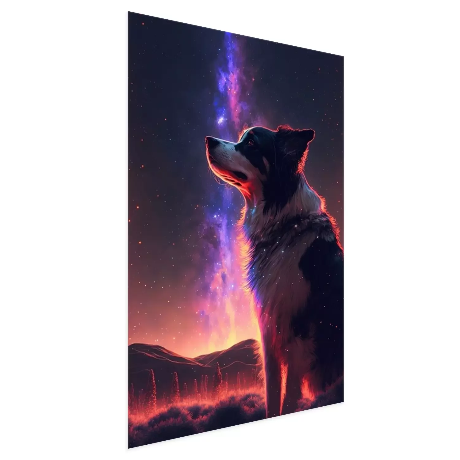 Poster: Een hond tegen de achtergrond van de nachtelijke hemel