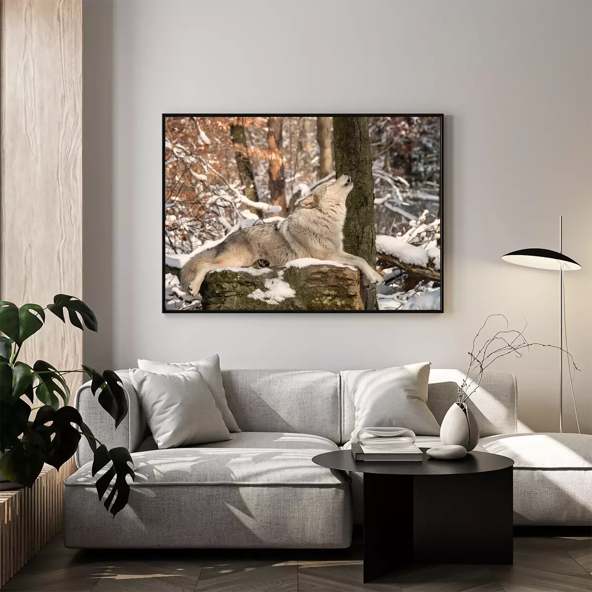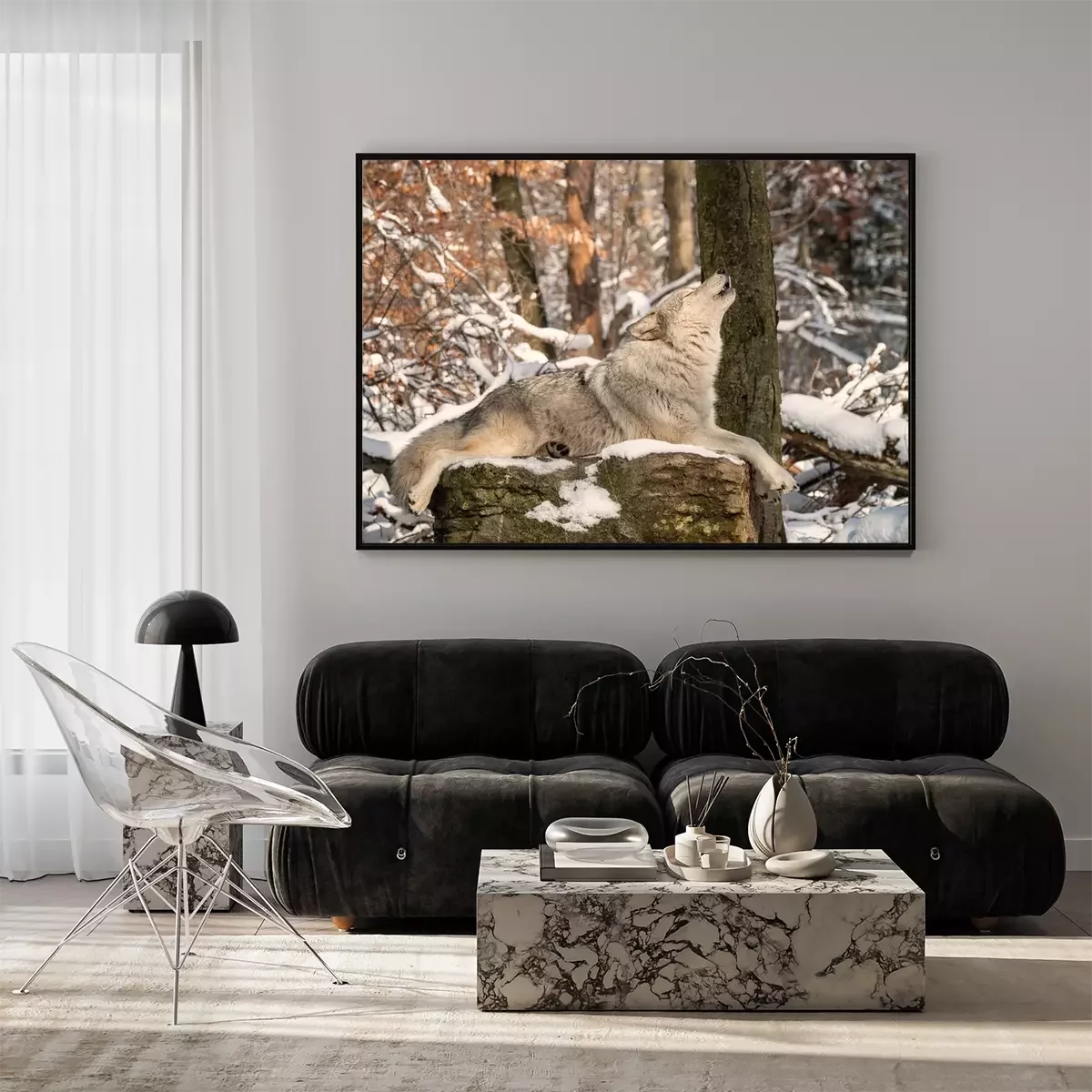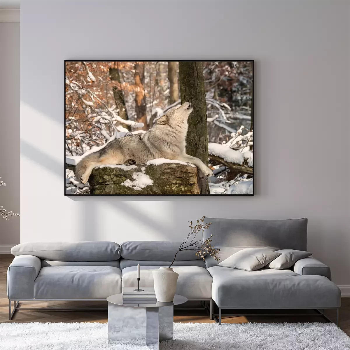 Poster: Een huilende wolf op een rots