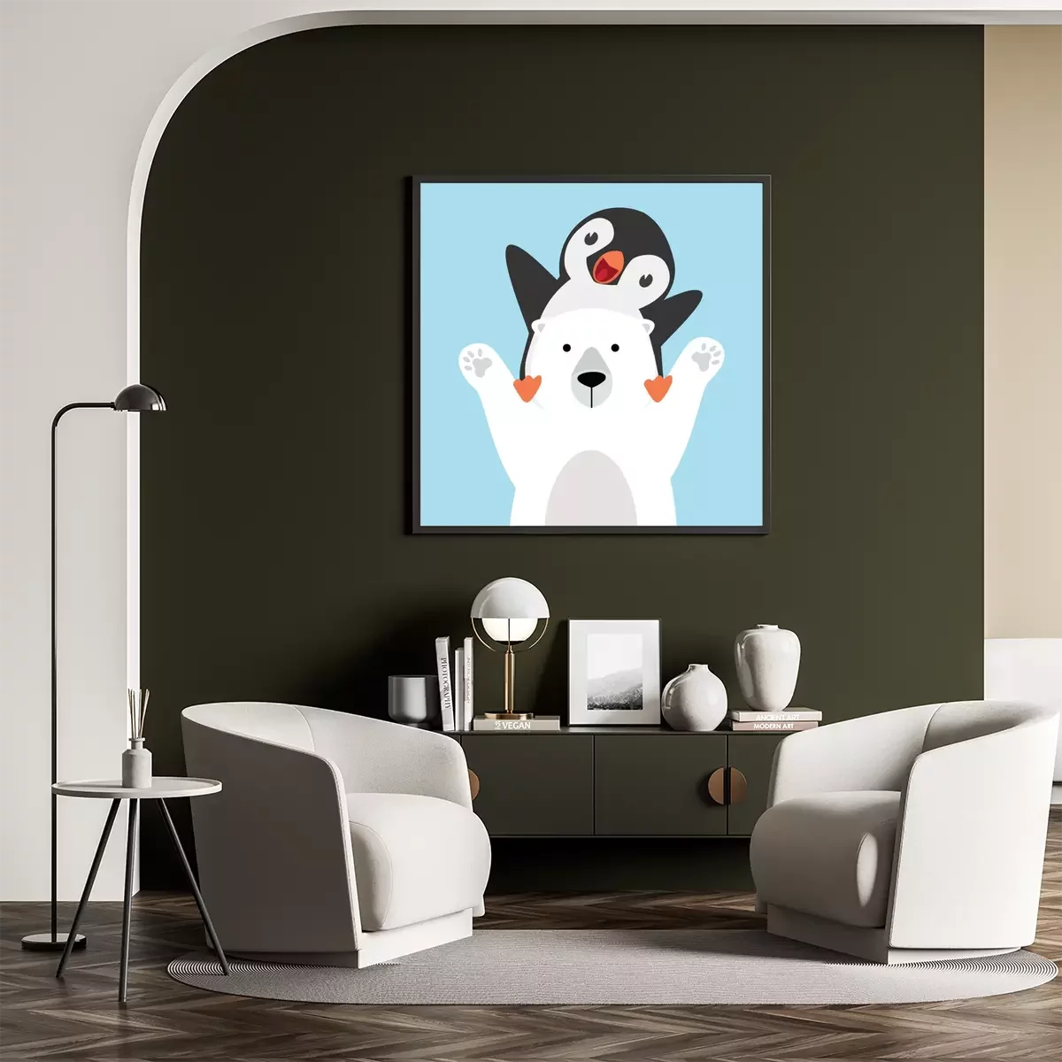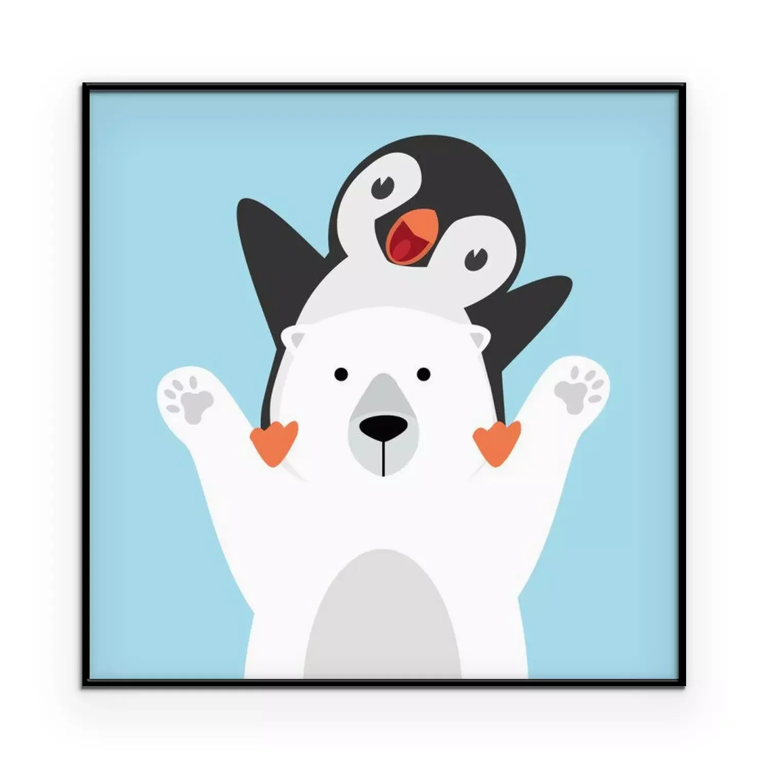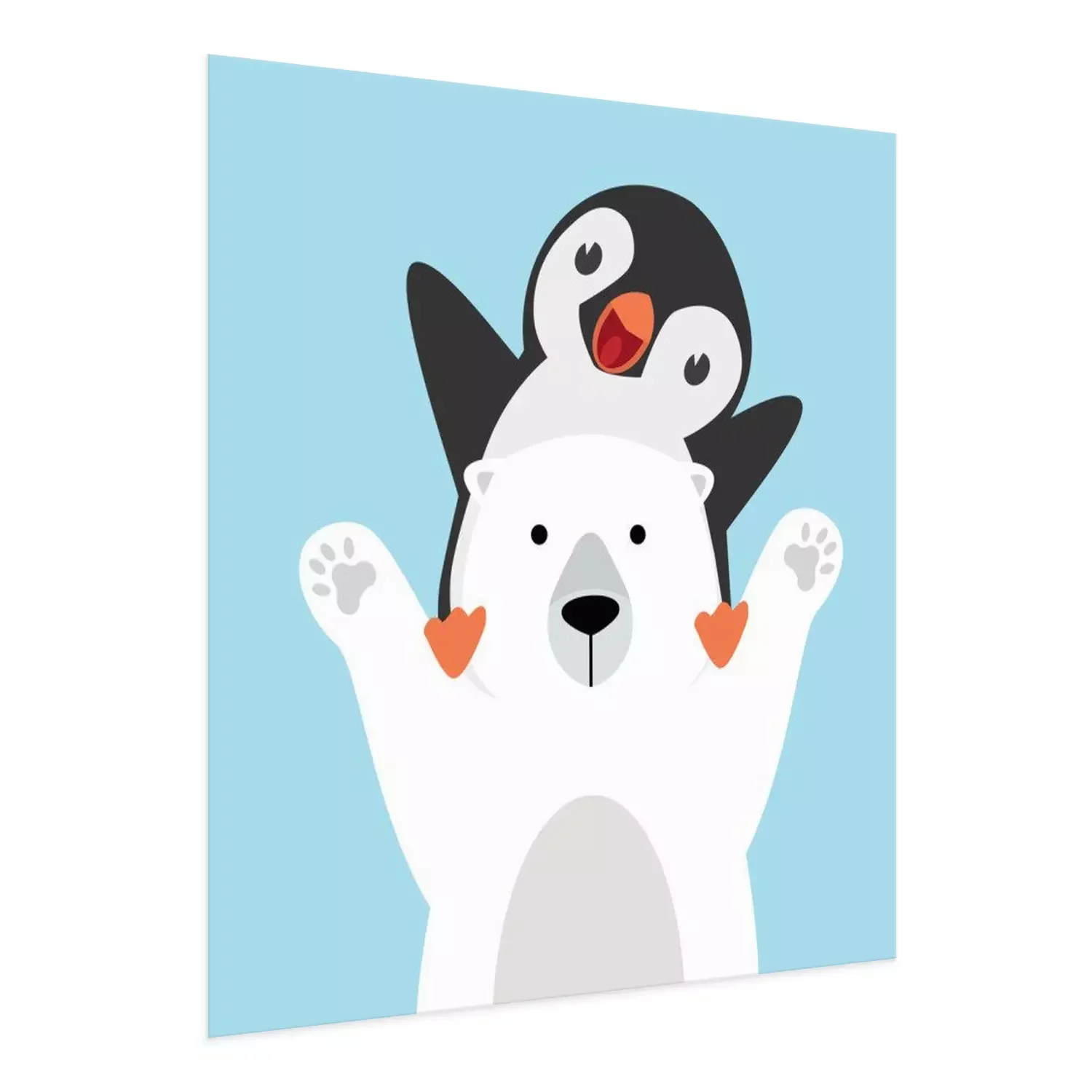Poster: Een ijsbeer met een pinguïn op zijn schouders