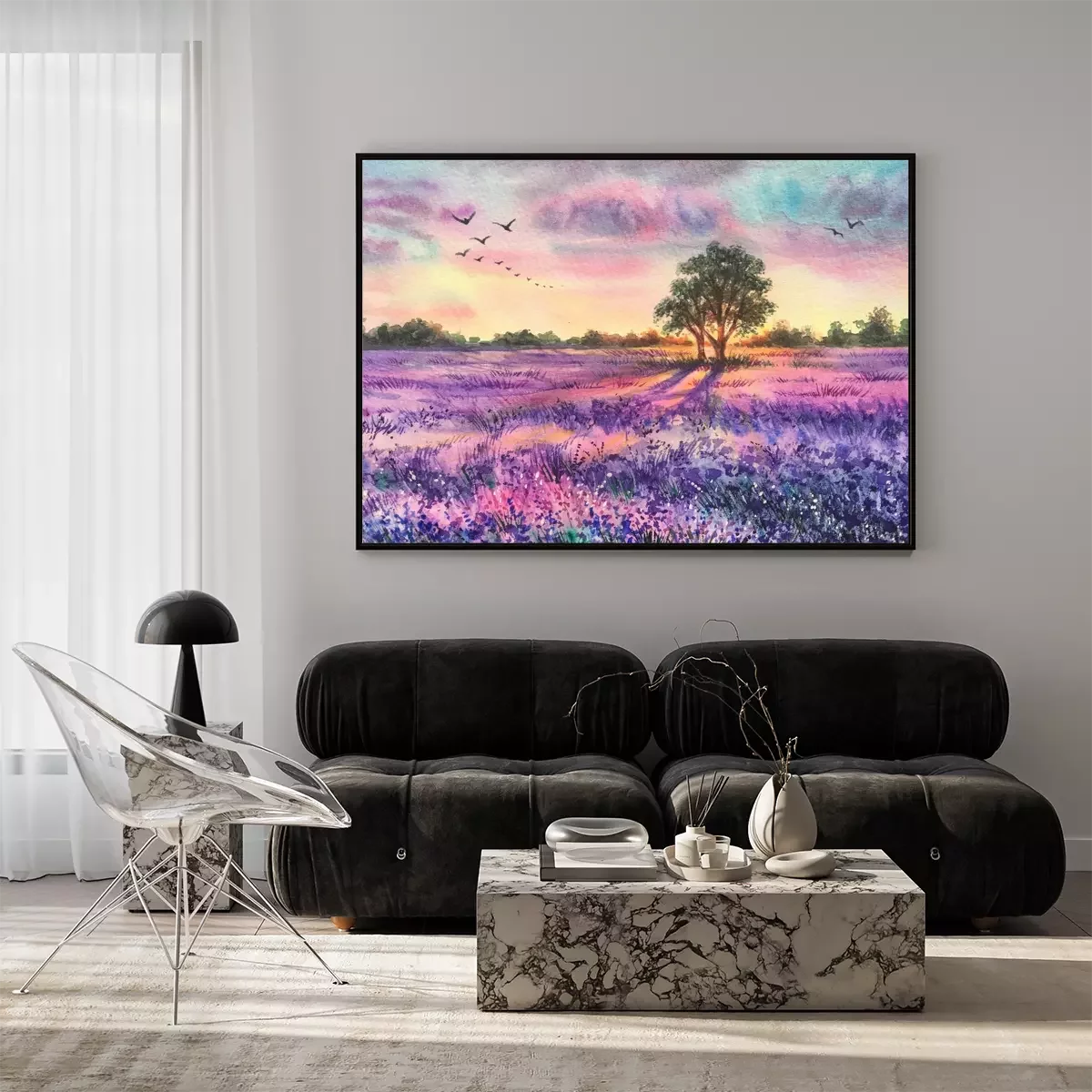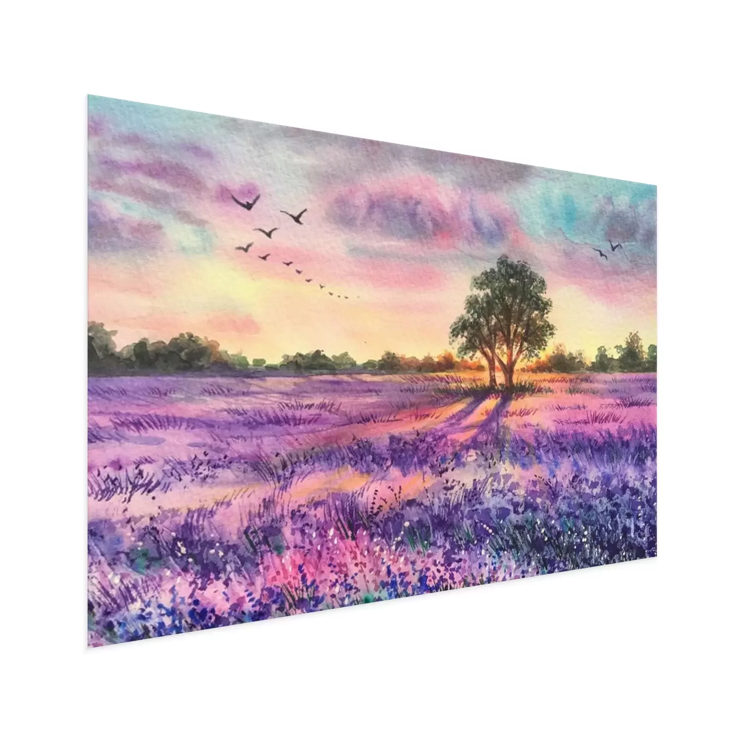 Poster Een lavendelveld op een aquarel schilderij