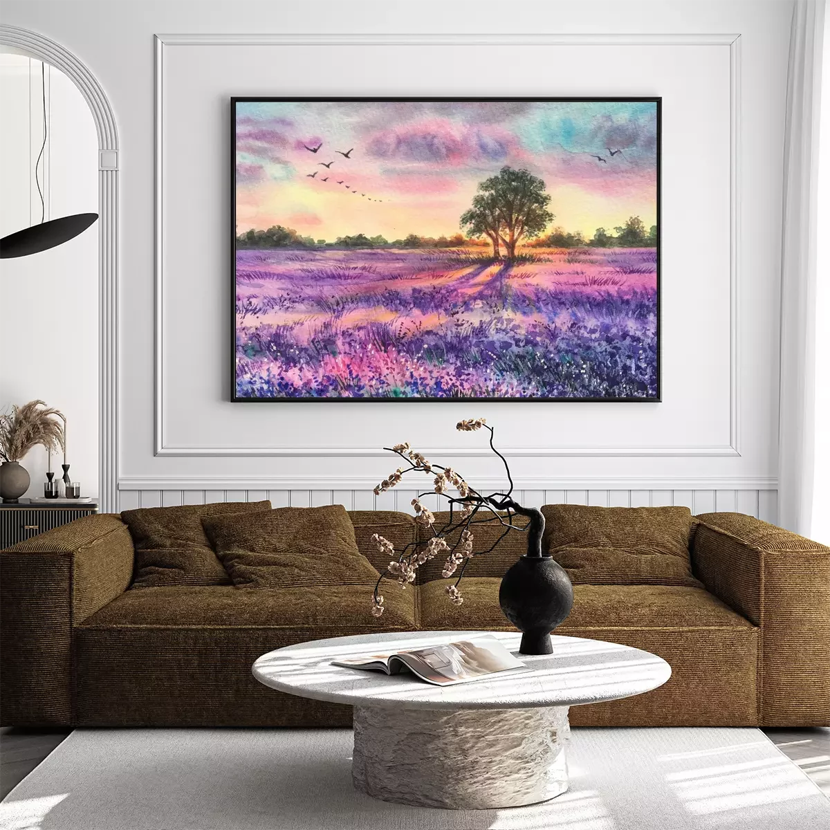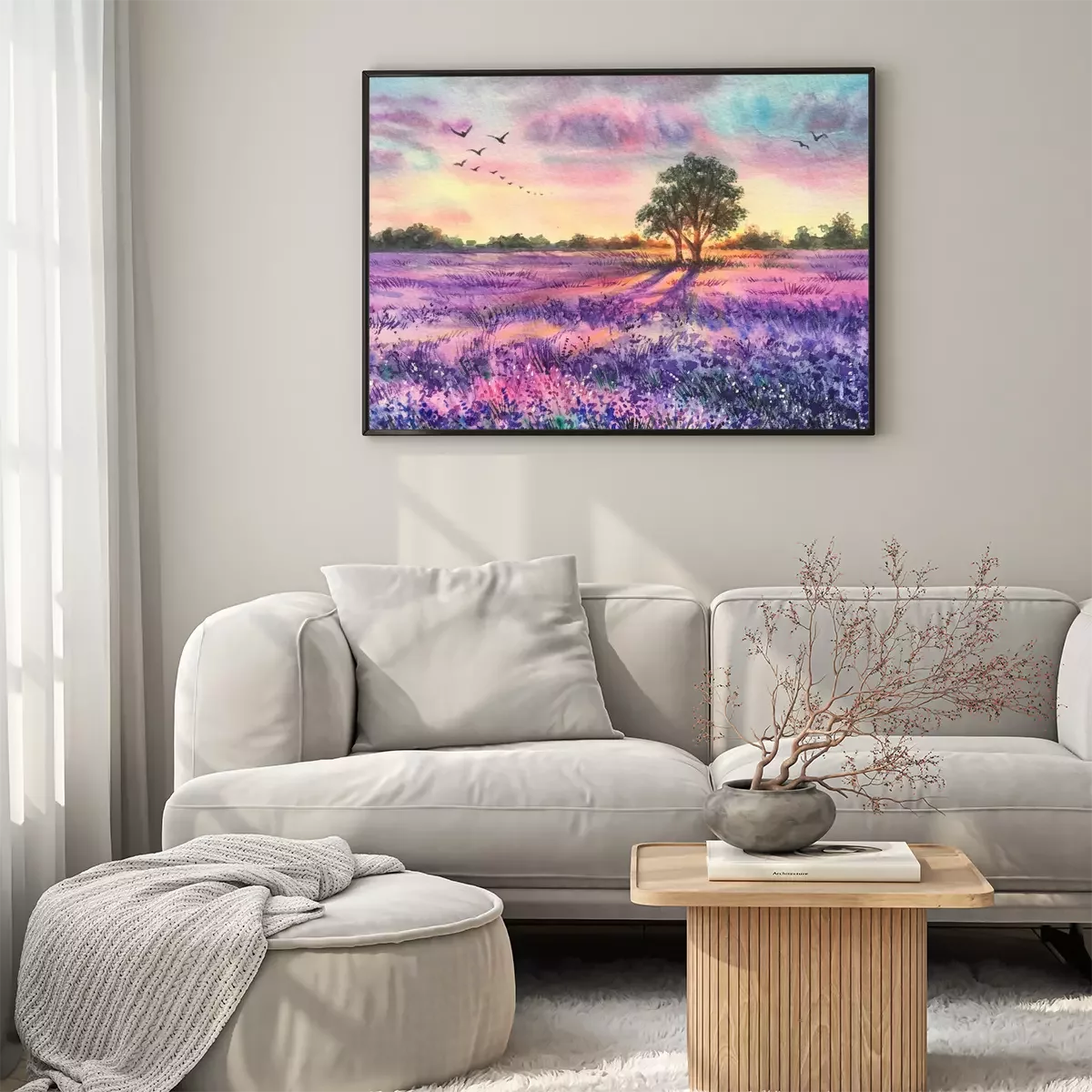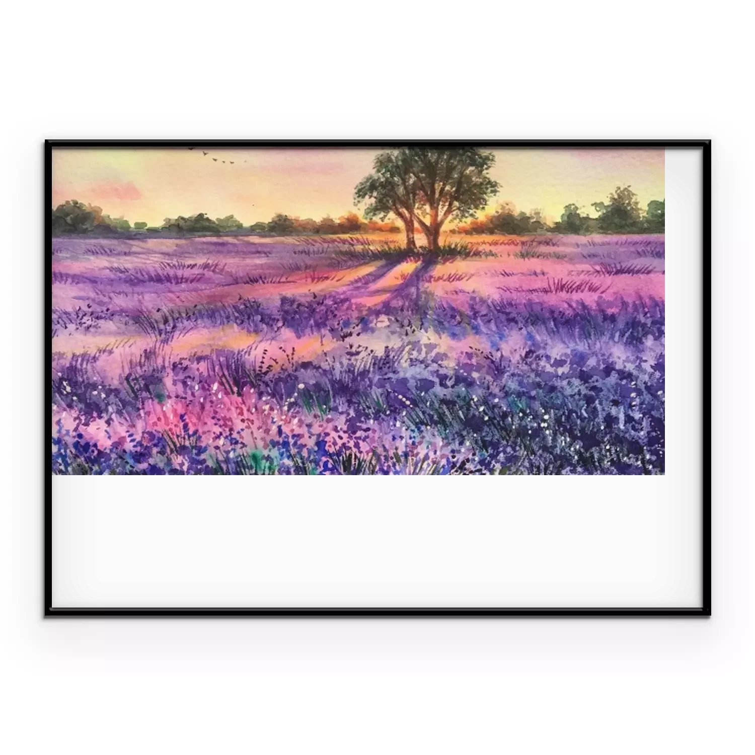 Poster: Een lavendelveld op een aquarel schilderij