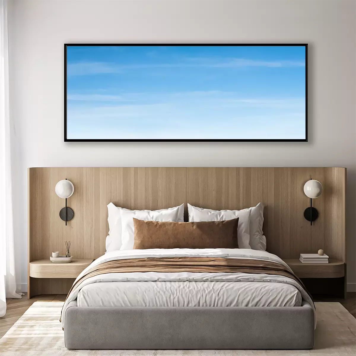 Poster: Een luchtmening als achtergrond van van heldere blauwe hemel en wit vage wolken - panoramische Webbanner
