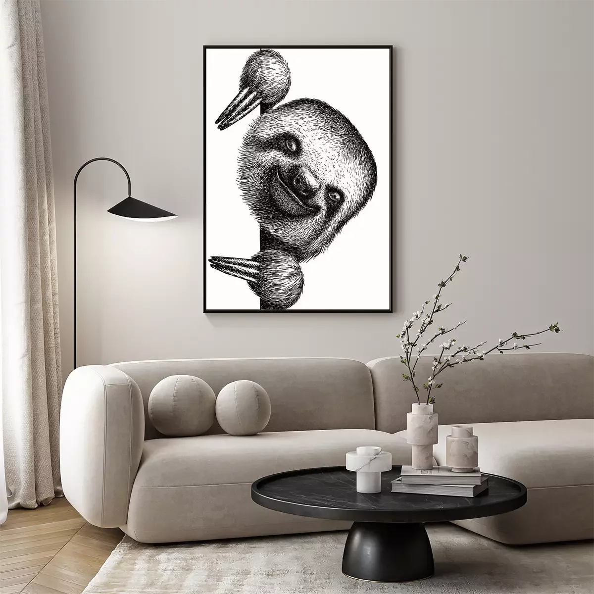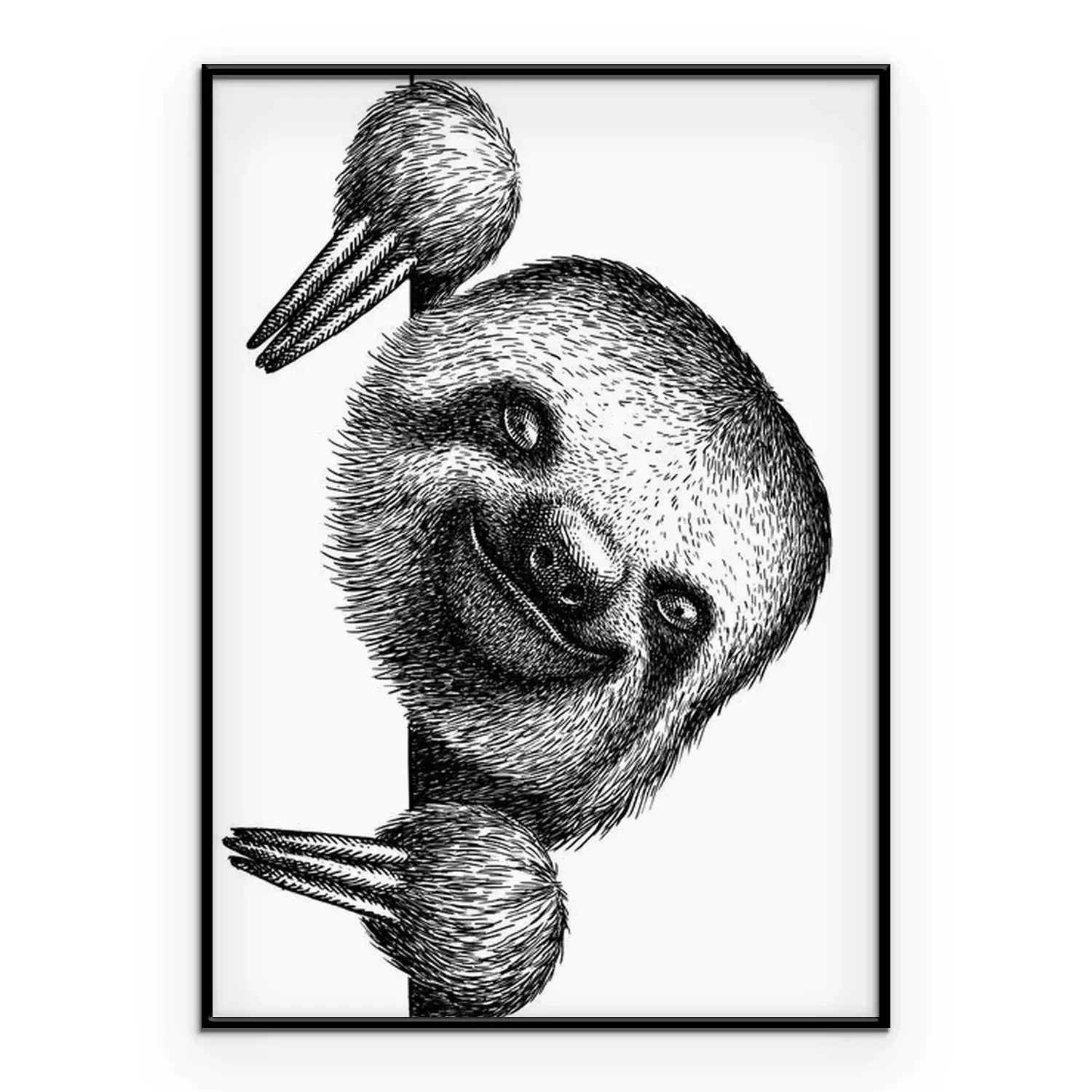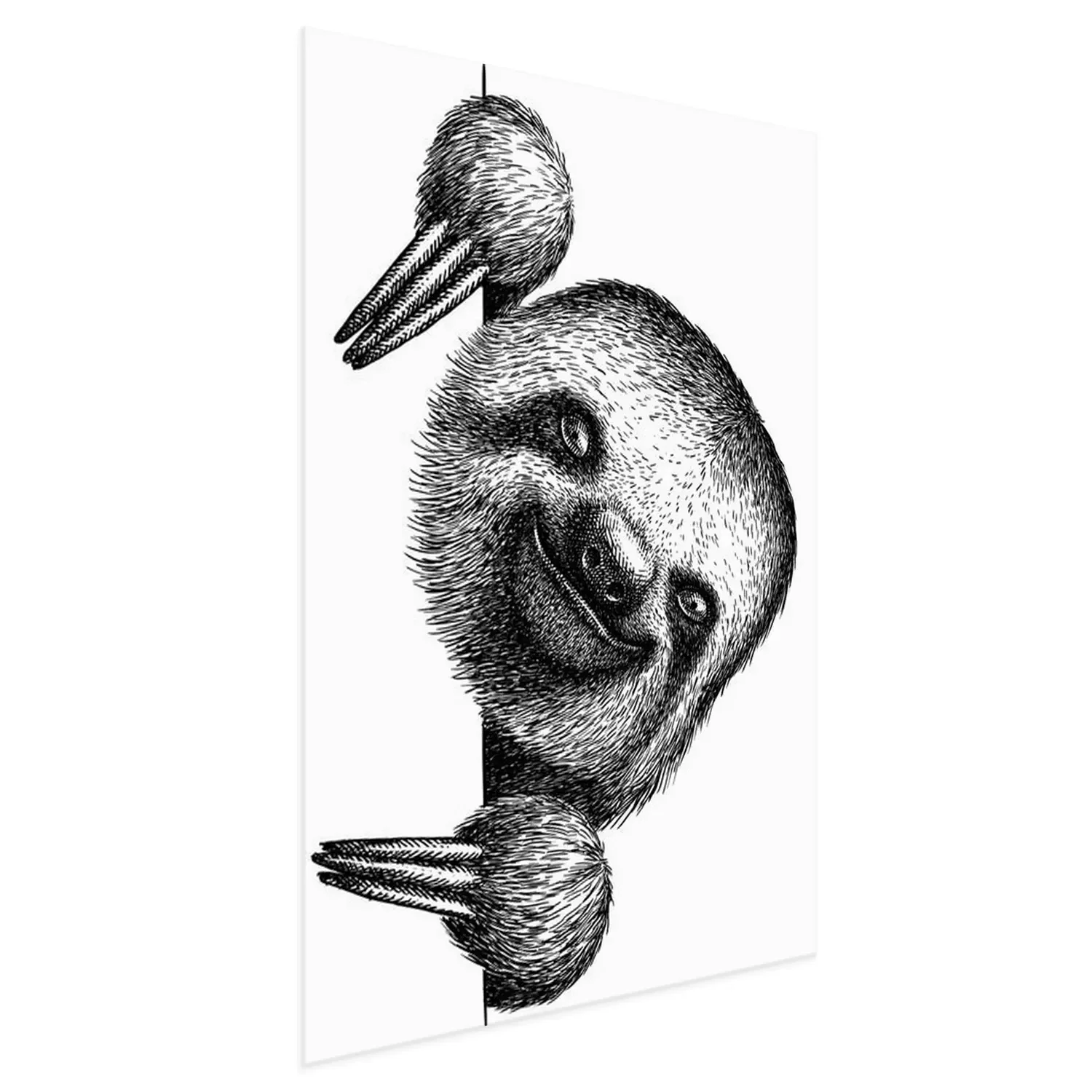 Poster: Een luiaard die achter een boom vandaan gluurt