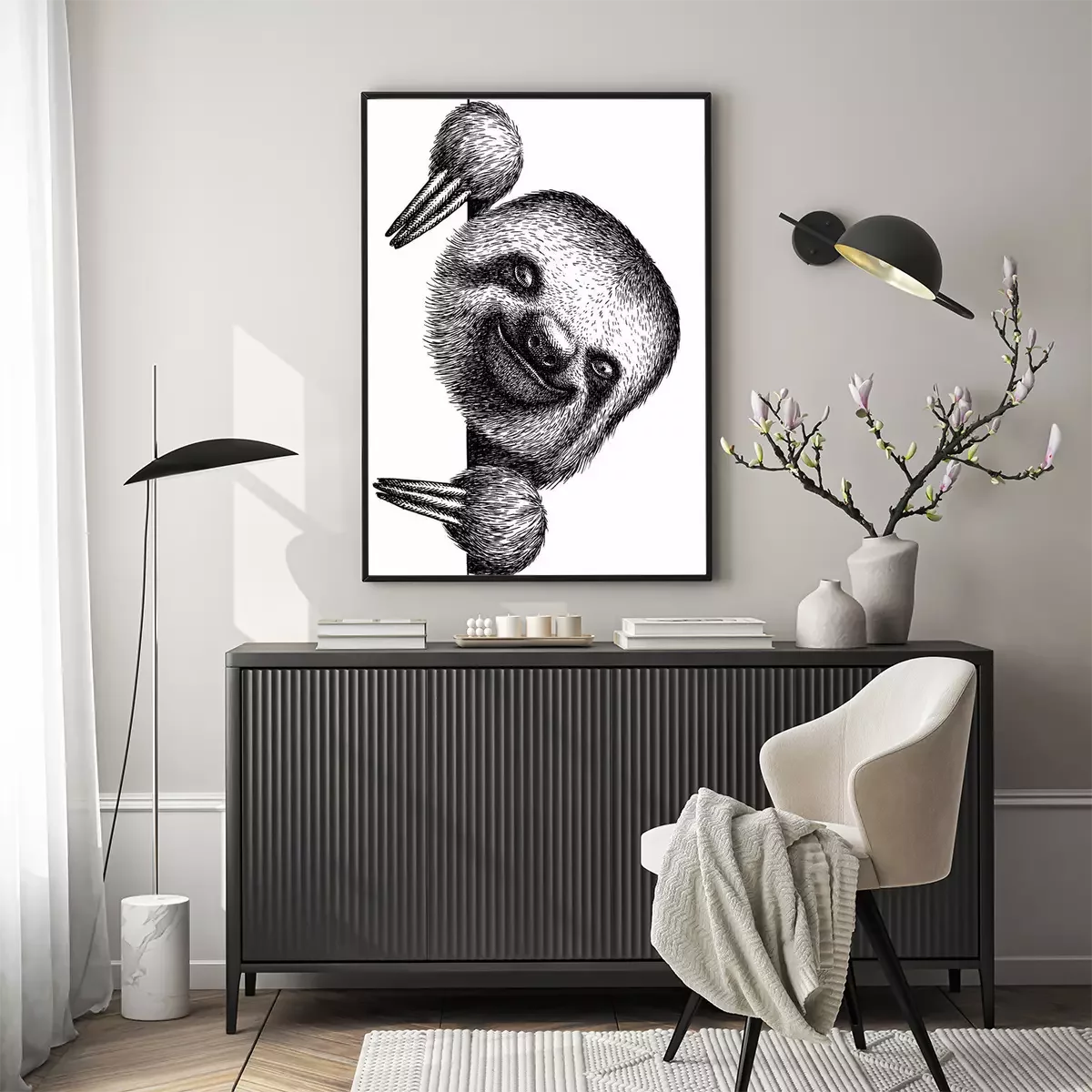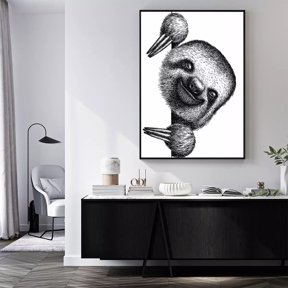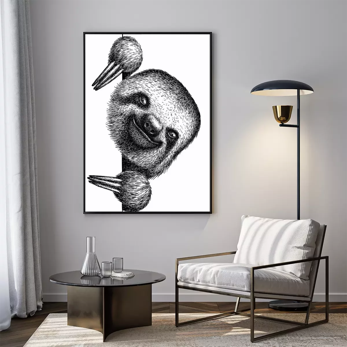 Poster: Een luiaard die achter een boom vandaan gluurt