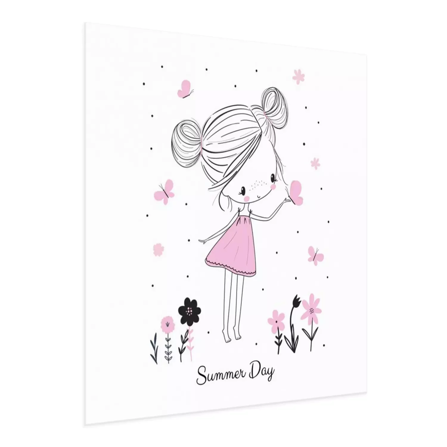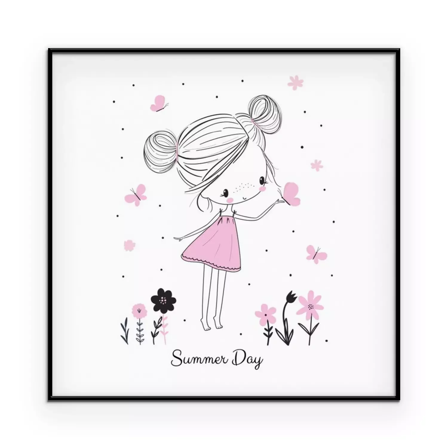 Poster: Een meisje in een roze jurk en een vlinder vliegt naar haar toe