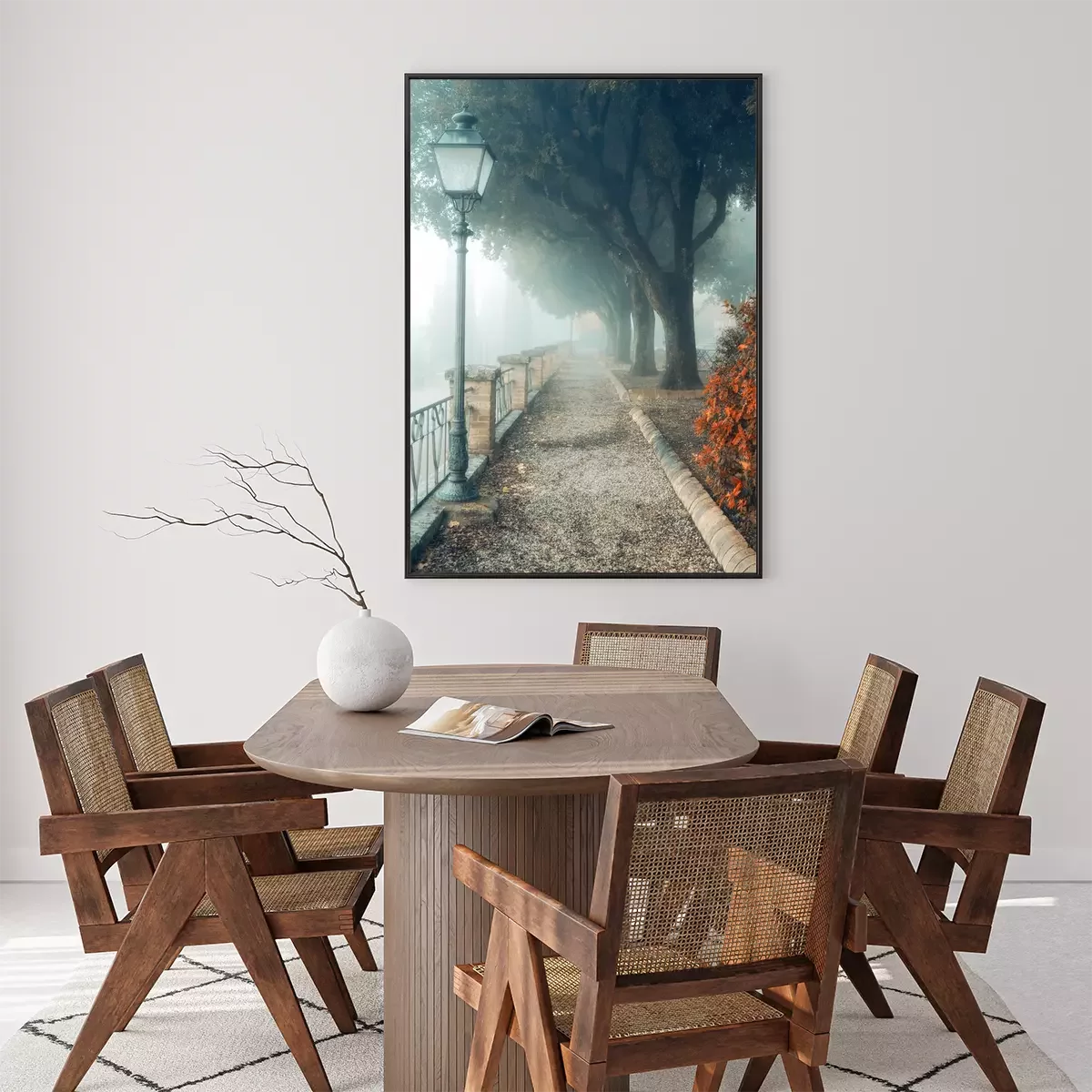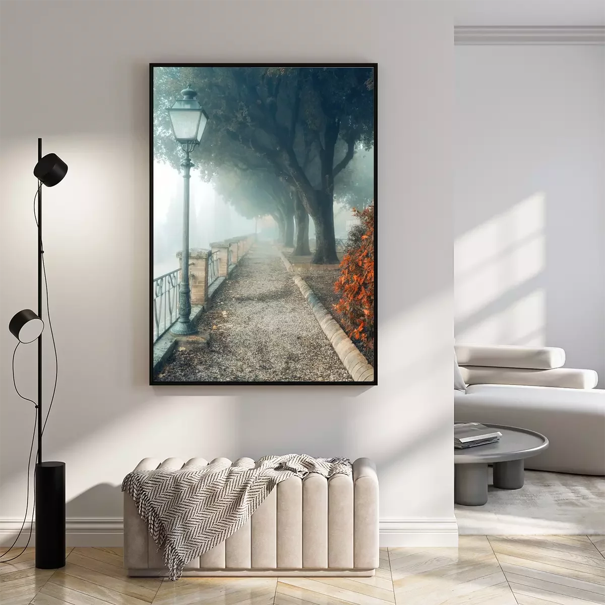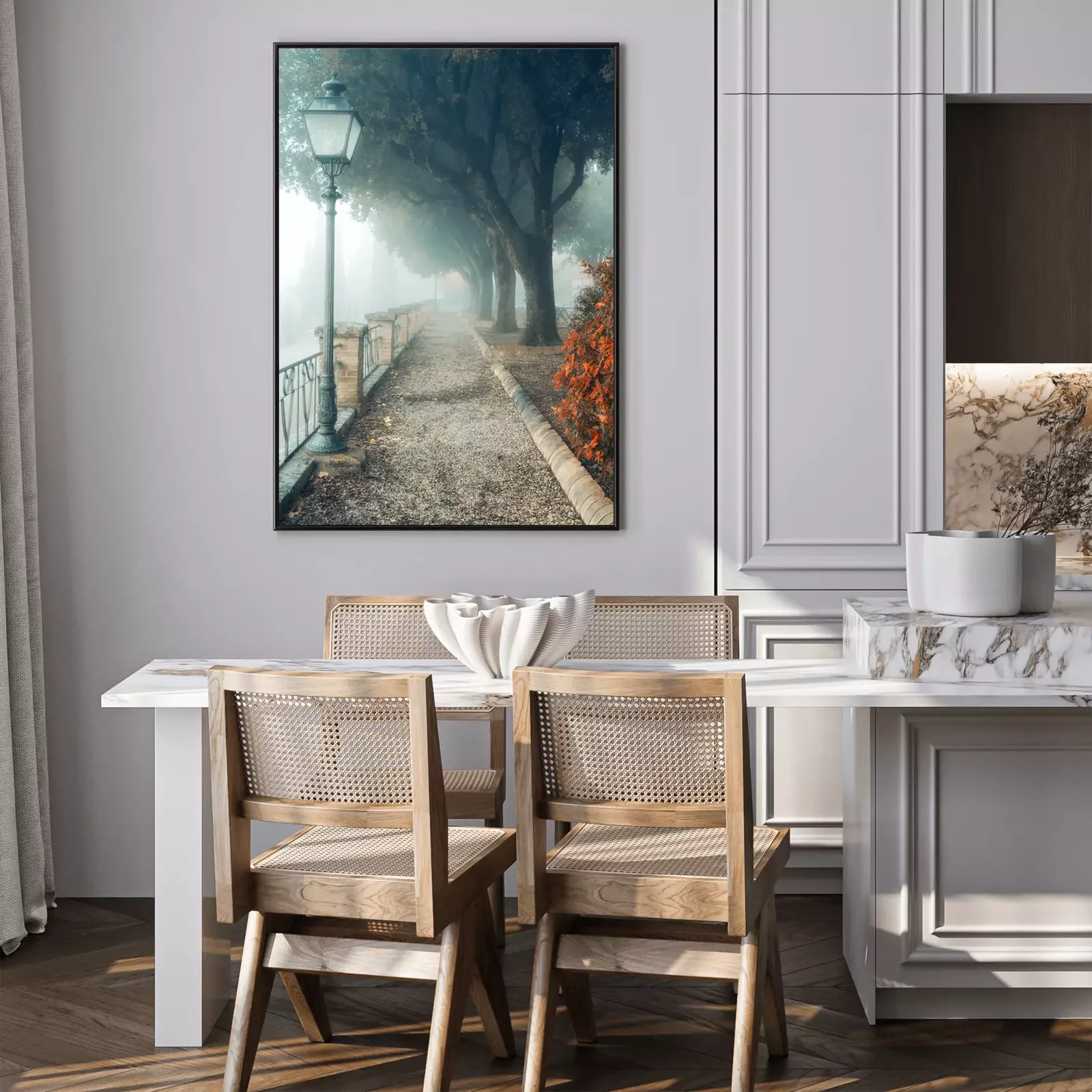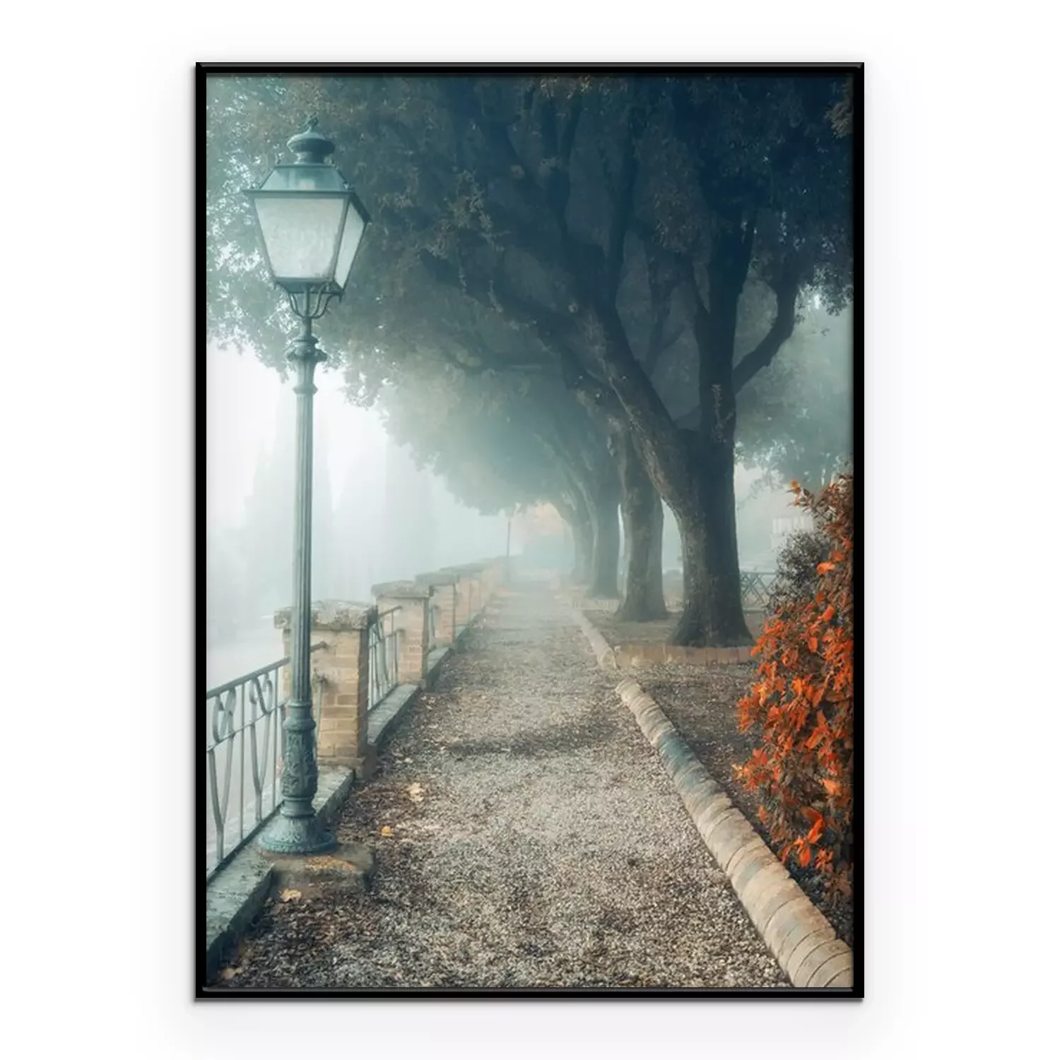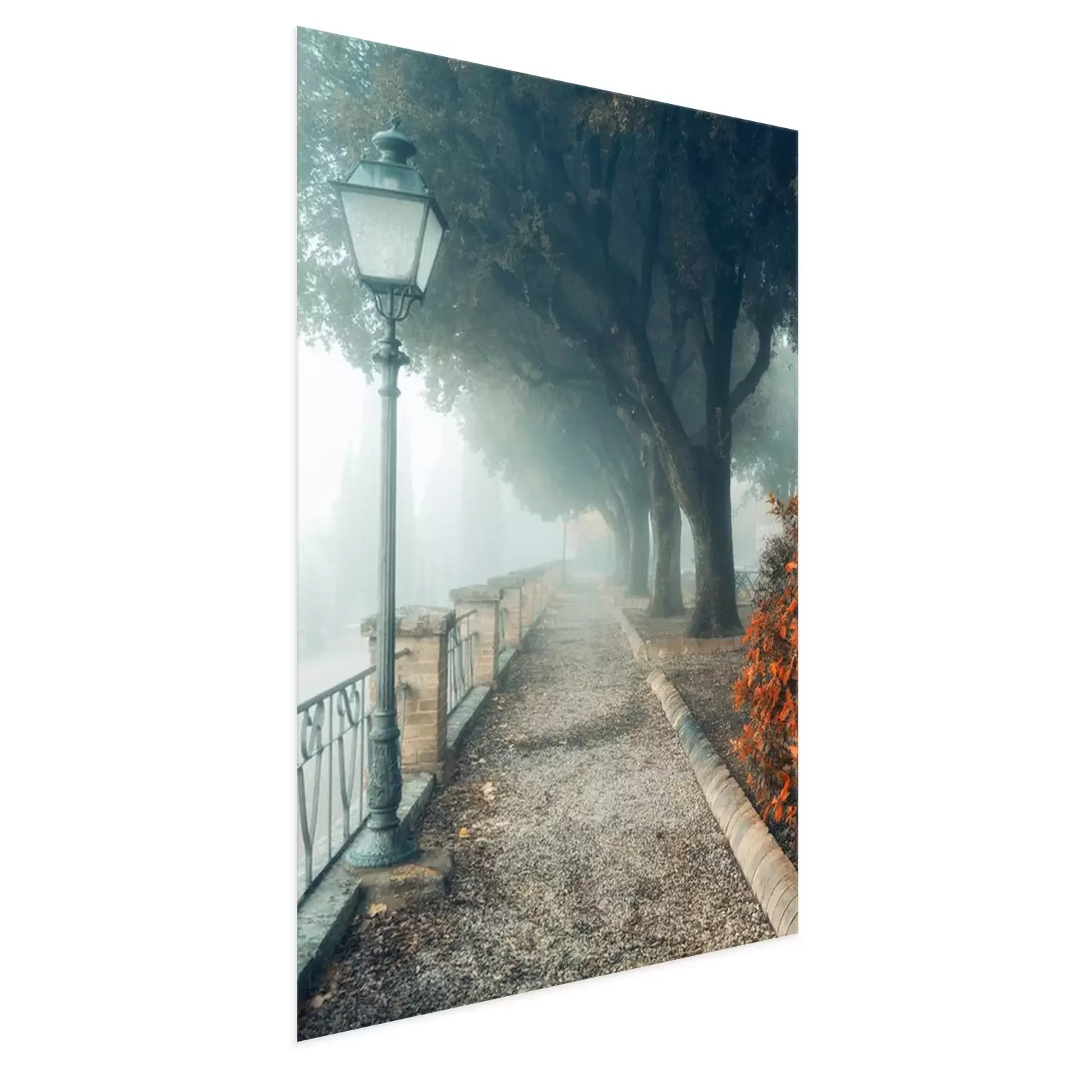 Poster: Een mistige ochtend herfst landschap, een oud park mistige steegje. Geweldige eik steegje