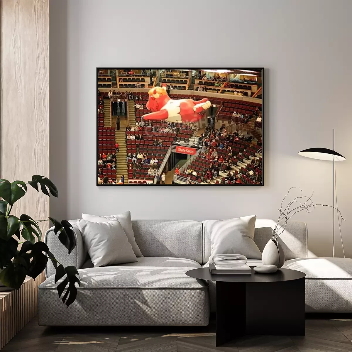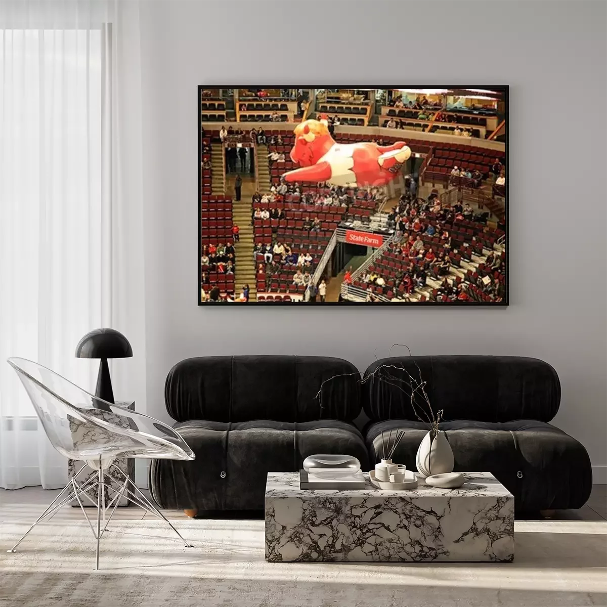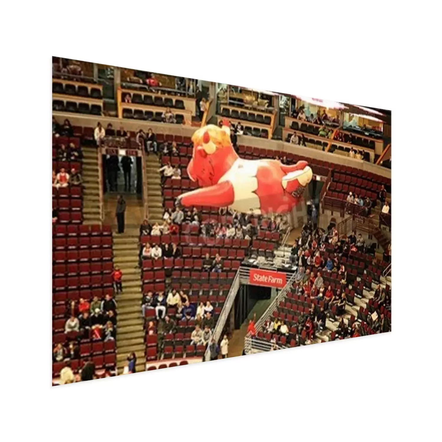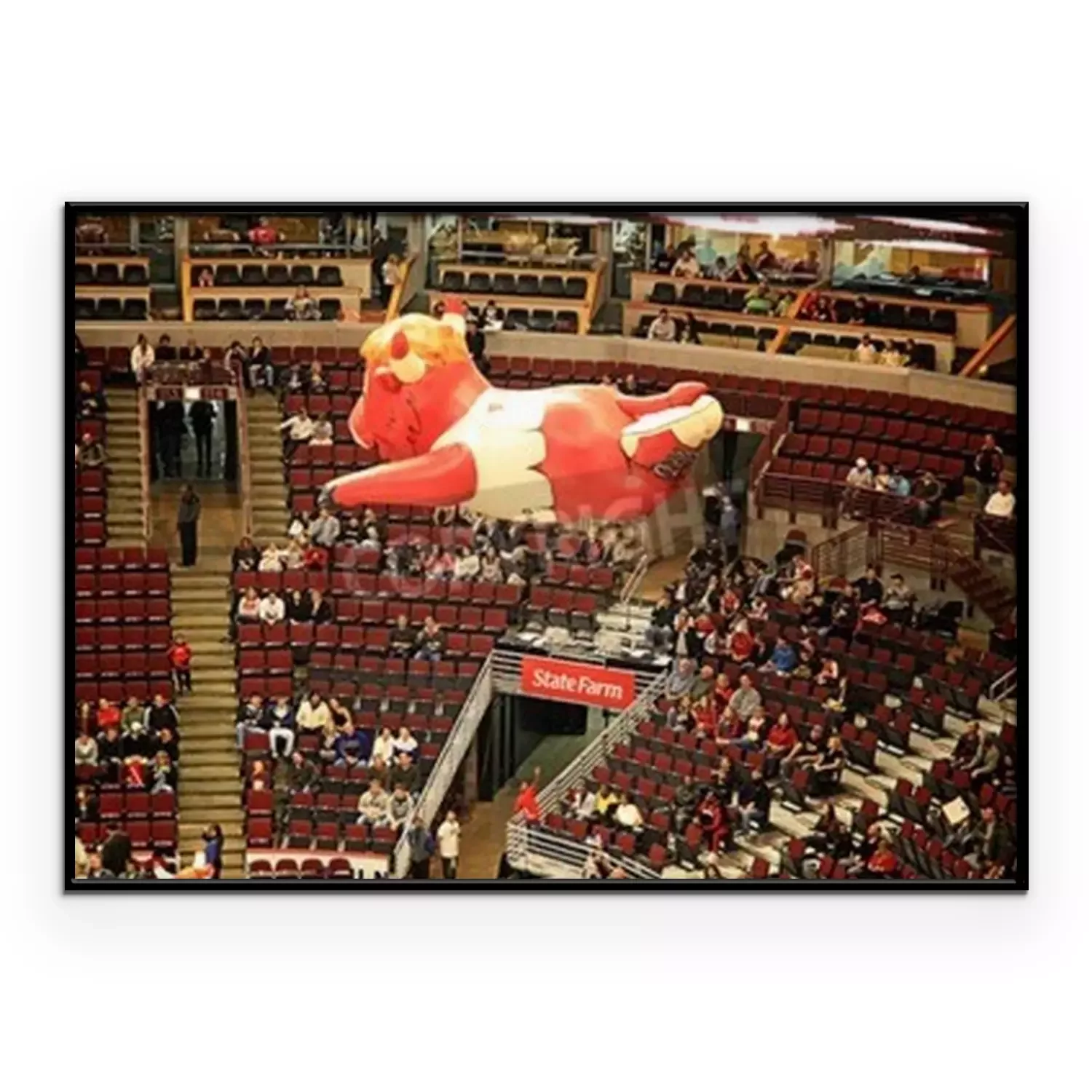 Poster: Een opblaasbare ballon van Benny de Stier, Algemeen bekend als Benny, de officiële mascotte van de Chicago Bulls van de National Basketball Association, zweefde over NBA United Center, Chicago, Vereni