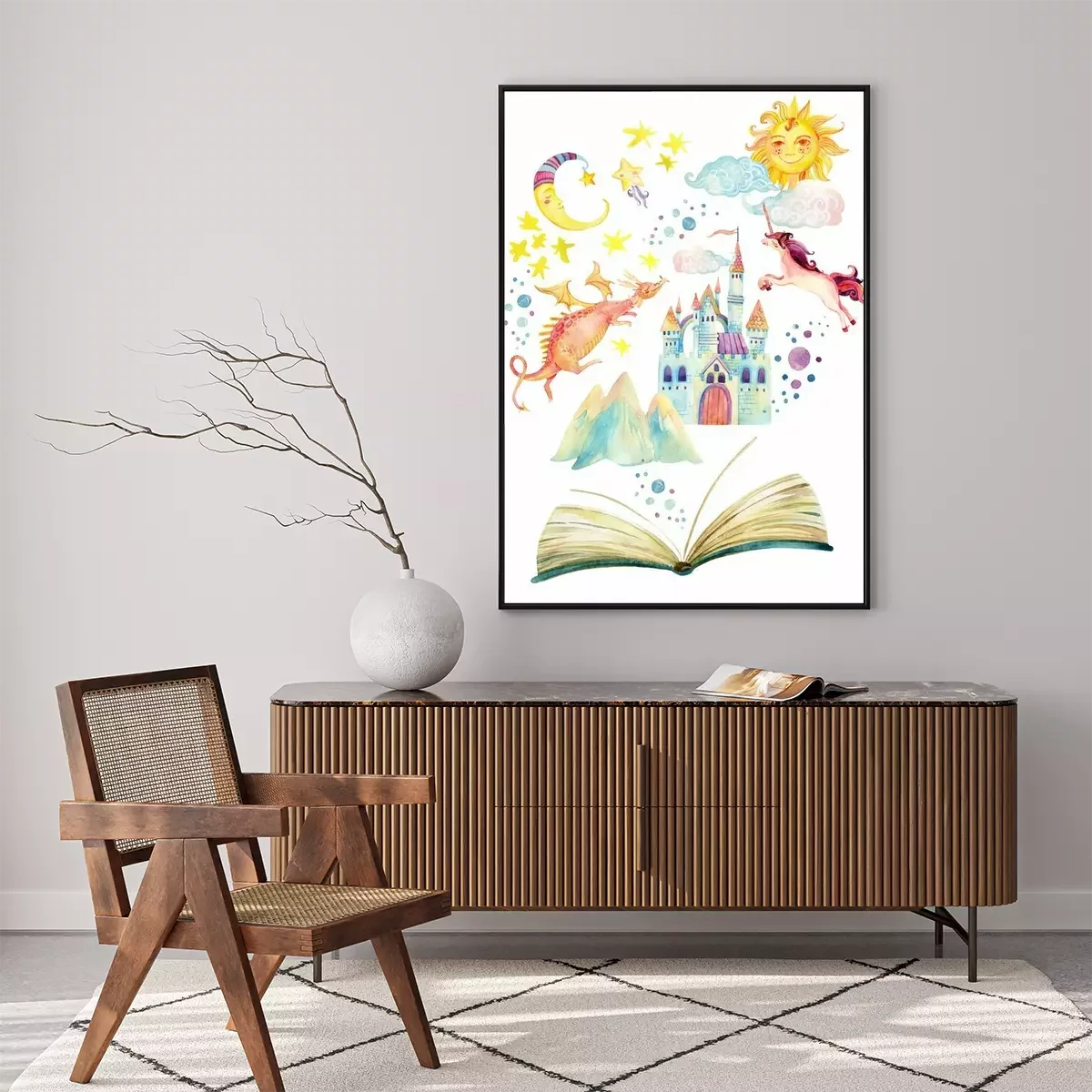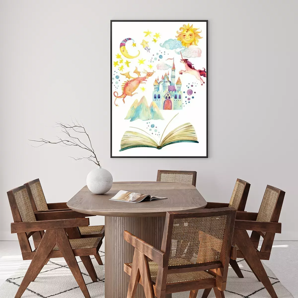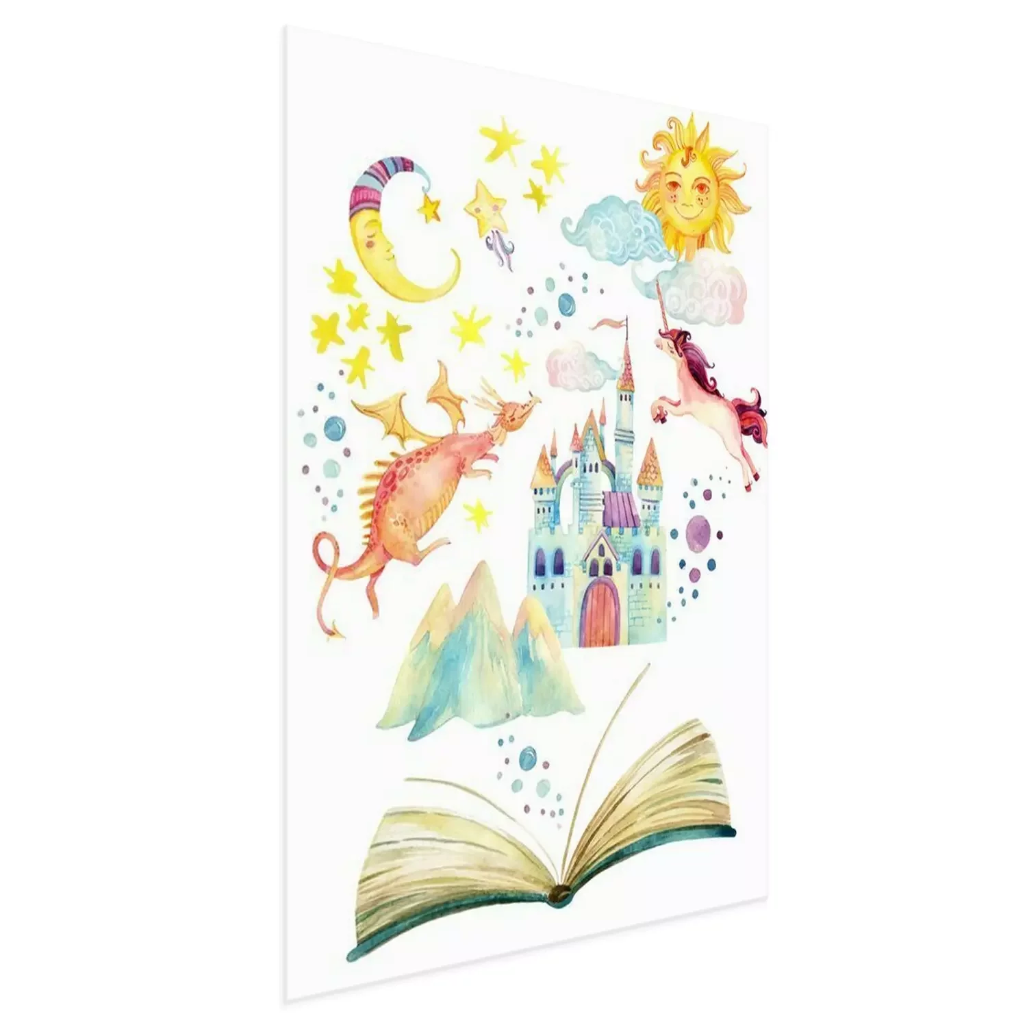 Poster Een opengeslagen boek en sprookjesfiguren die eruit tevoorschijn komen