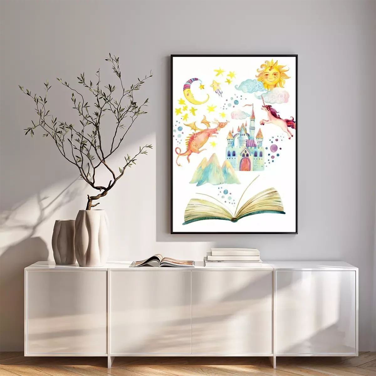 Poster: Een opengeslagen boek en sprookjesfiguren die eruit tevoorschijn komen