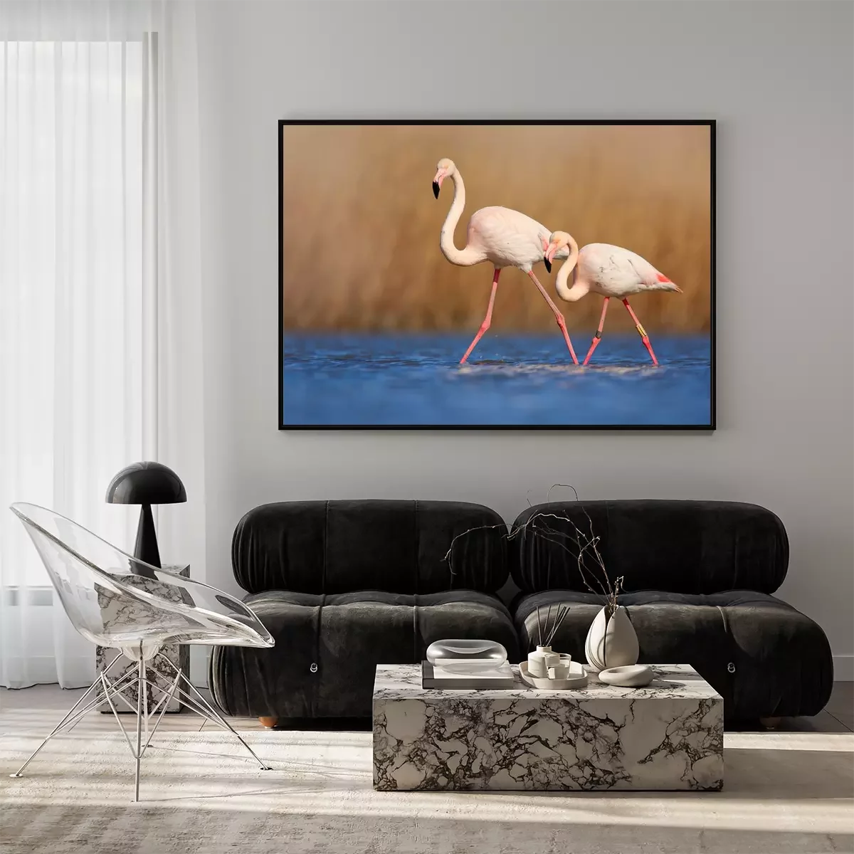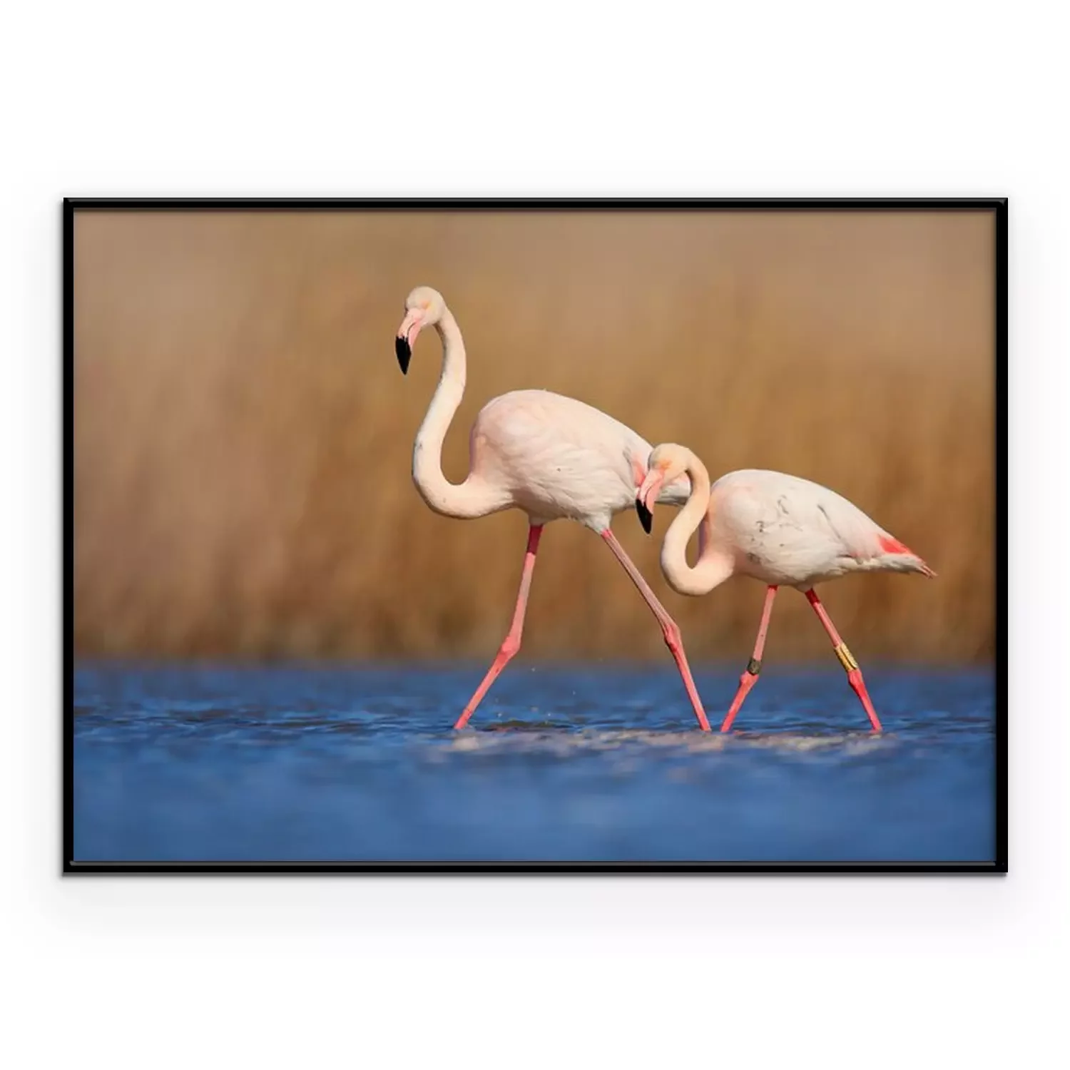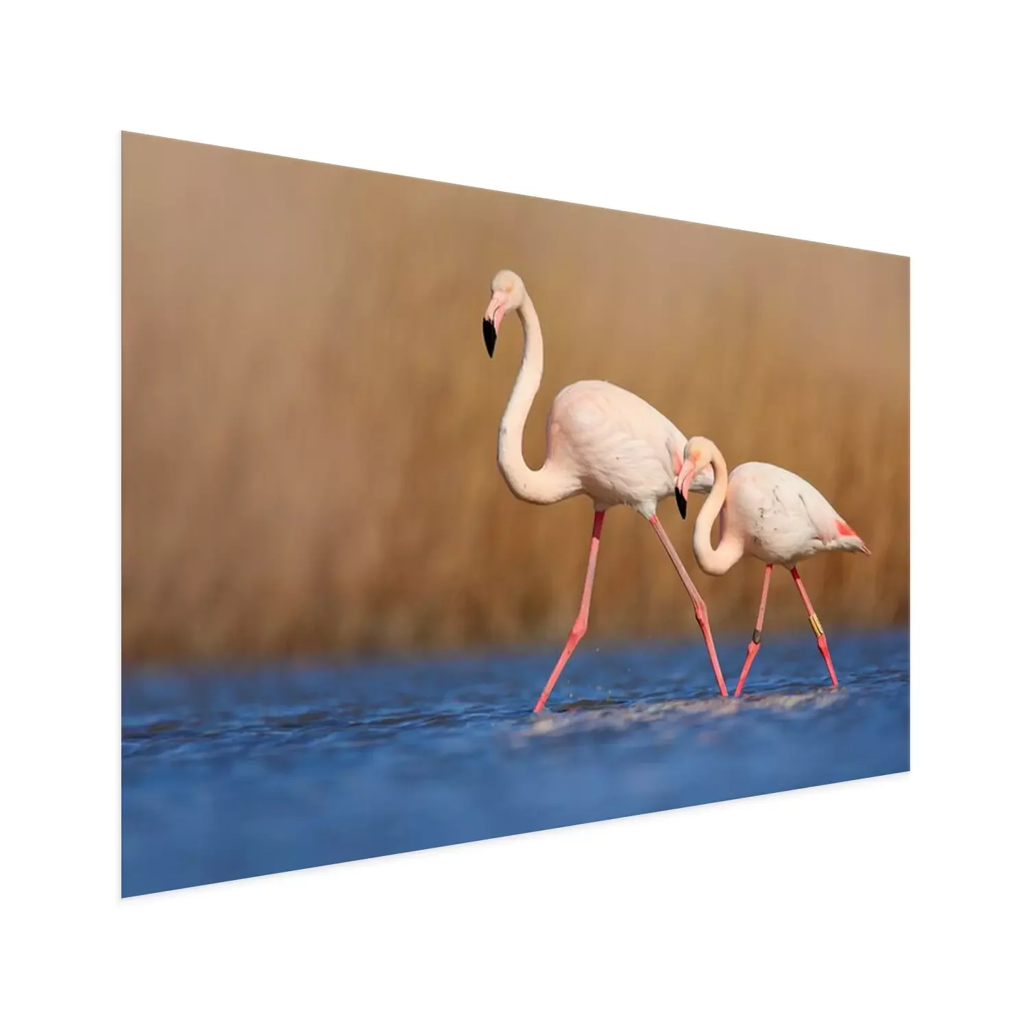 Poster: Een paar flamingo's die in het water waden