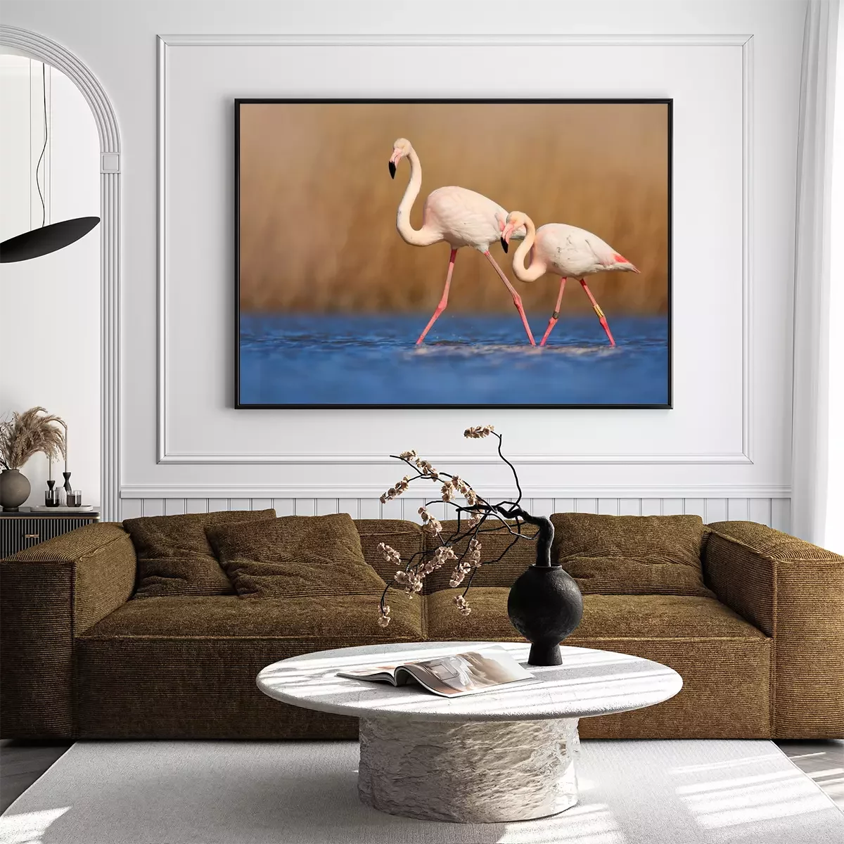 Poster Een paar flamingo's die in het water waden
