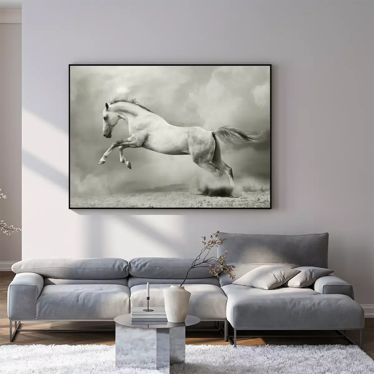 Twee grijze paarden in grijs stofFotobehang