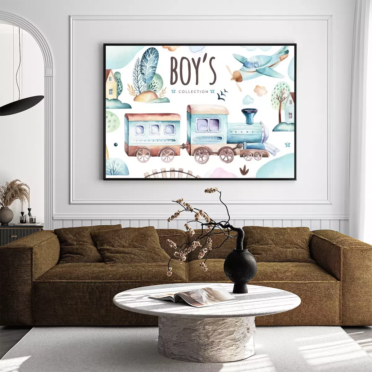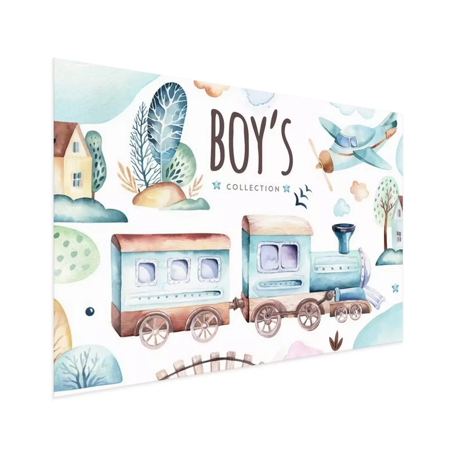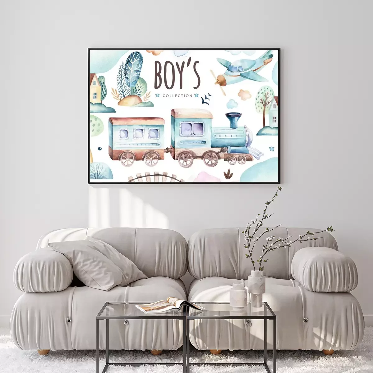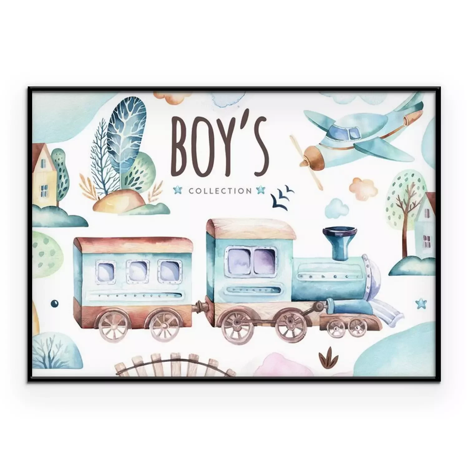 Poster: Een pastelkleurige trein en een vliegtuig tegen de achtergrond van huizen