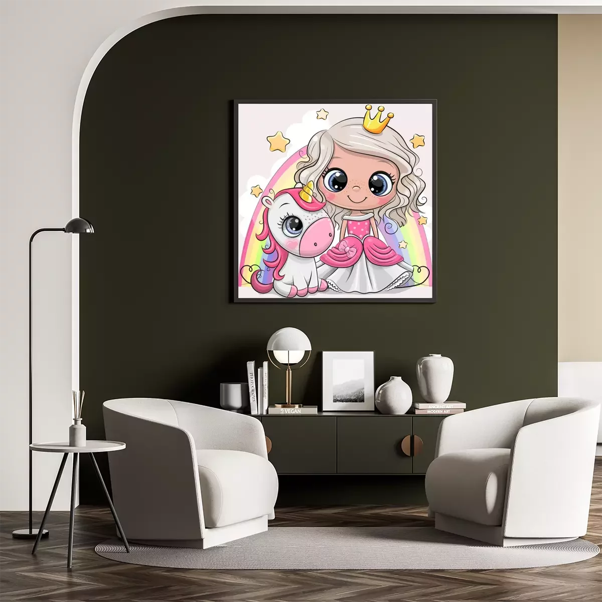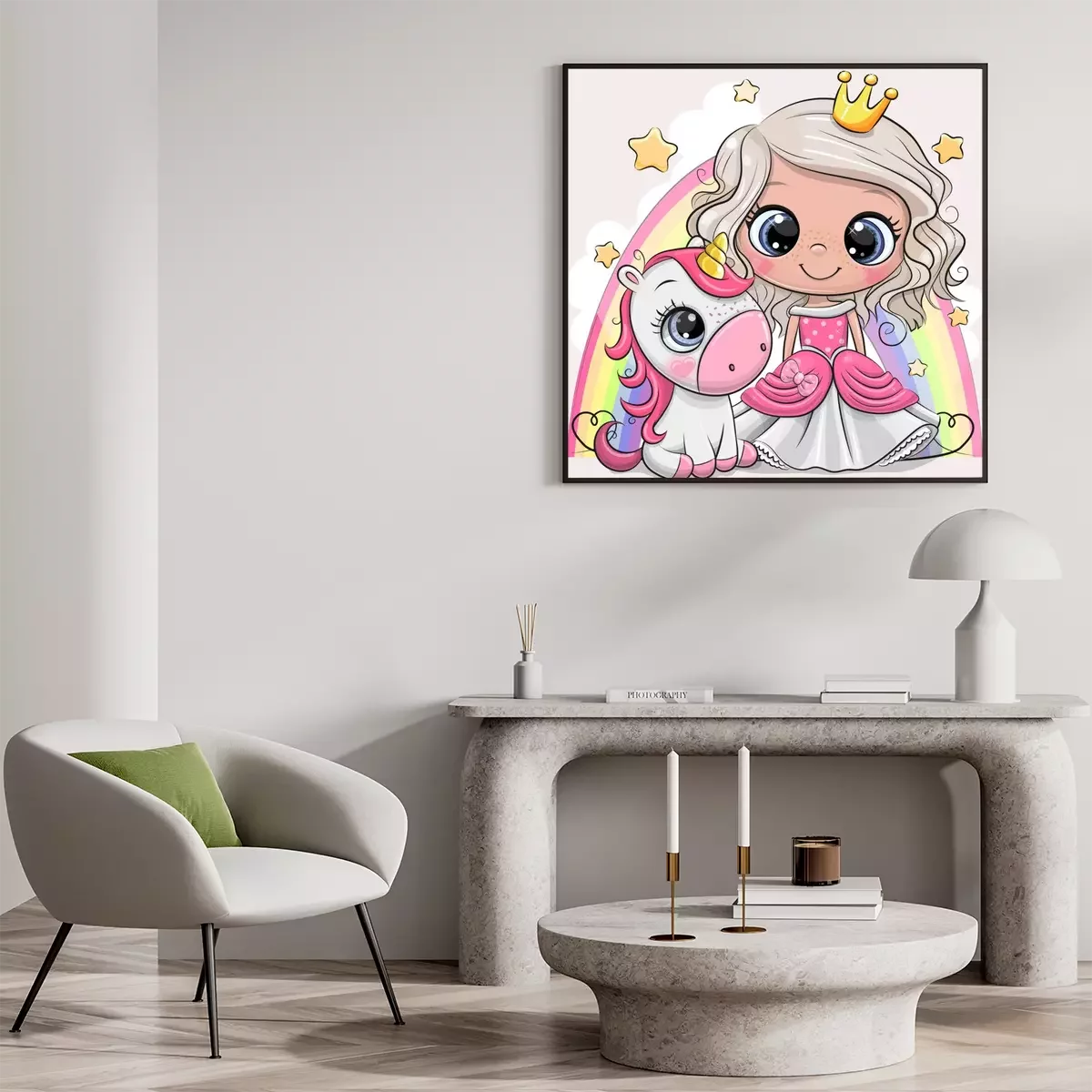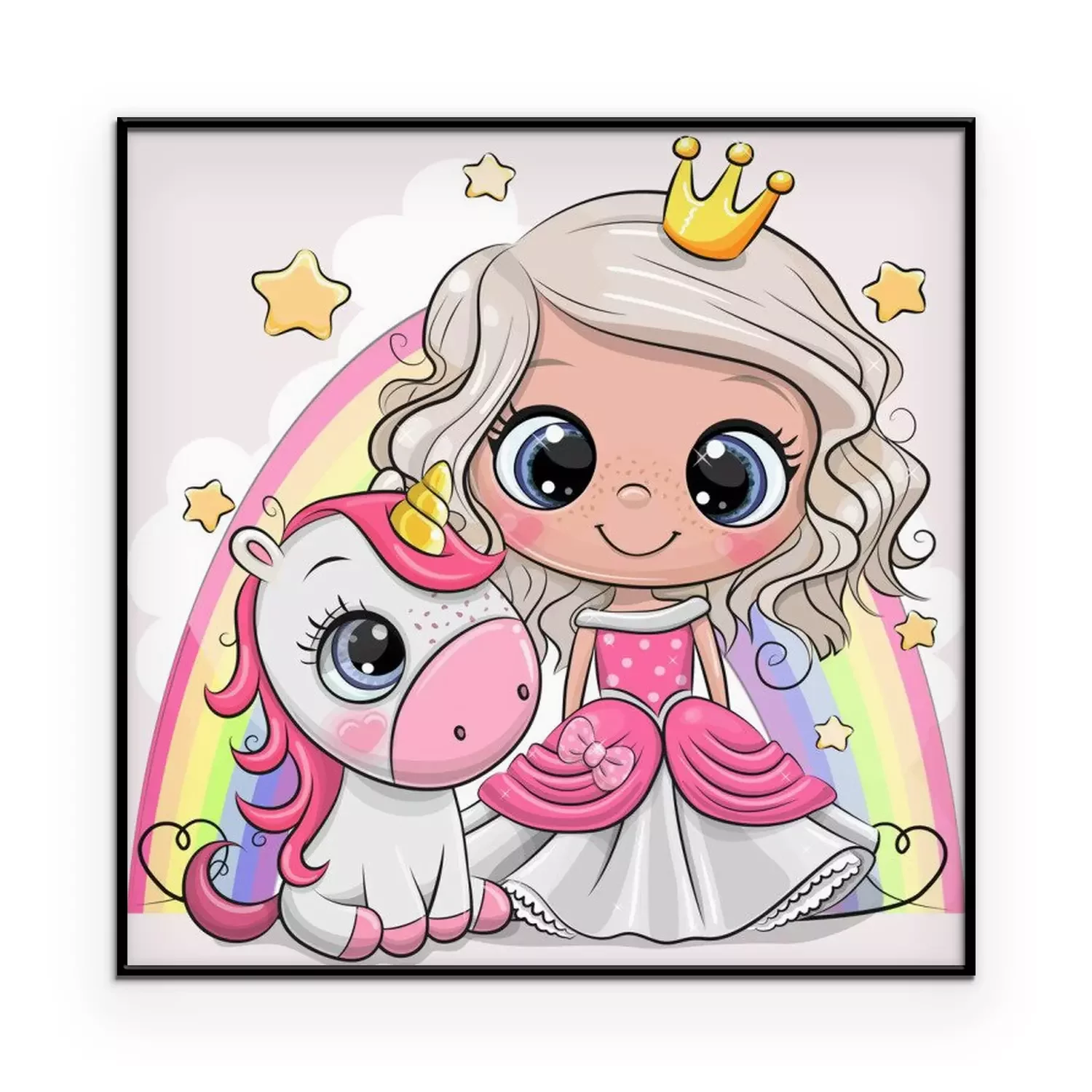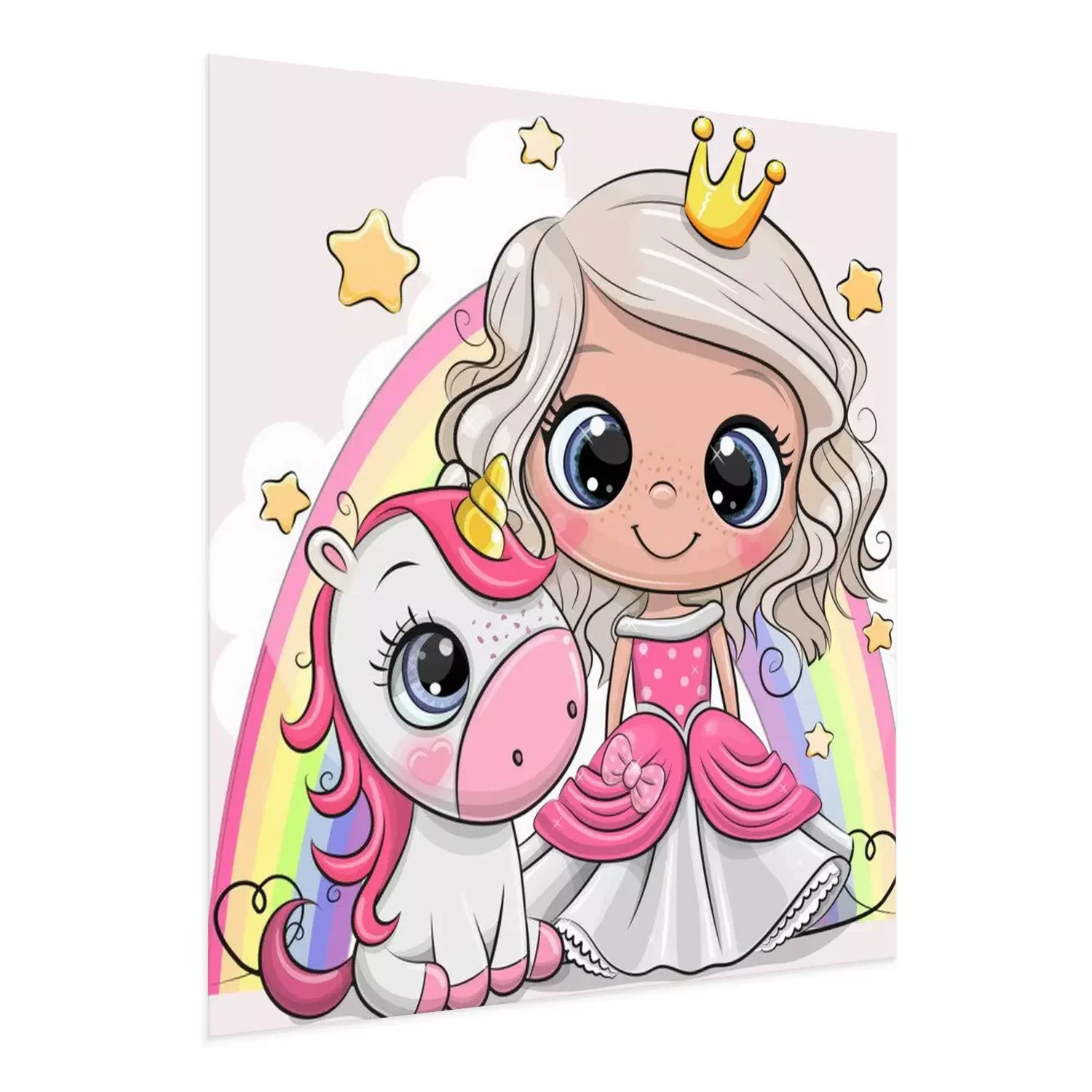 Poster: Een prinses en een eenhoorn op de achtergrond van een veelkleurige regenboog
