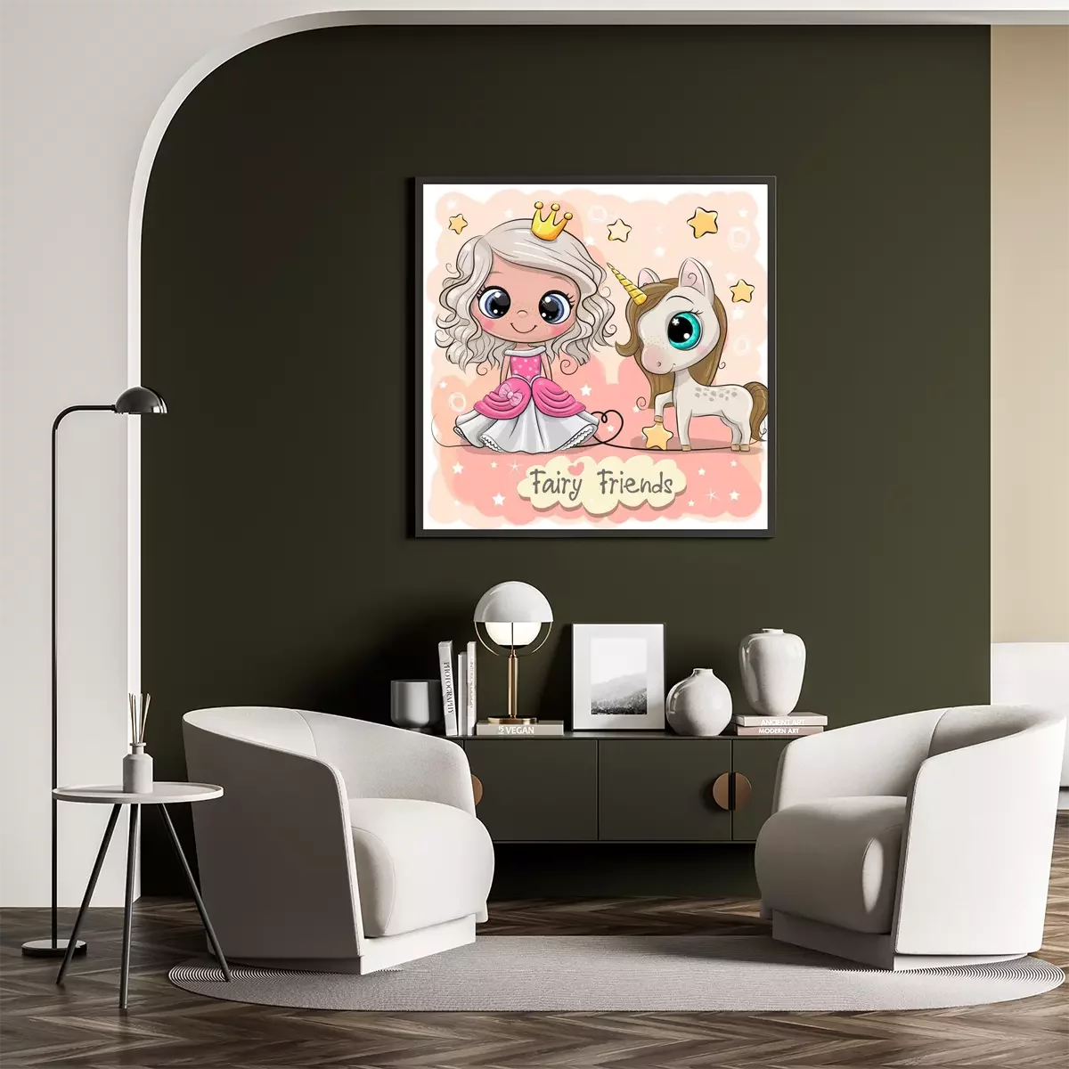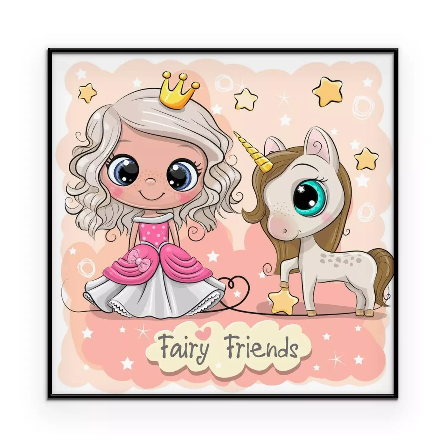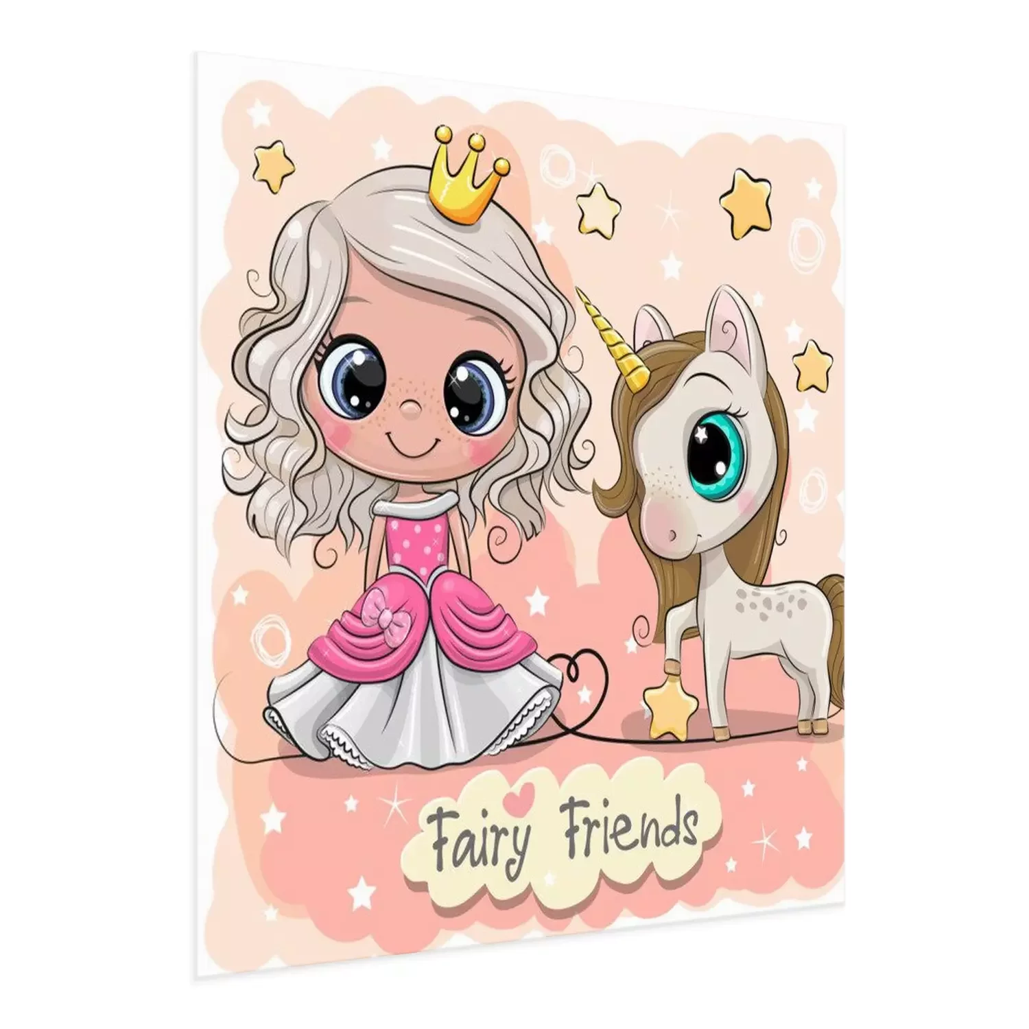 Een prinses en een eenhoorn op de achtergrond van een veelkleurige regenboog