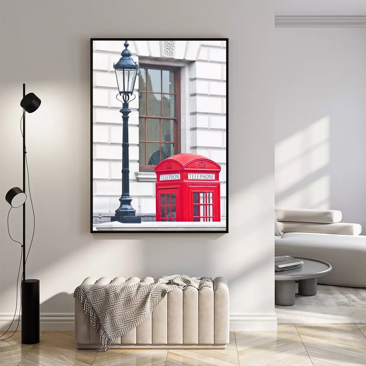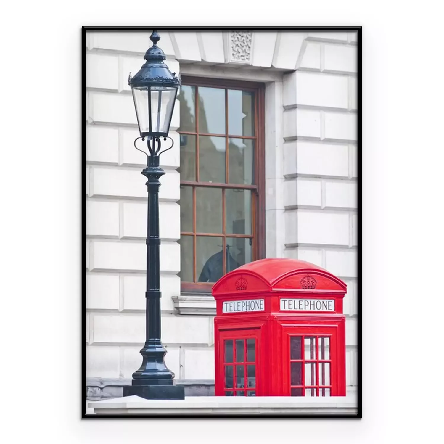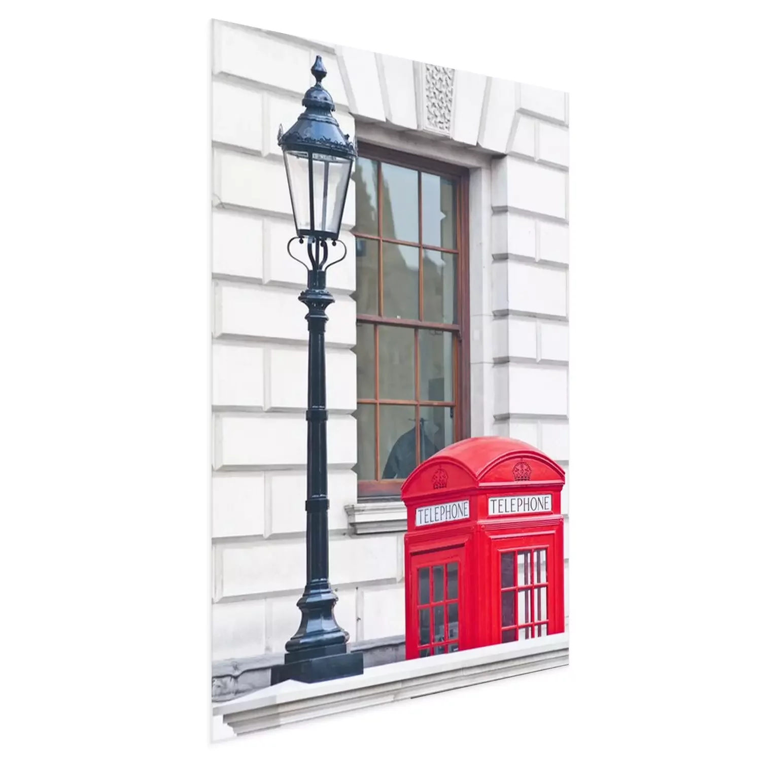 Poster: Een rode telefooncel naast een vuurtoren