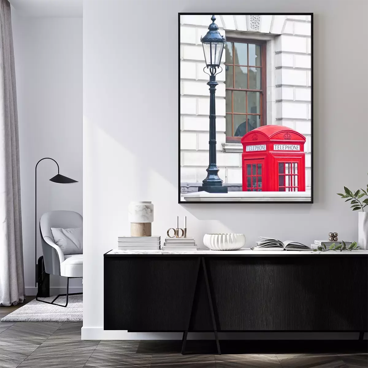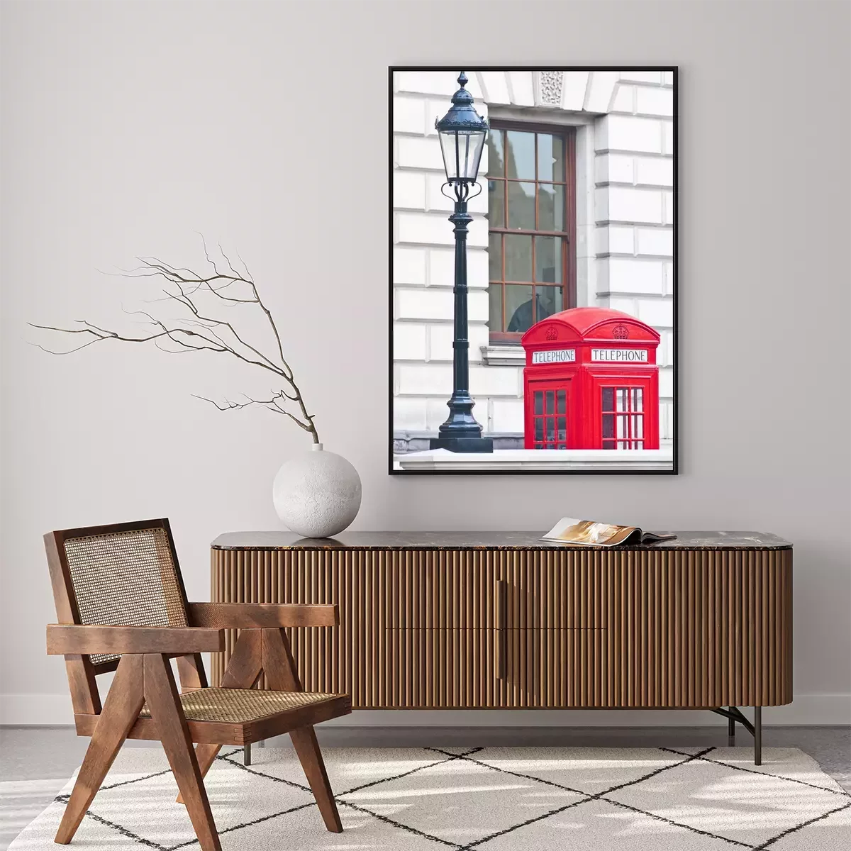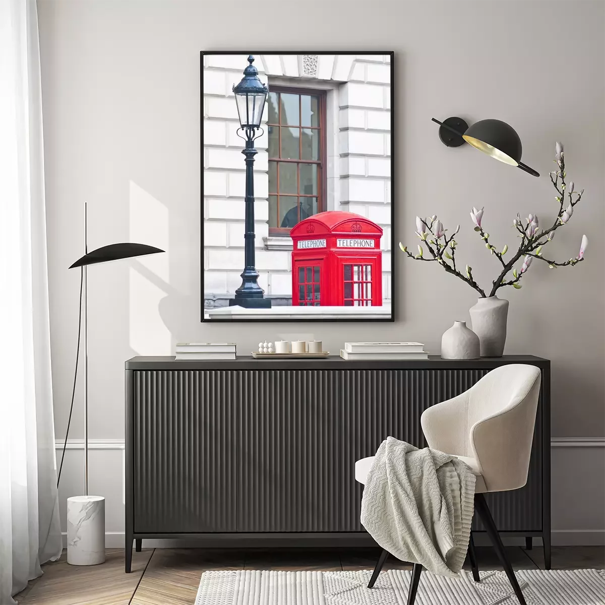 Poster: Een rode telefooncel naast een vuurtoren