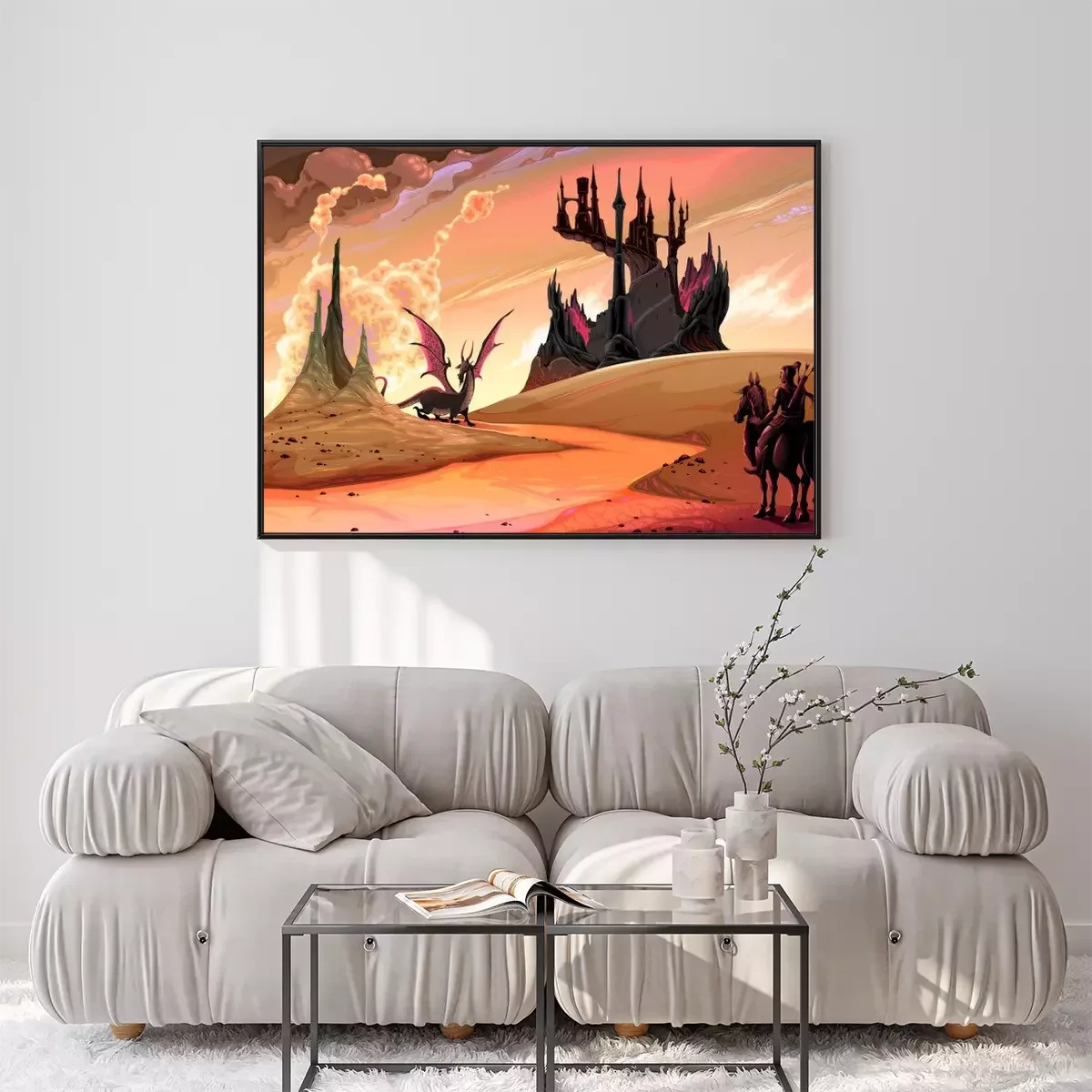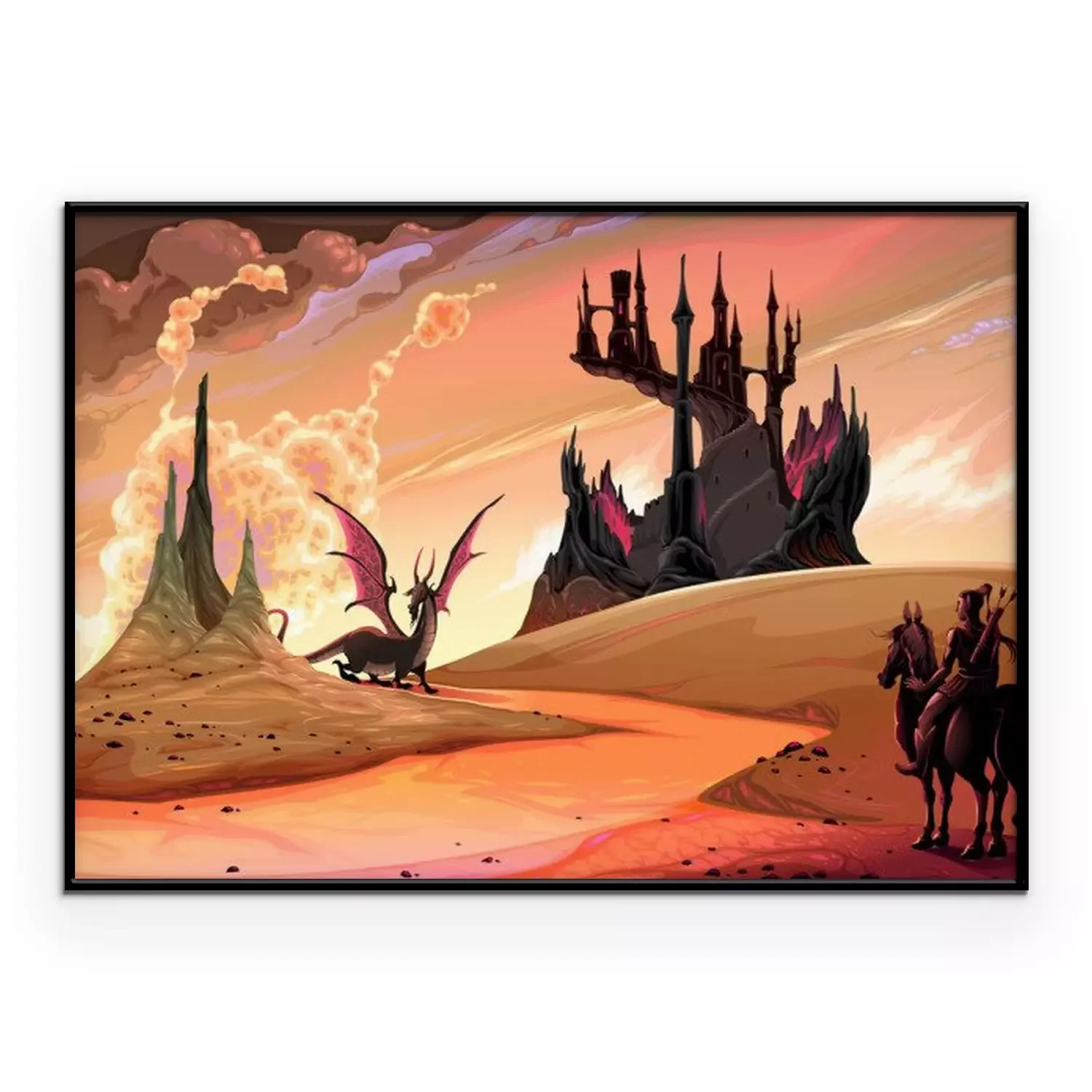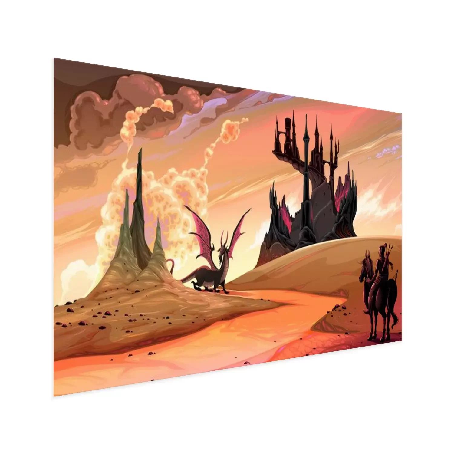 Poster: Een ruiter kijkt naar een draak en een donker kasteel
