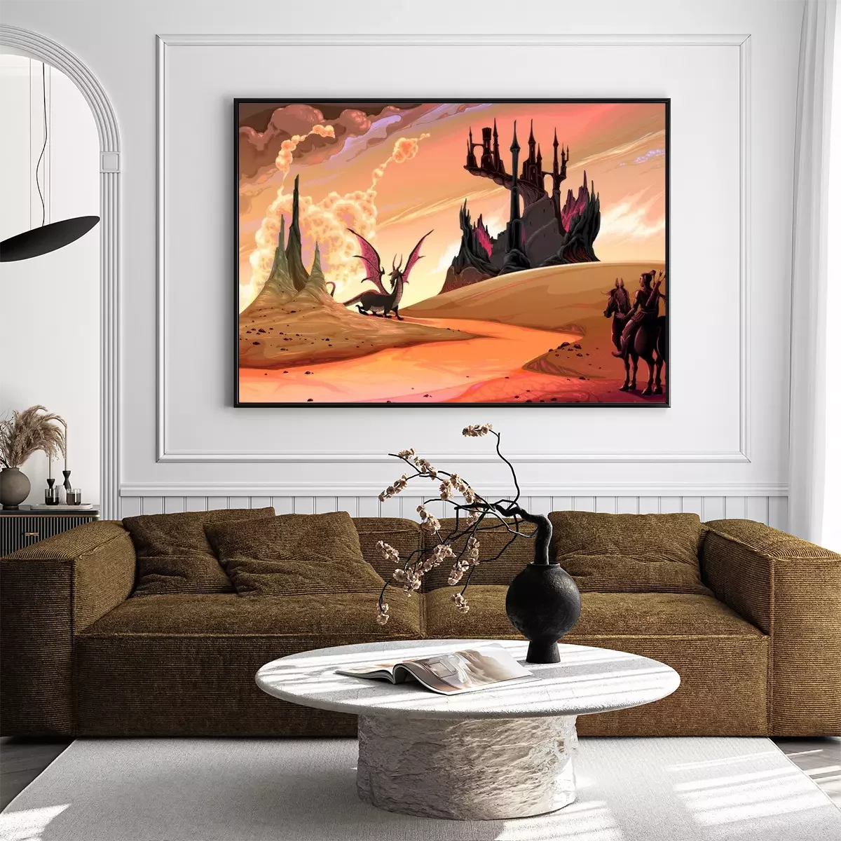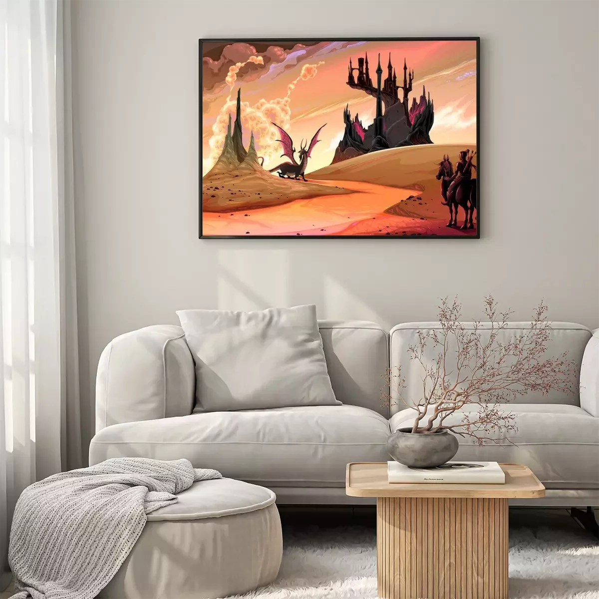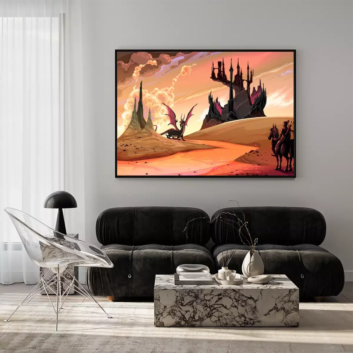 Poster: Een ruiter kijkt naar een draak en een donker kasteel