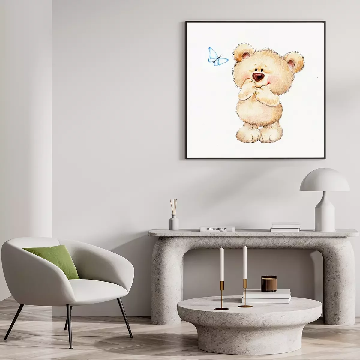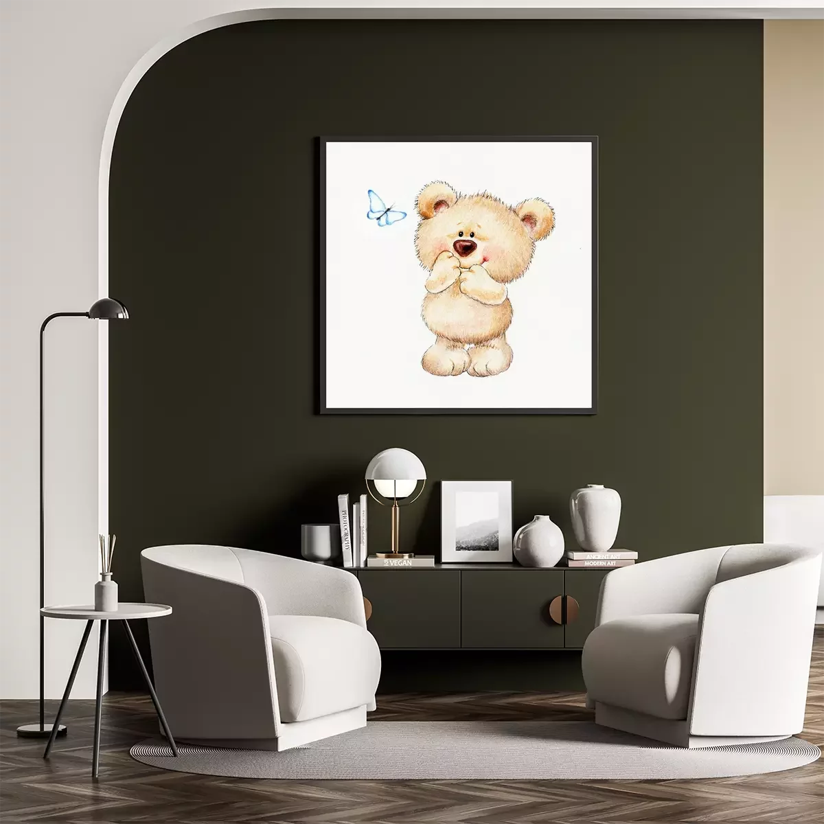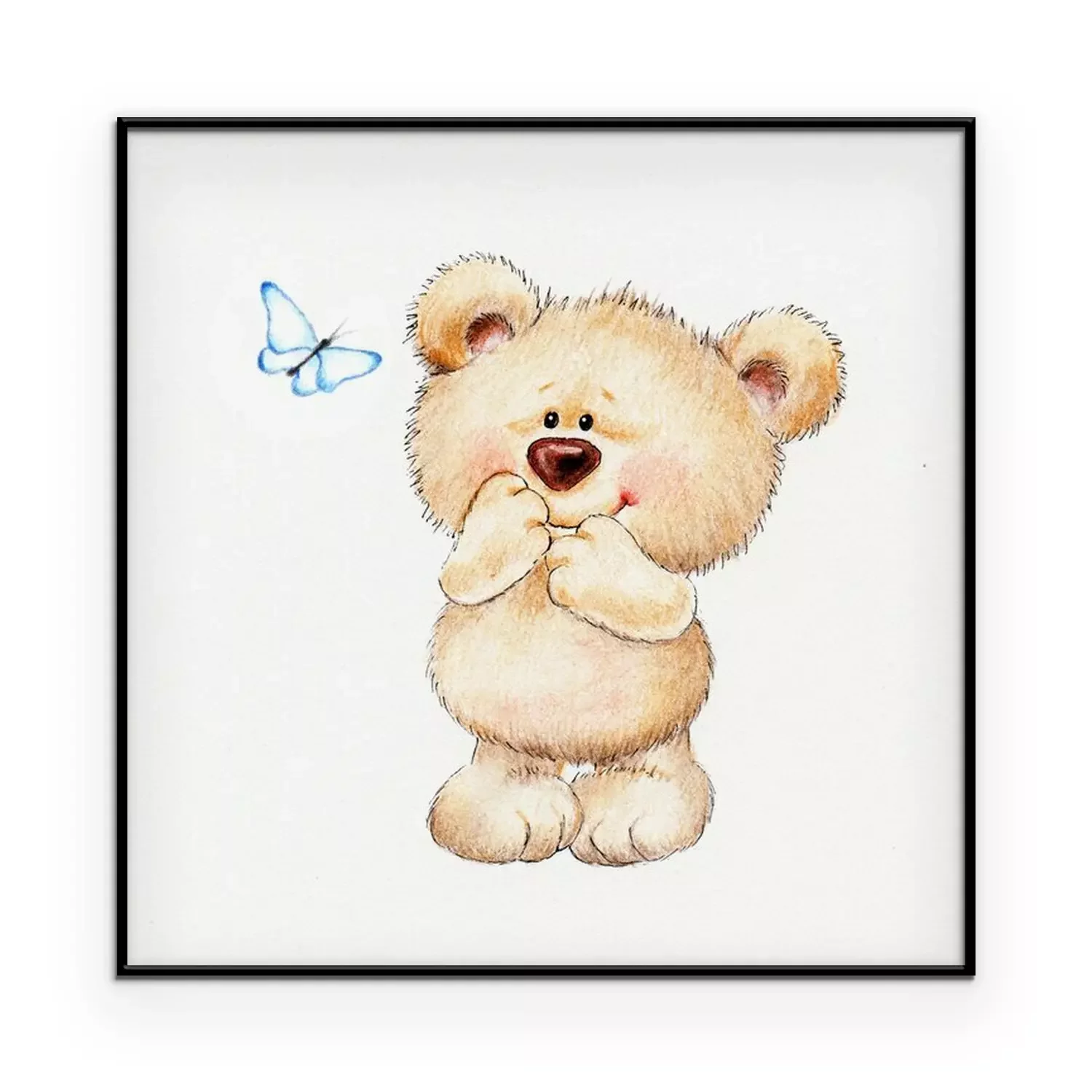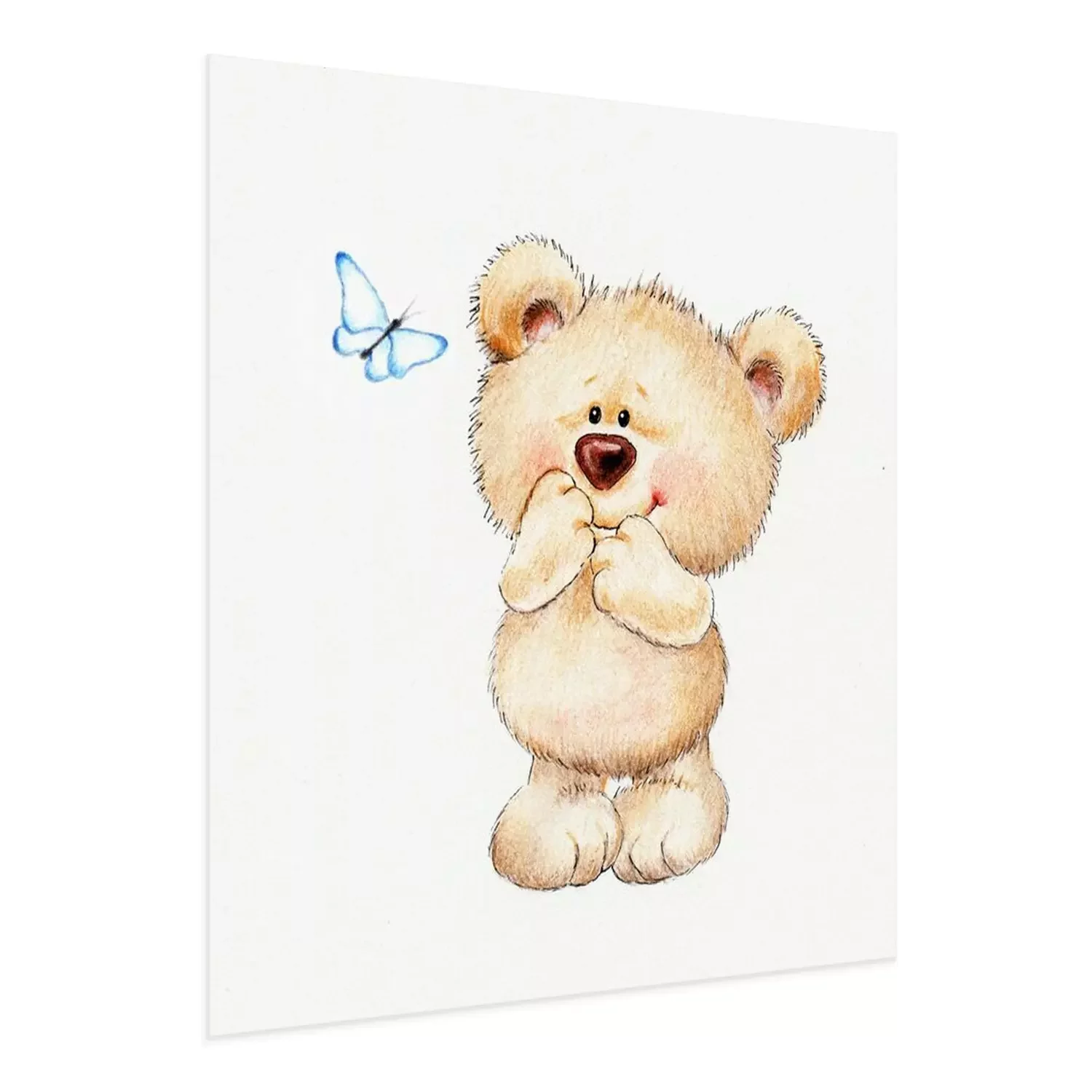 Poster: Een schattige beer die naar een vlinder kijkt