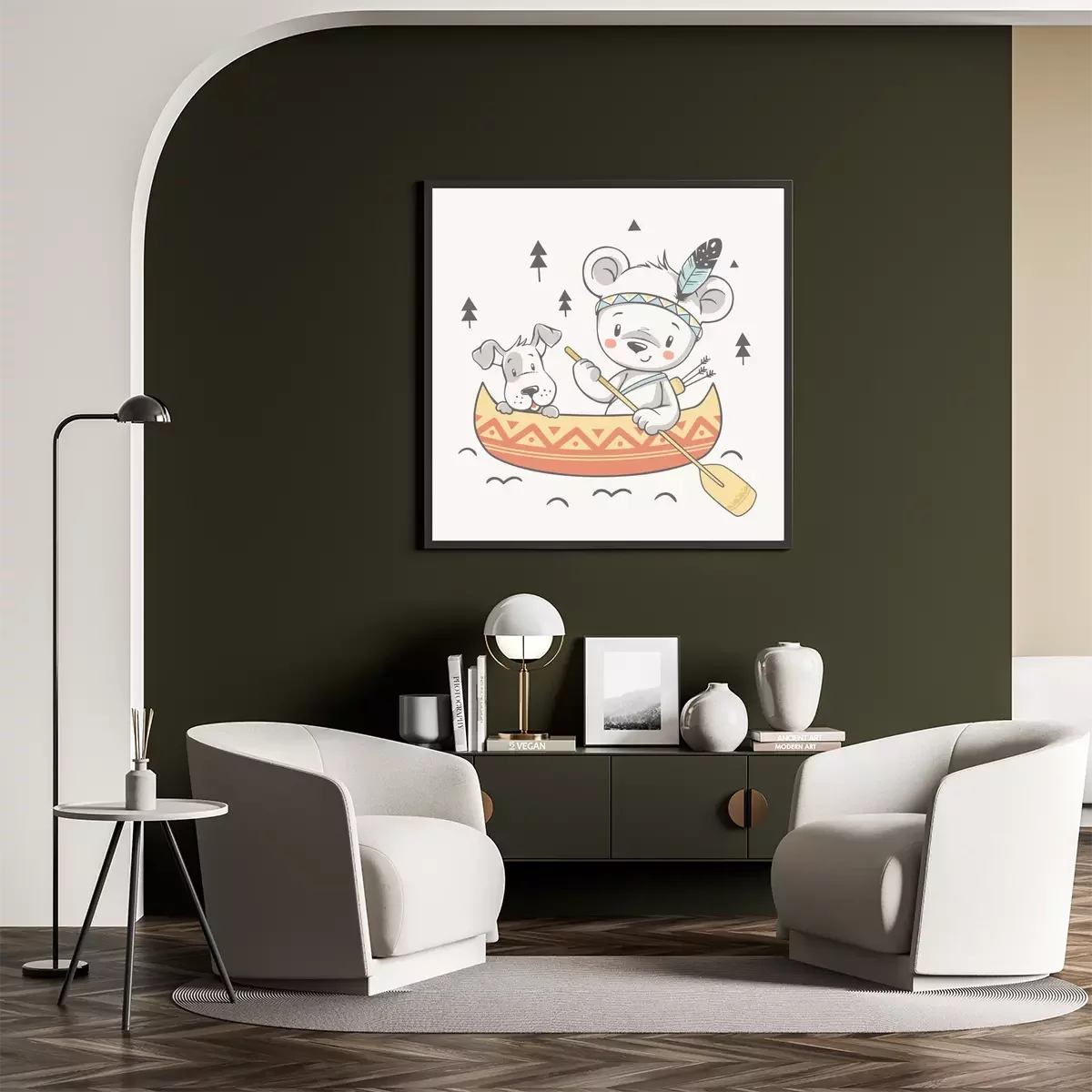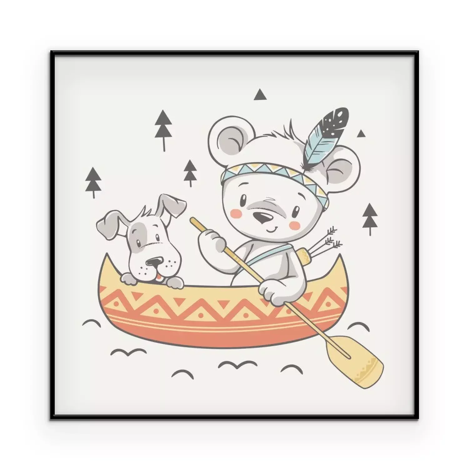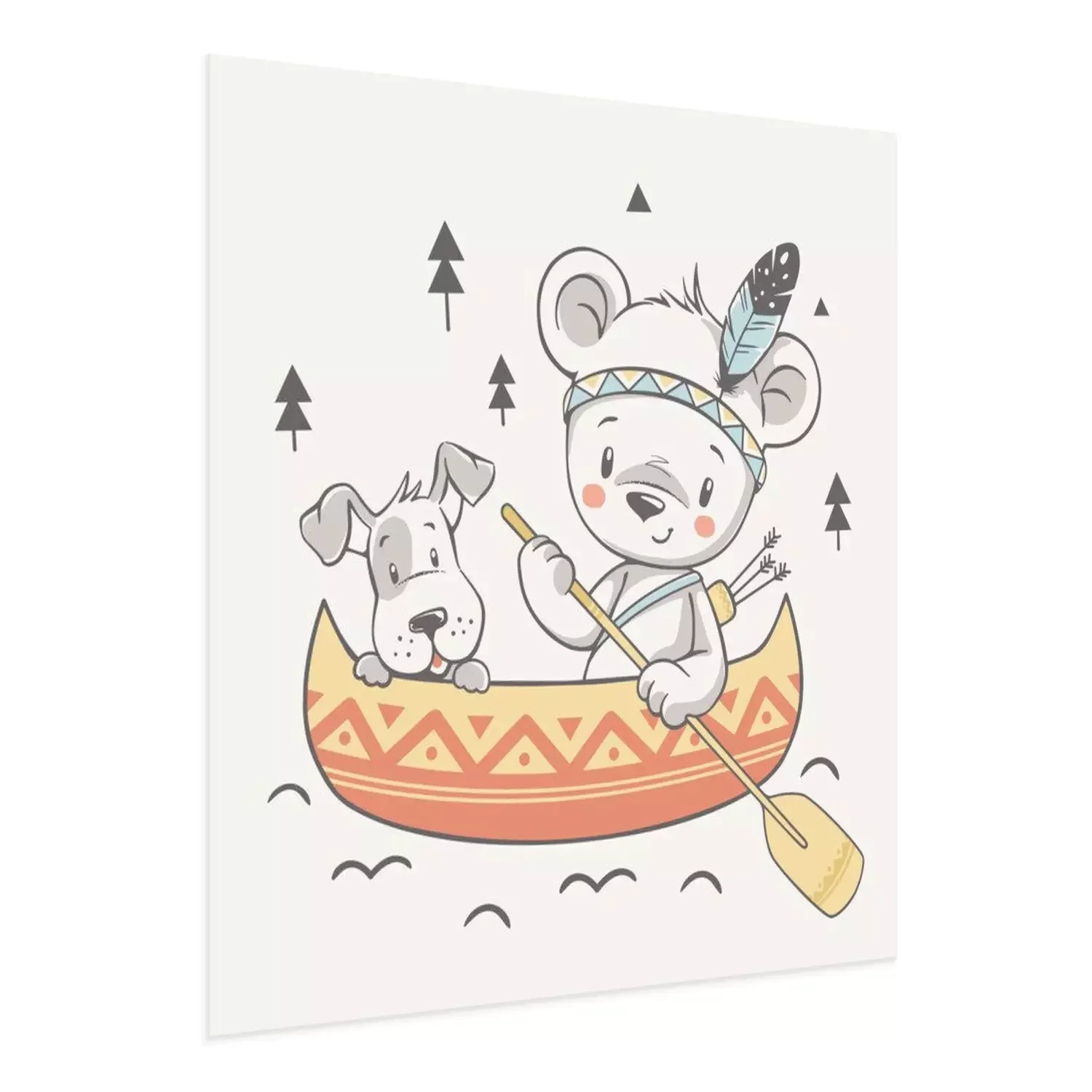 Poster: Een teddybeer en een hond in een geeloranje boot