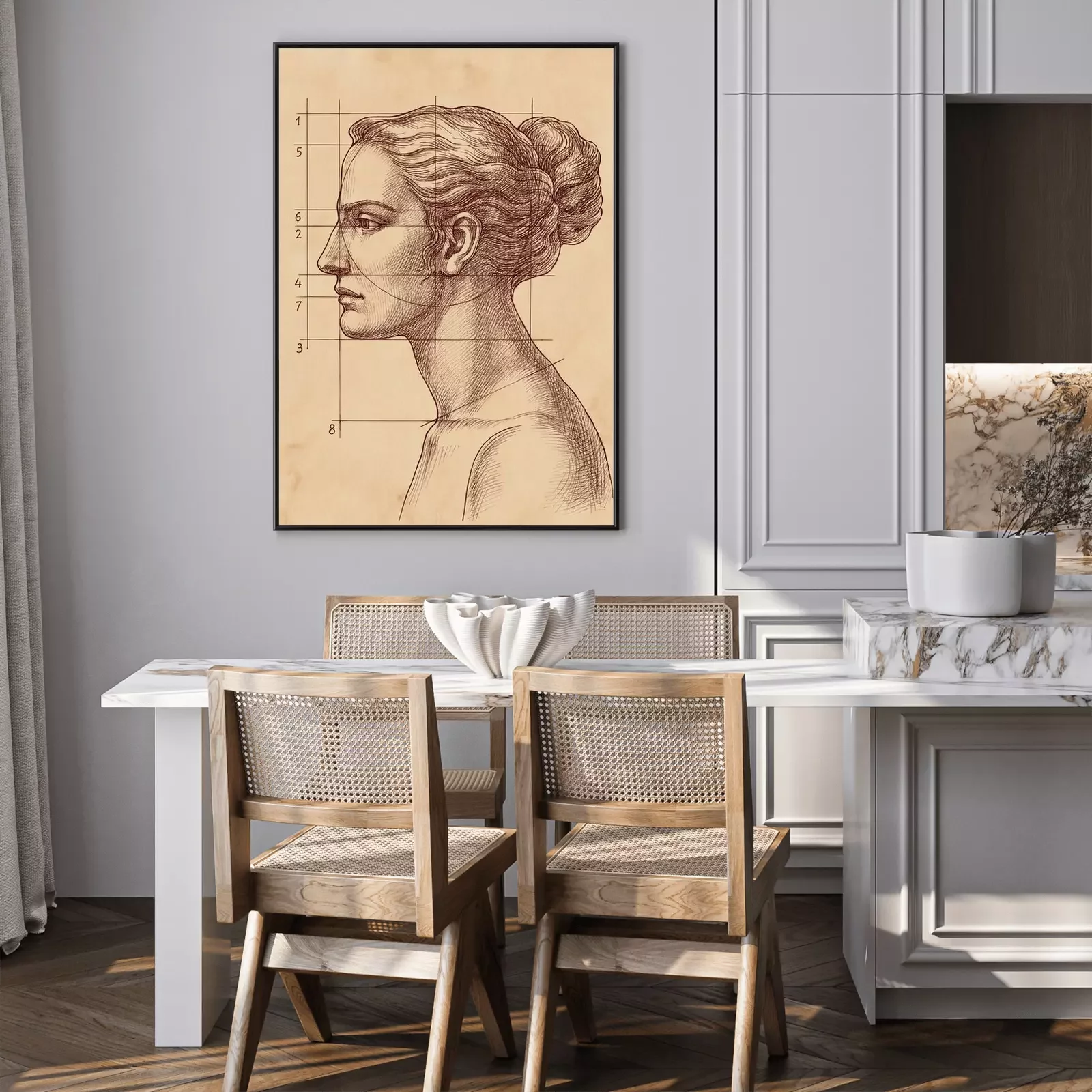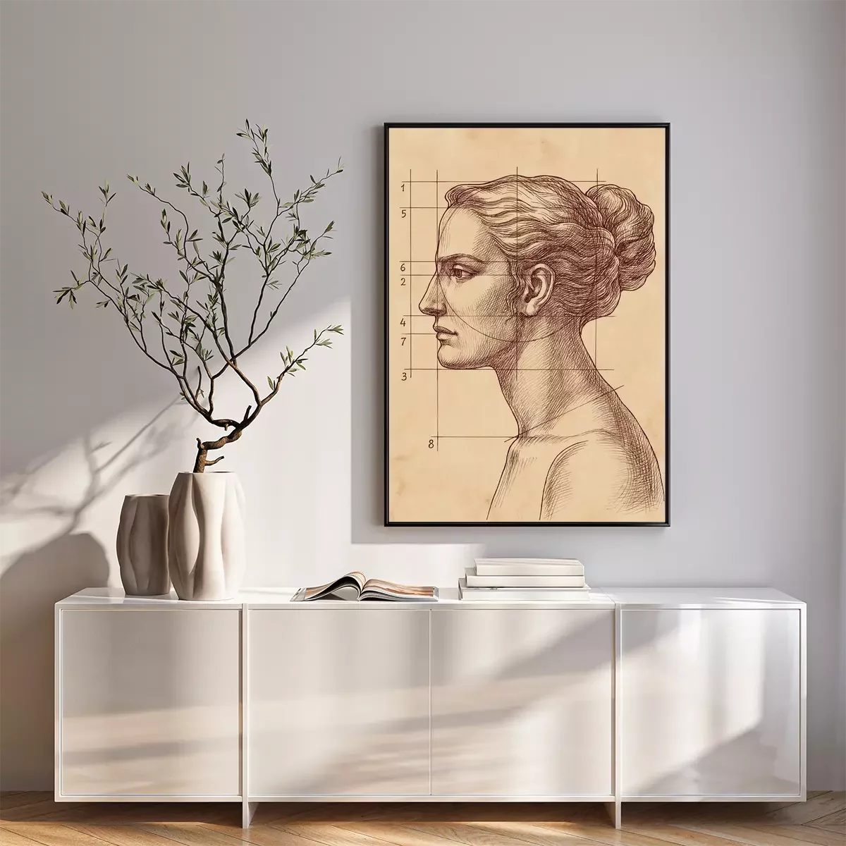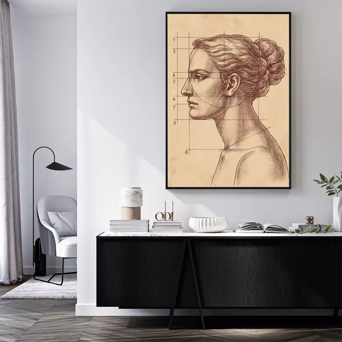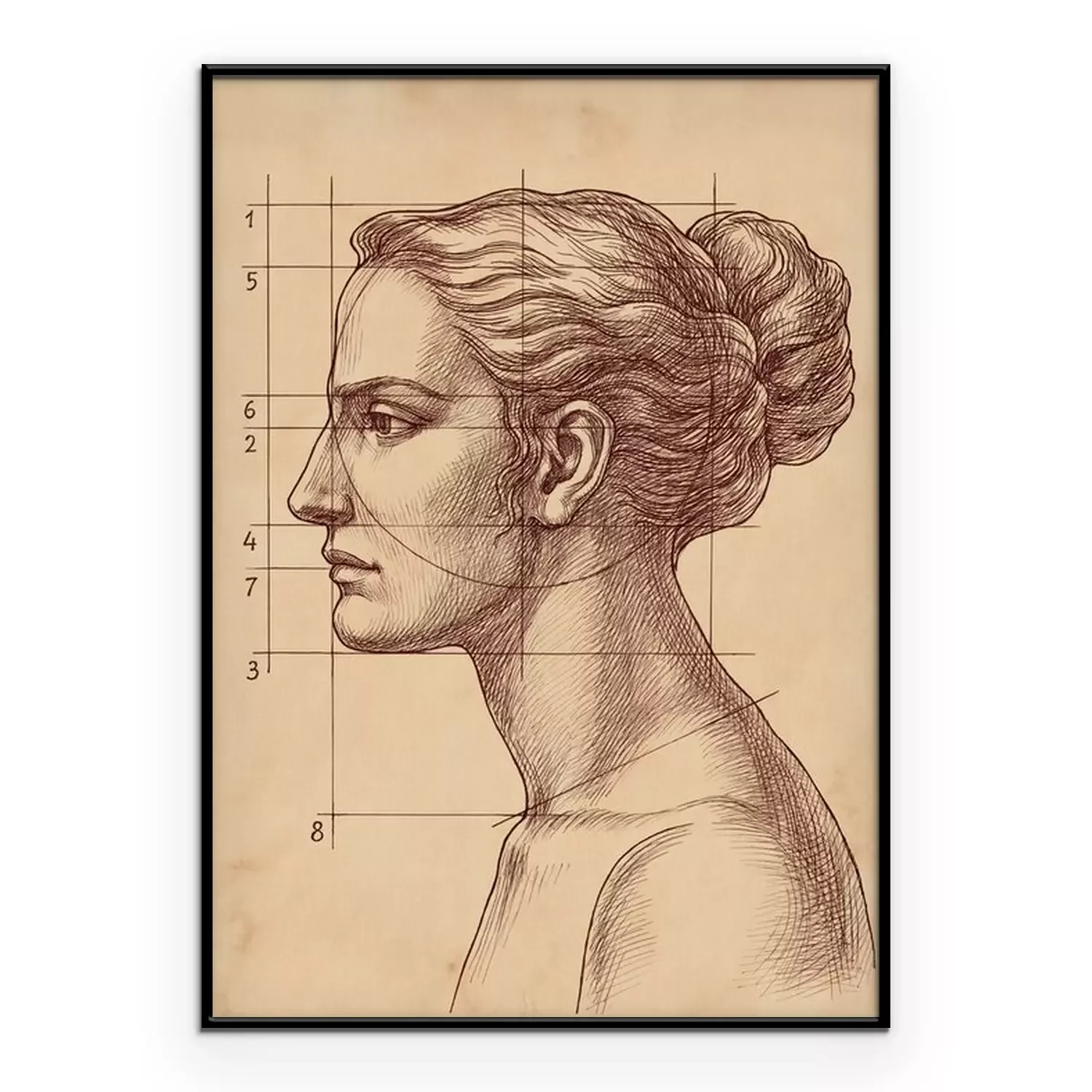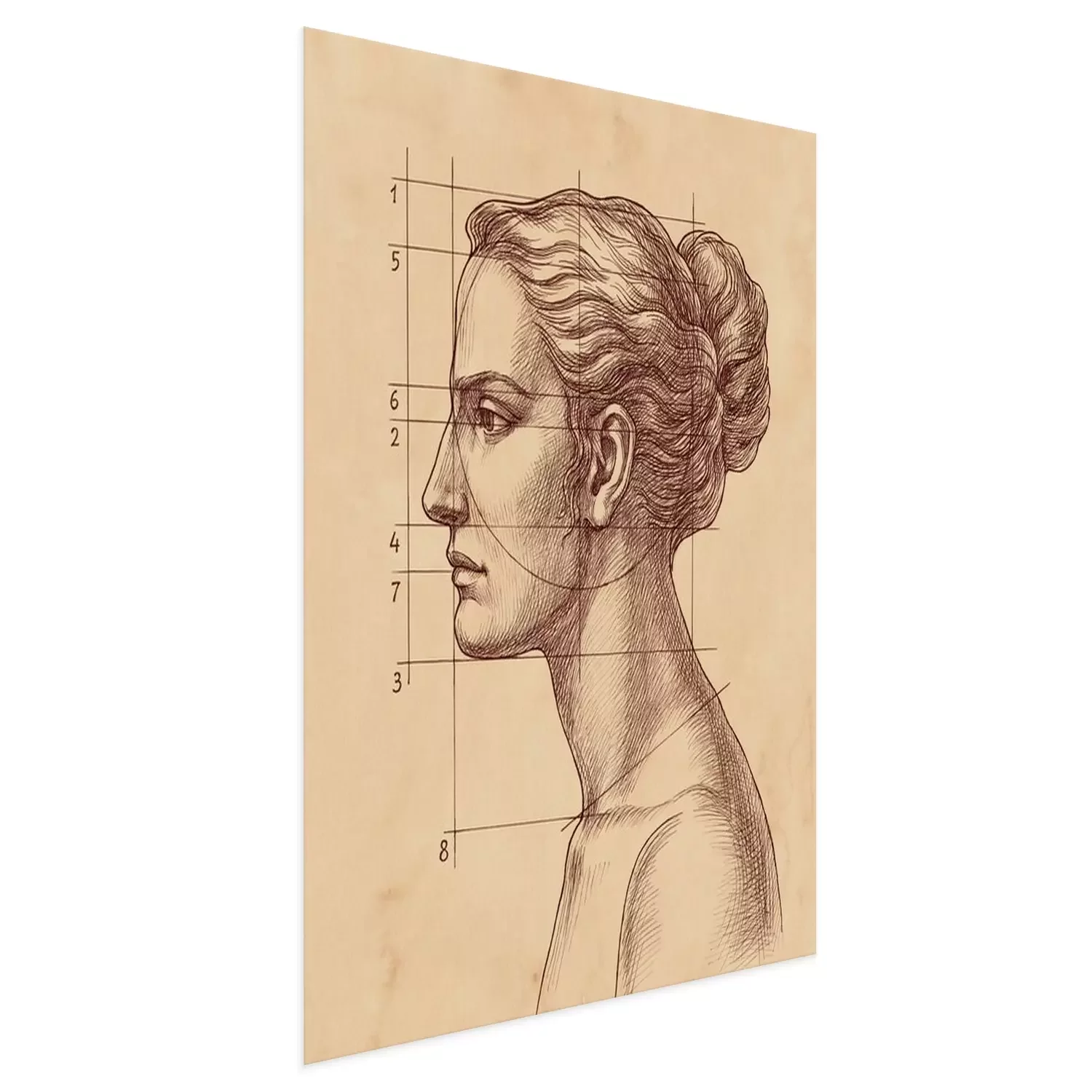 Poster Een tekening van het gezicht van een vrouw en lijnen die de verhoudingen aangeven