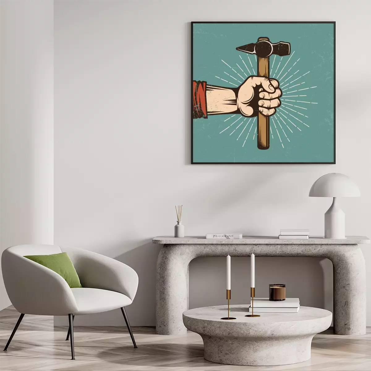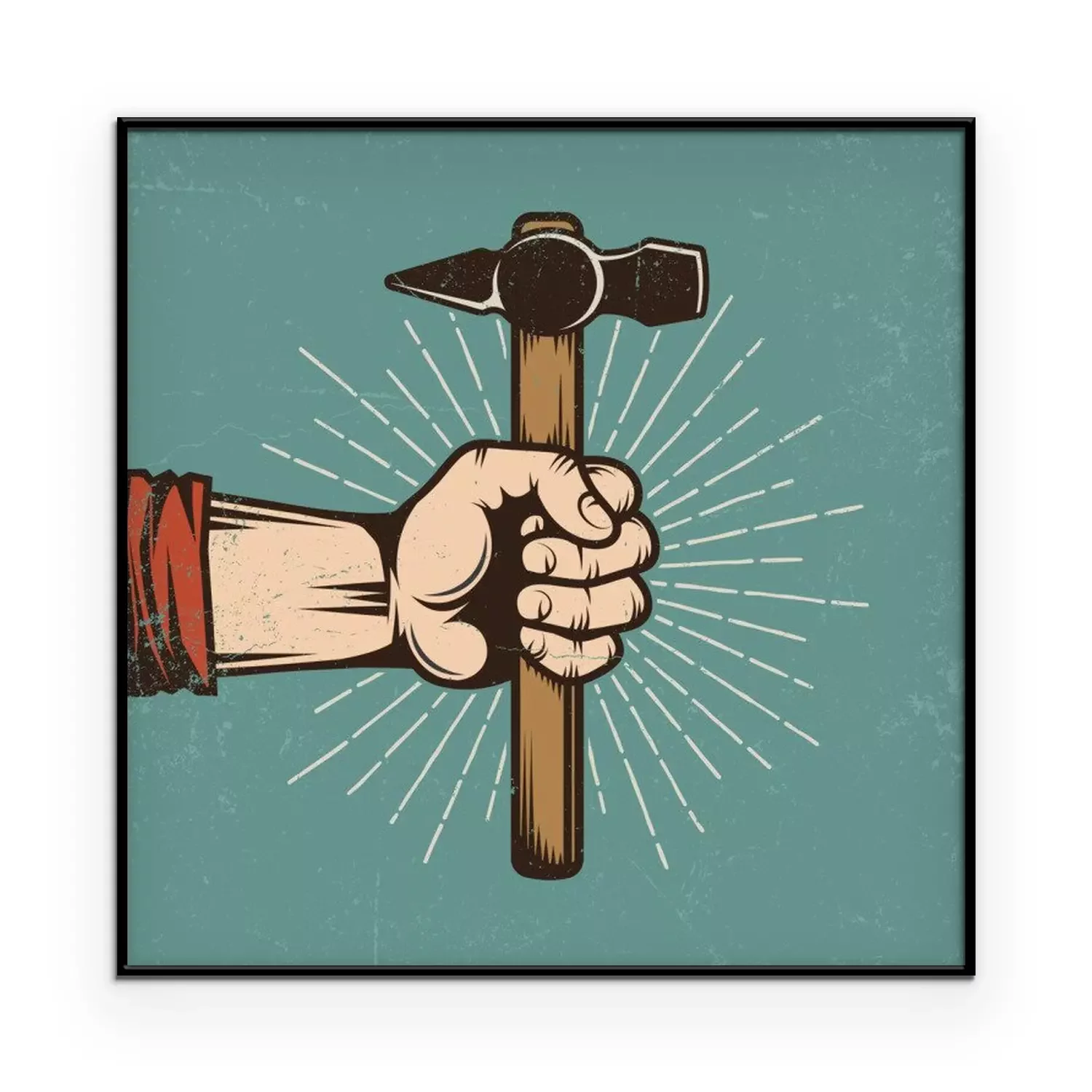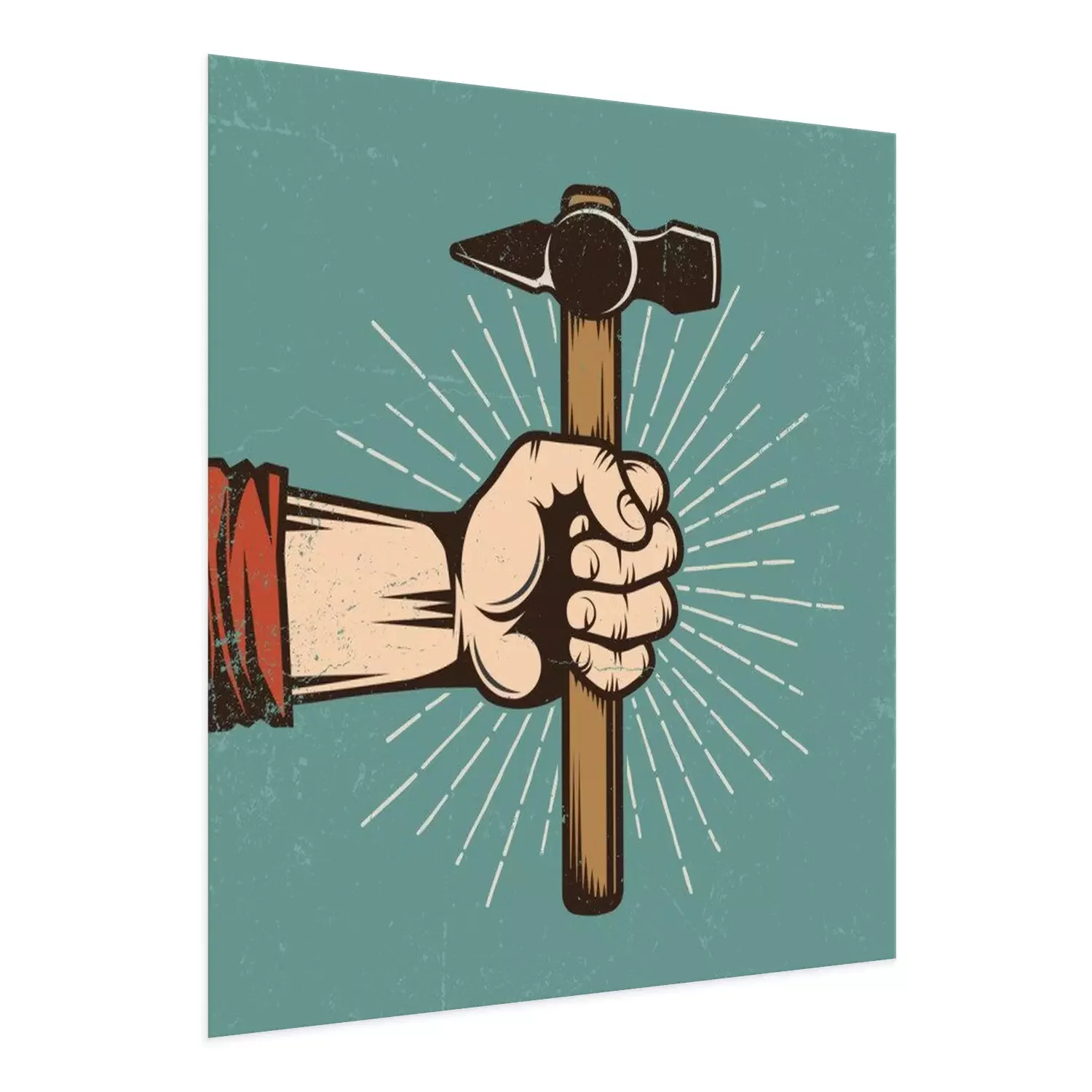 Poster Een versleten gekleurde retro poster - de hand van de werker houdt een hamer. Textuur op aparte laag. Vintage vector illustratie.