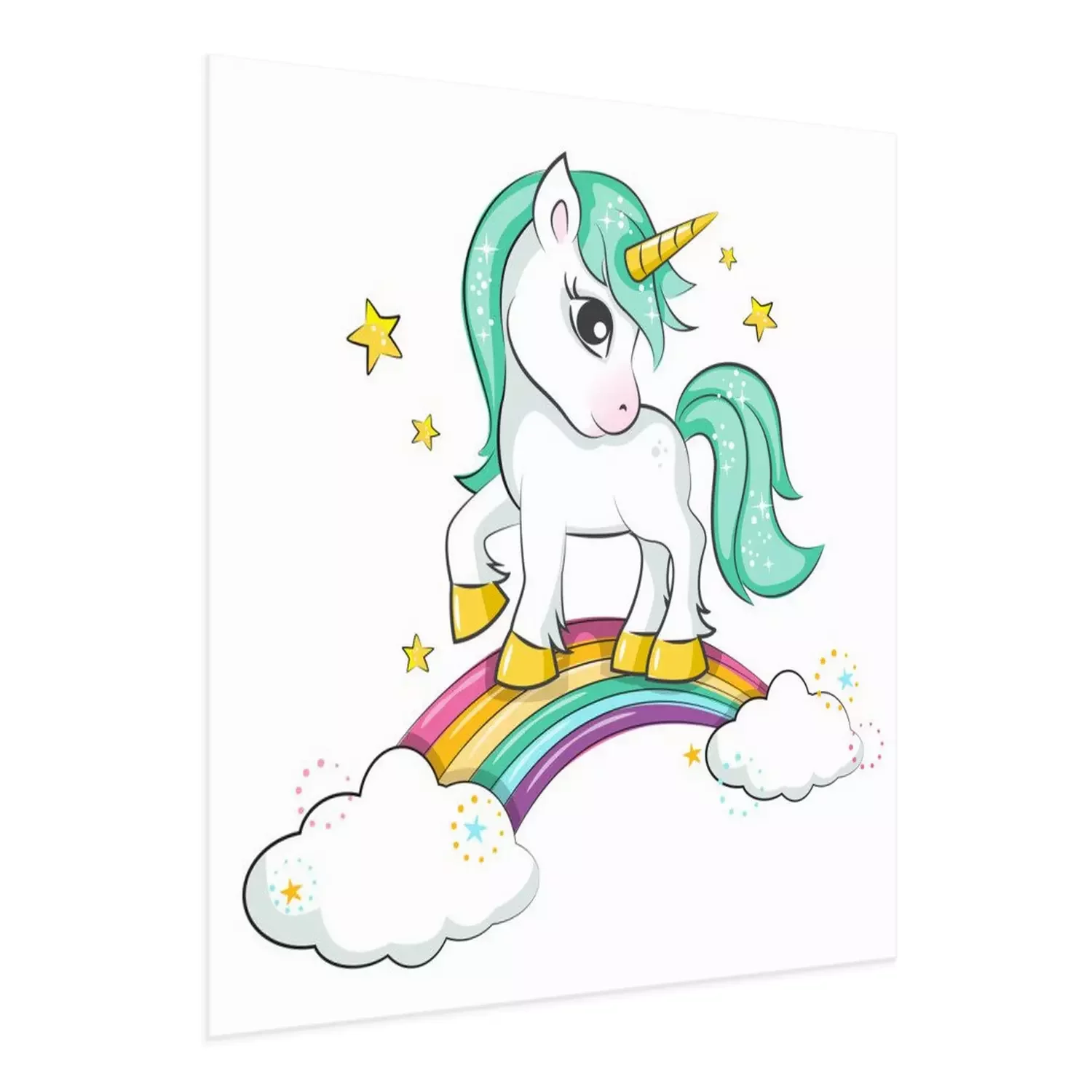 Poster: Eenhoorn met een groene staart en manen op een regenboog