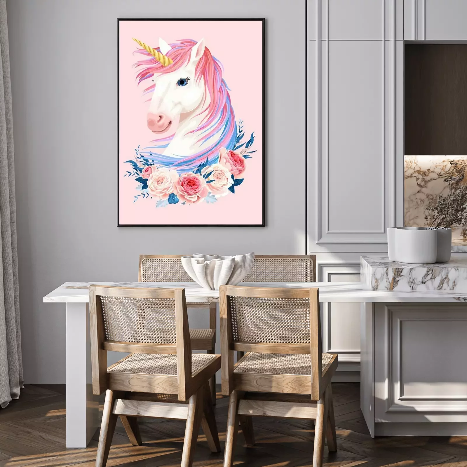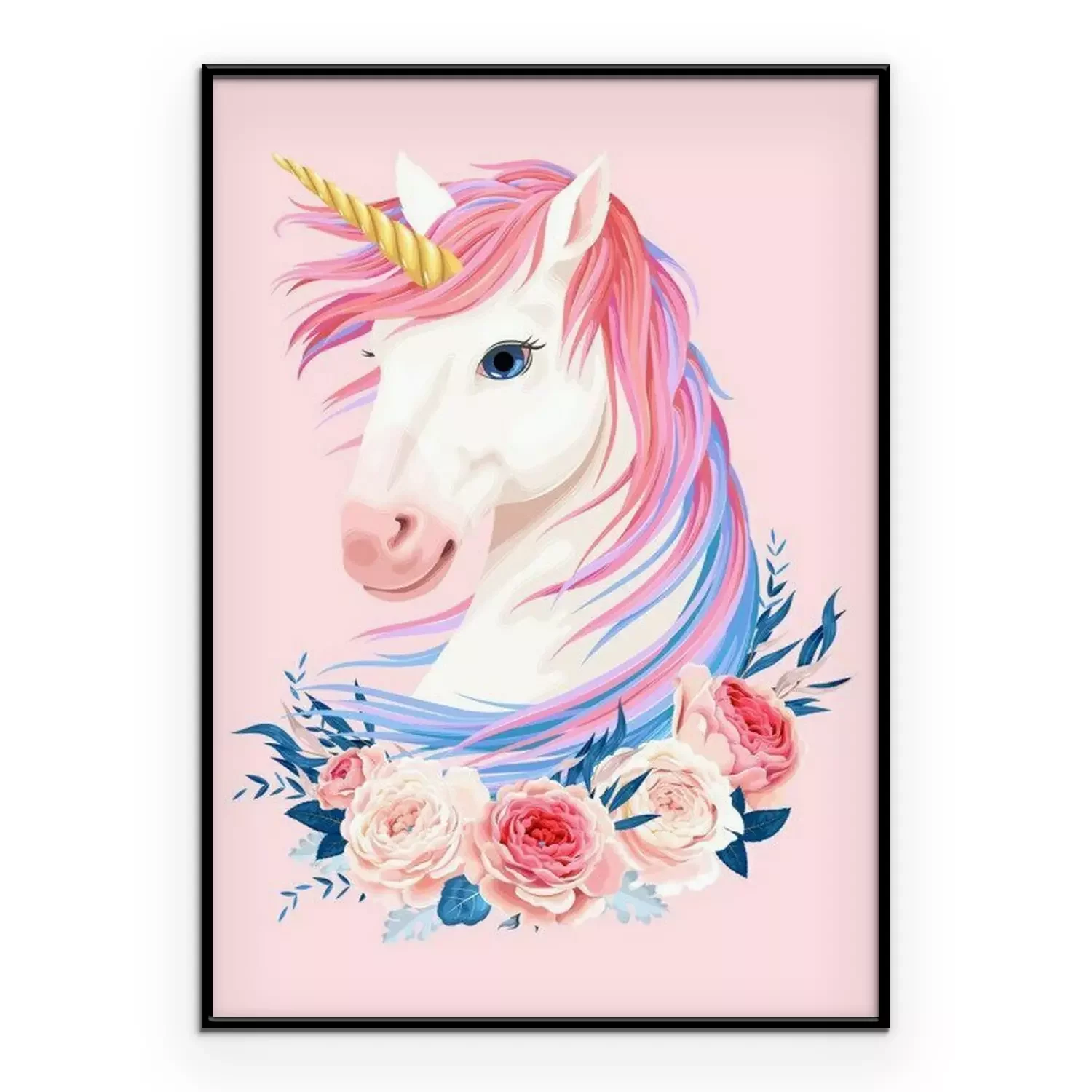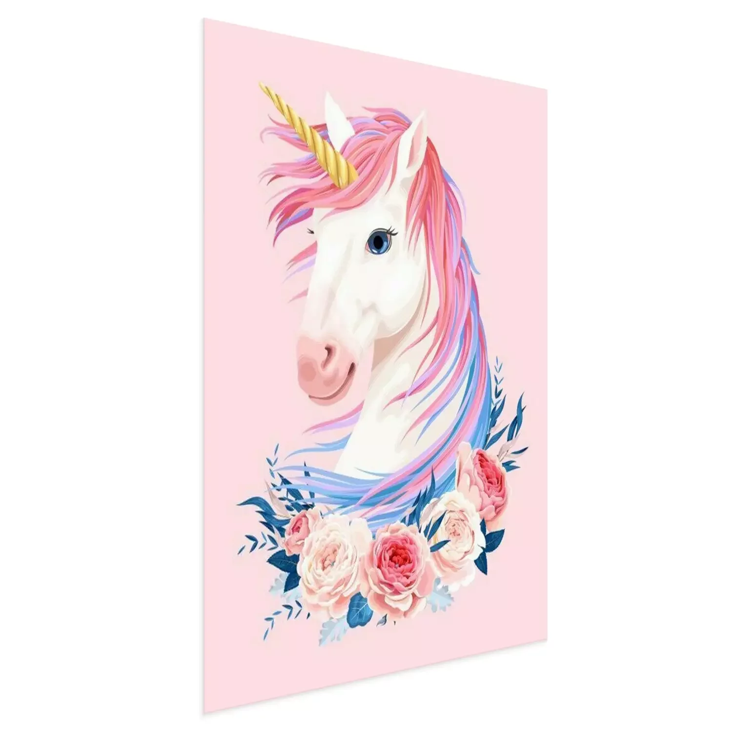Poster: Eenhoorn met kleurrijke manen en rozen