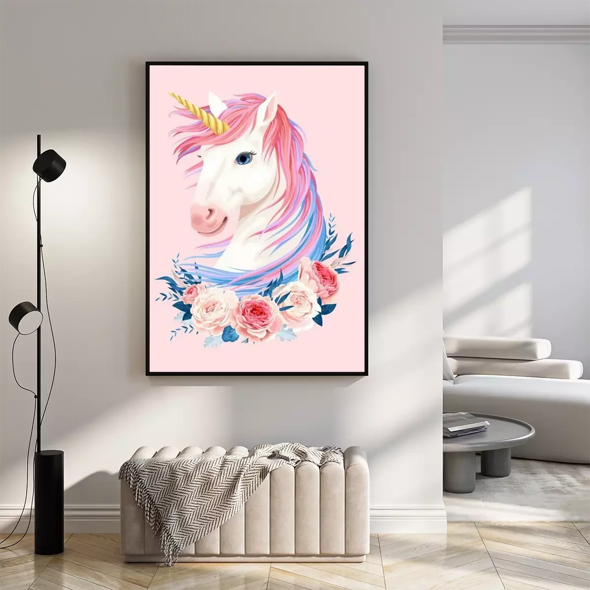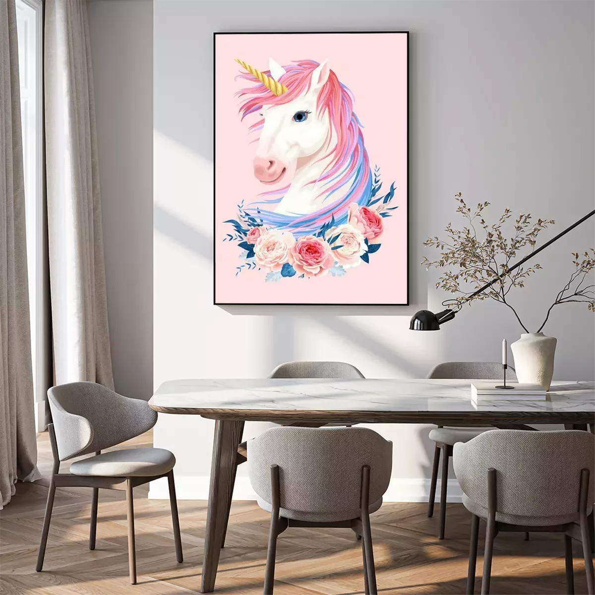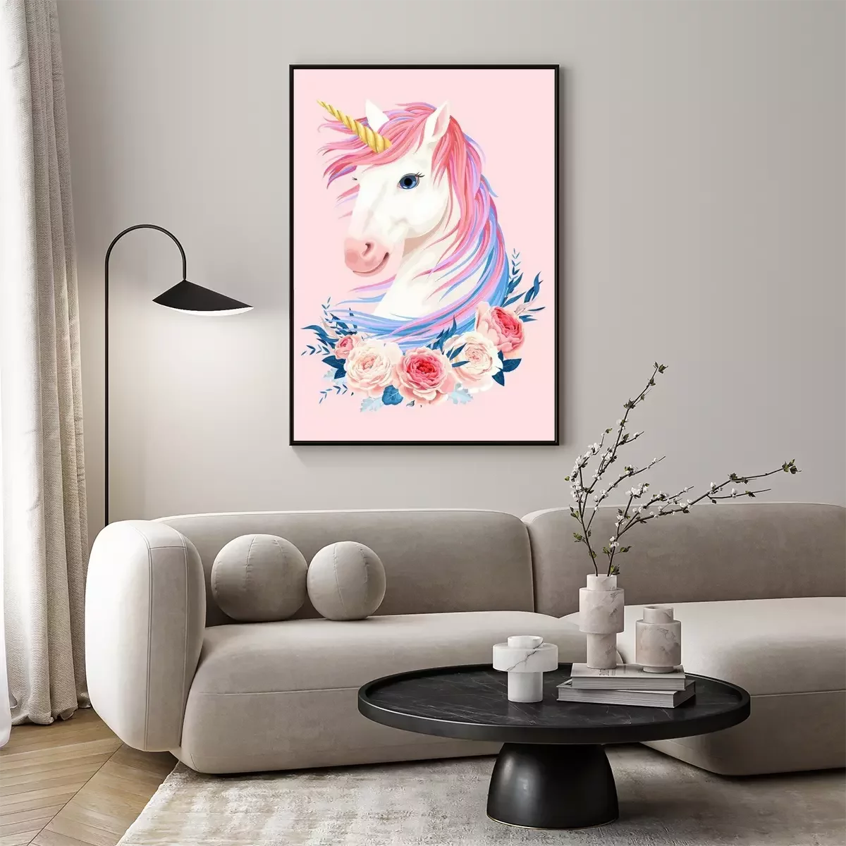 Poster: Eenhoorn met kleurrijke manen en rozen