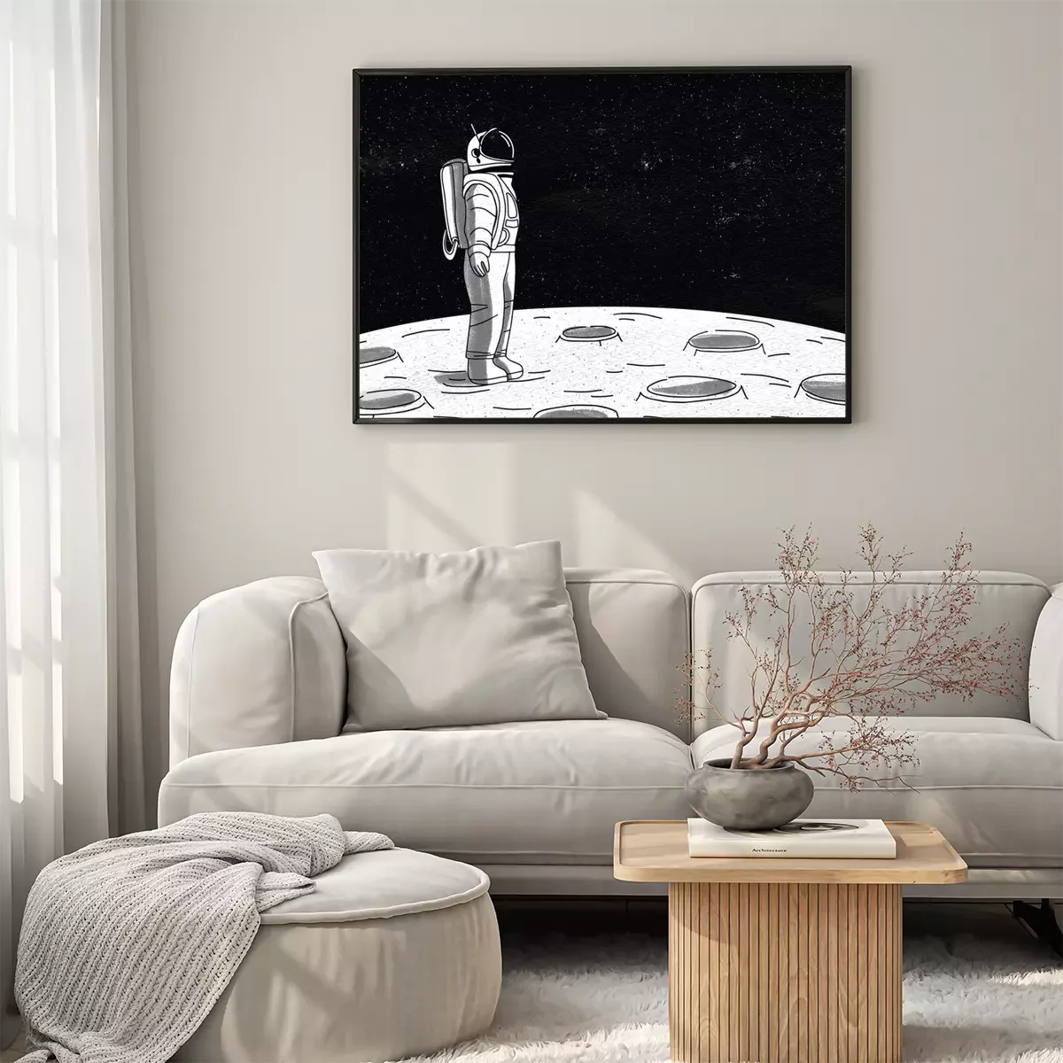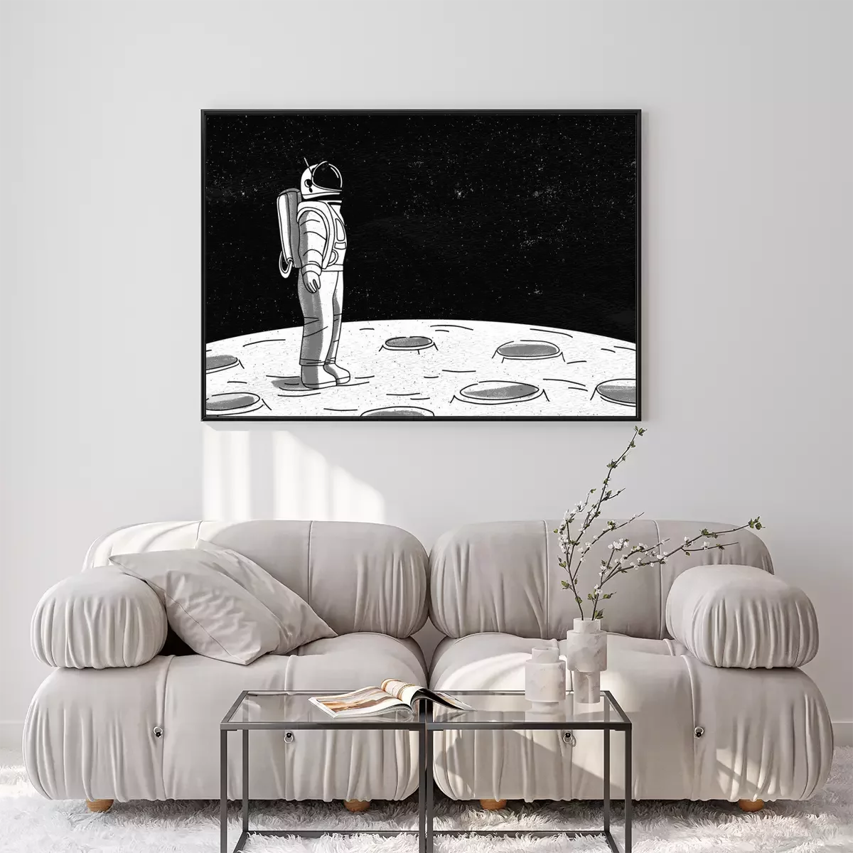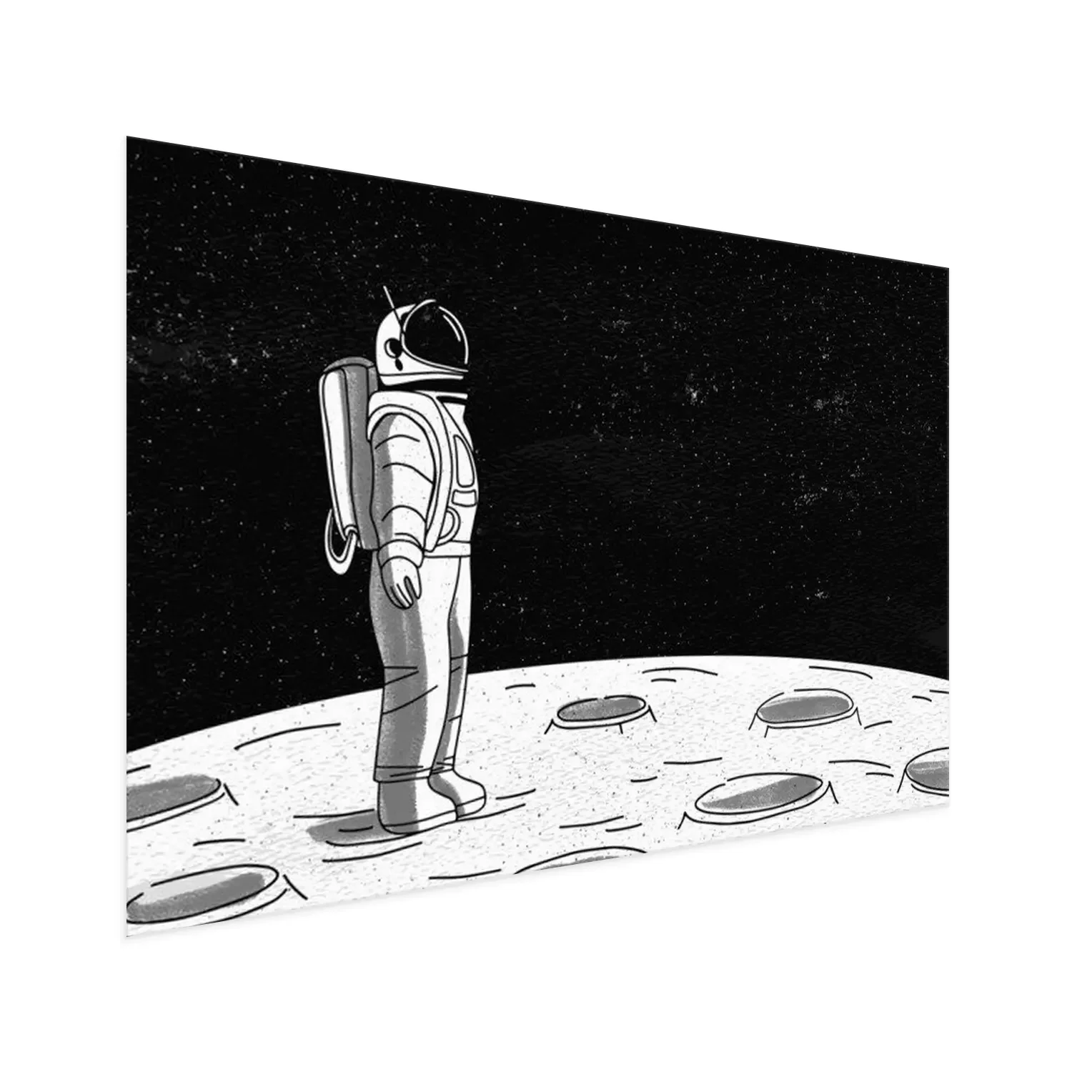 Poster Eenzame astronaut in ruimtepak die zich op het oppervlak van de maan en kijken naar ruimte vol met sterren. Kosmonaut planeet of hemellichaam verkennen tijdens missie. Monochrome hand getrokken vector