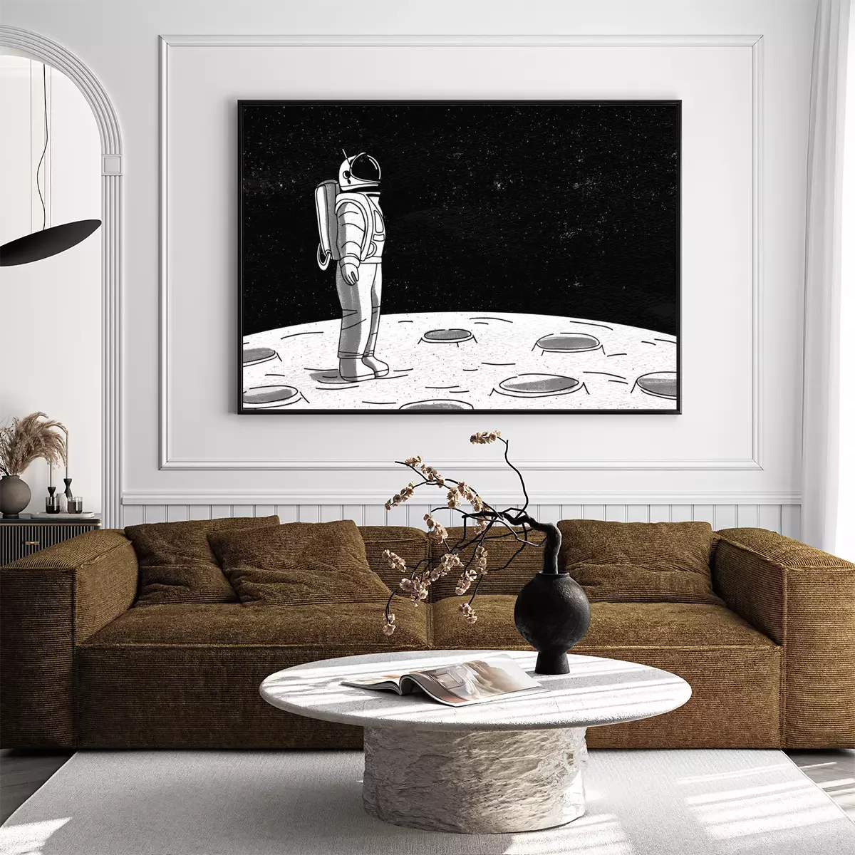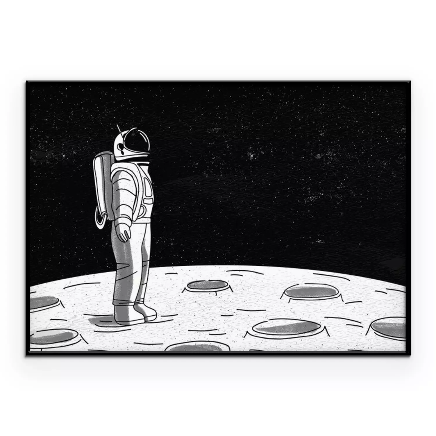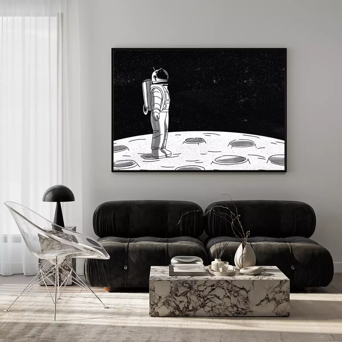 Poster Eenzame astronaut in ruimtepak die zich op het oppervlak van de maan en kijken naar ruimte vol met sterren. Kosmonaut planeet of hemellichaam verkennen tijdens missie. Monochrome hand getrokken vector