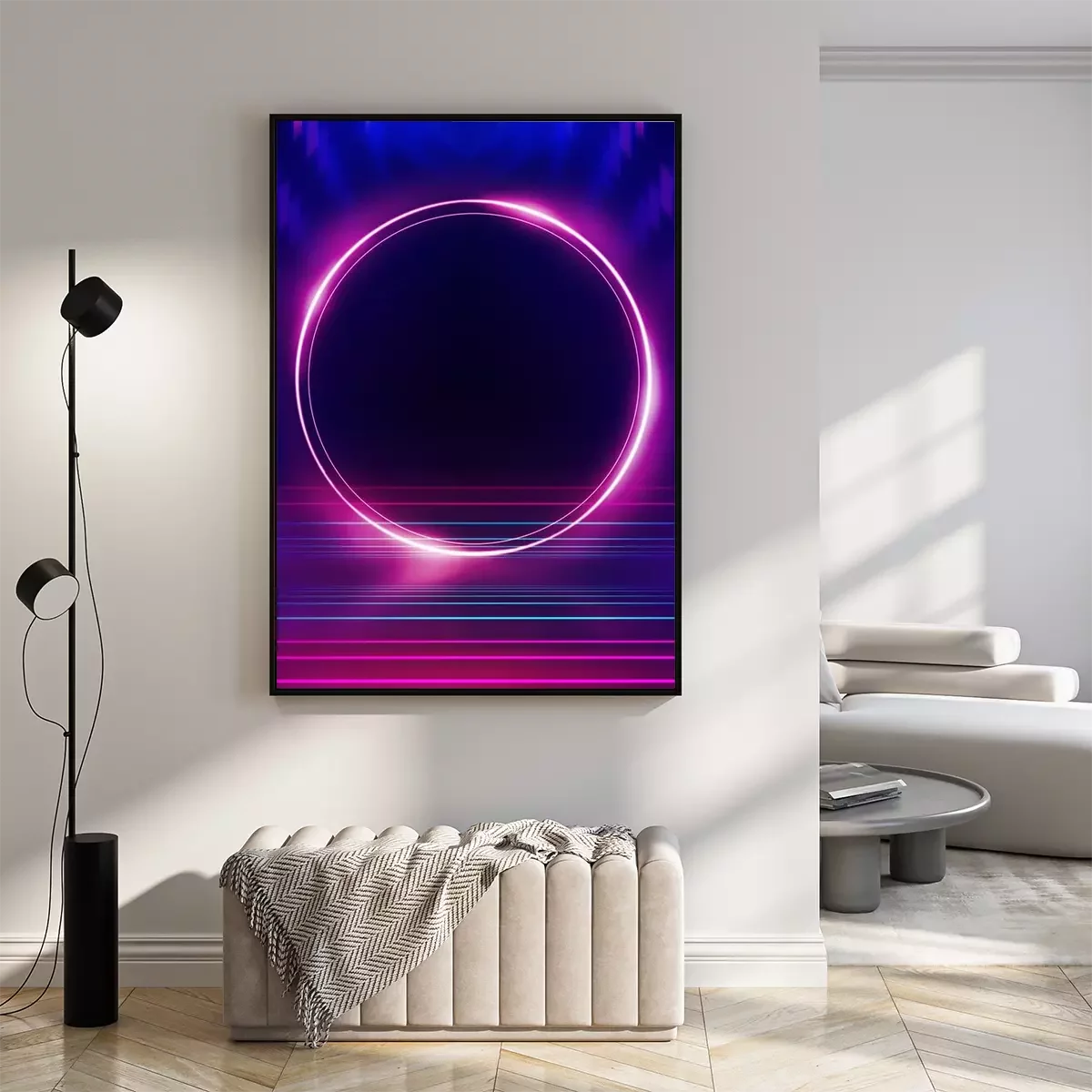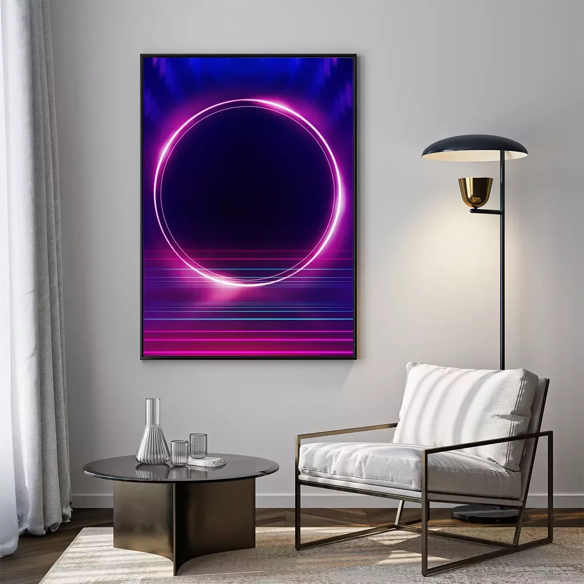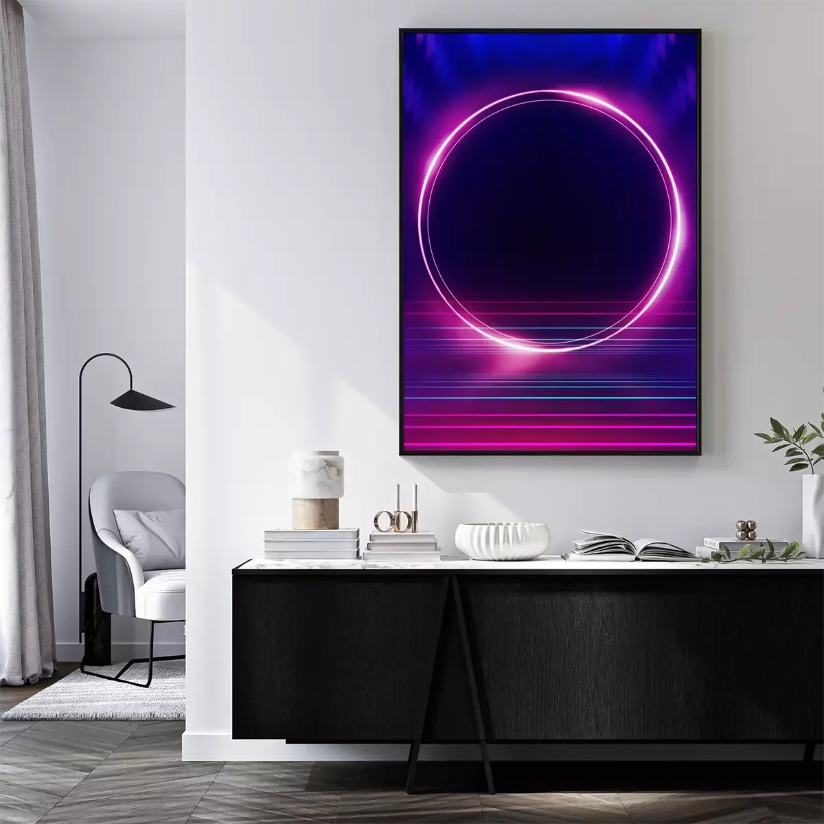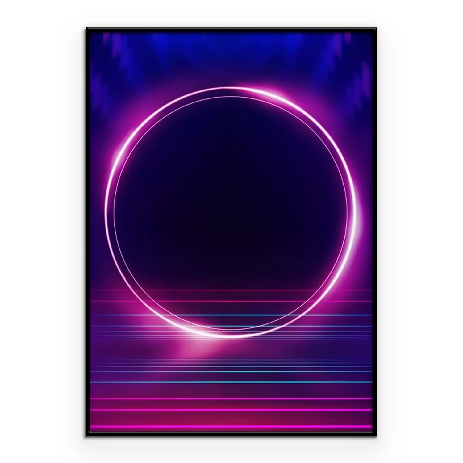 Poster: Empty dark abstract background. Background of empty show scene. Glow of neon lights and neon figures on an empty concert stage. Reflection of light on the pavement.