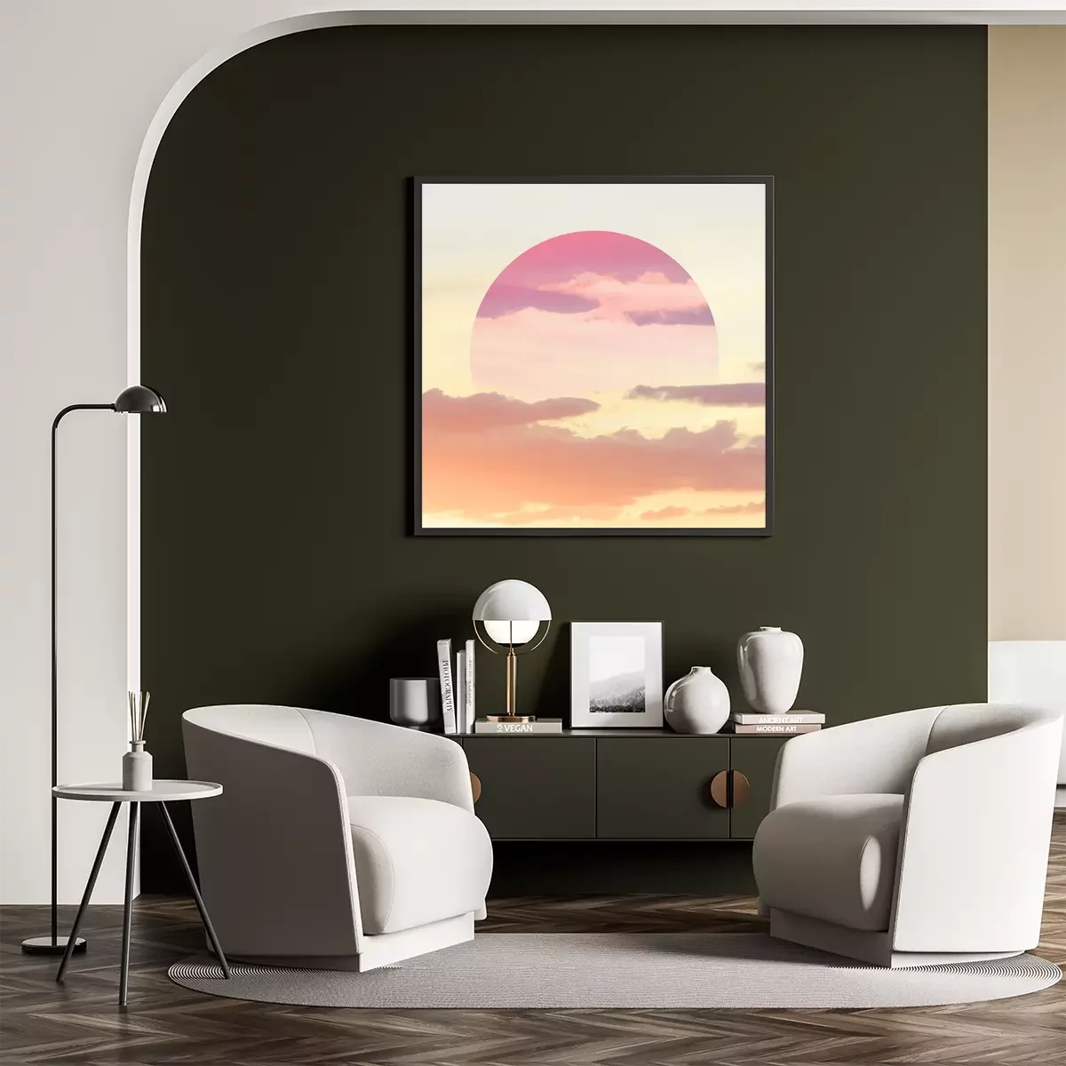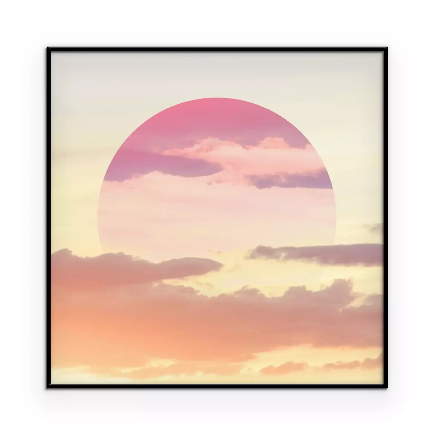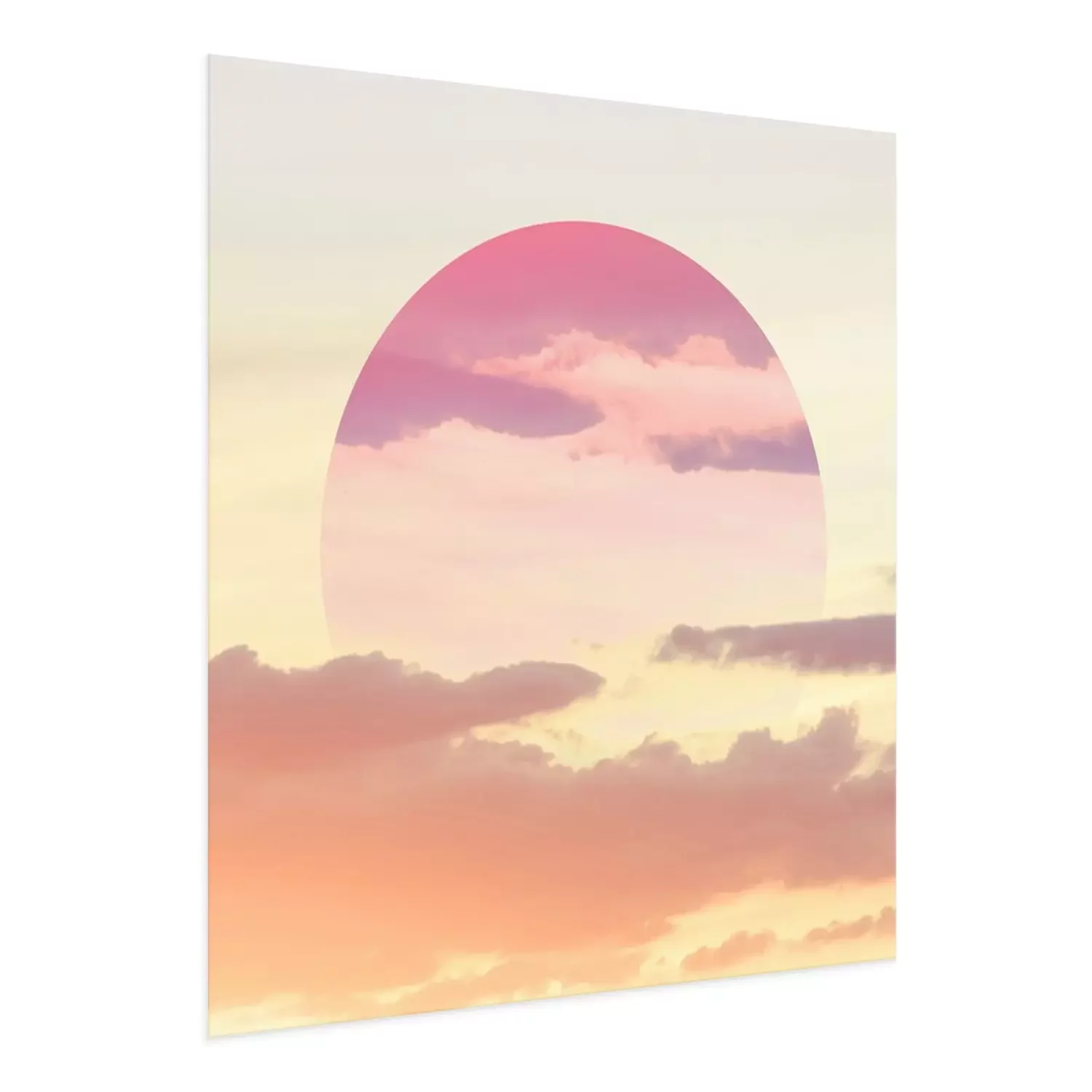 Poster: Esthetische kunstcollage met mooie hemelzonsondergang en spiegelbezinning in cirkelkader.