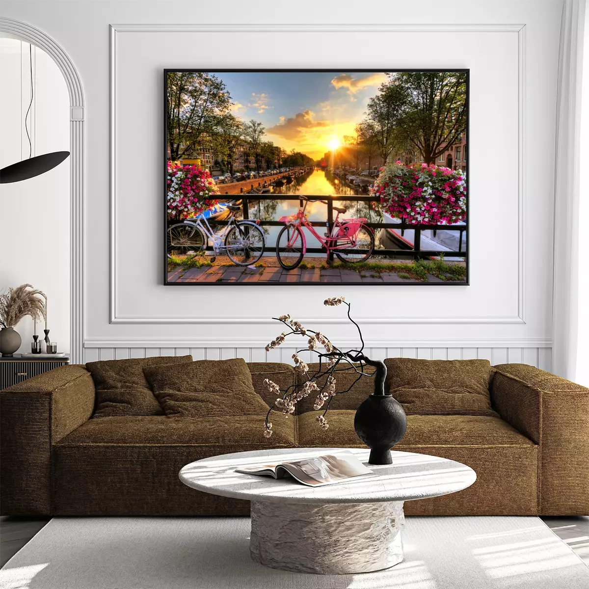 Poster Fahrräder in Amsterdam bei Sonnenuntergang