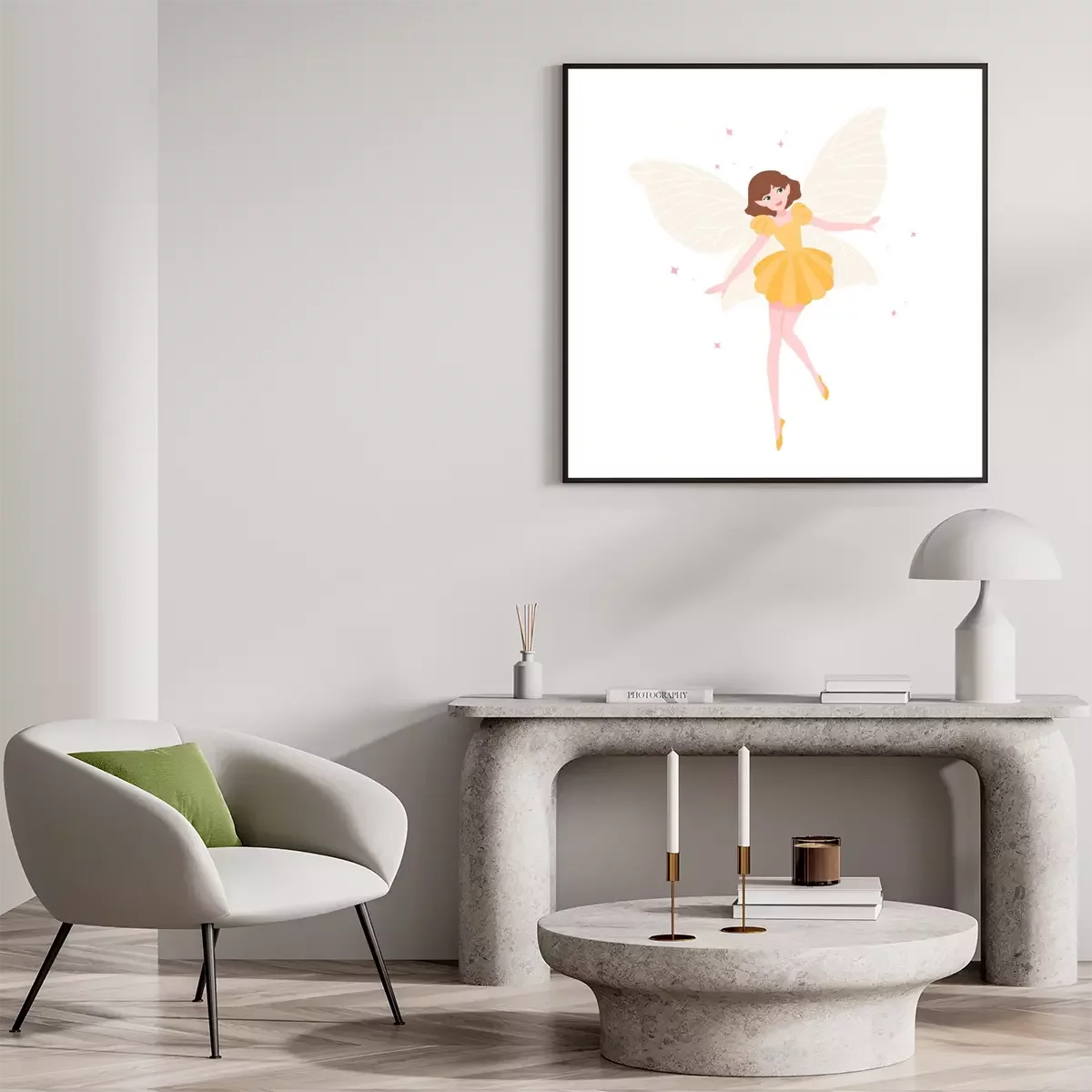 Poster: Fairy in een gele jurk en pantoffels
