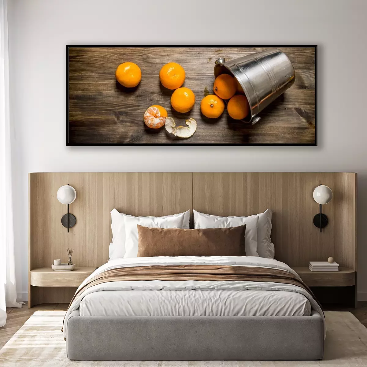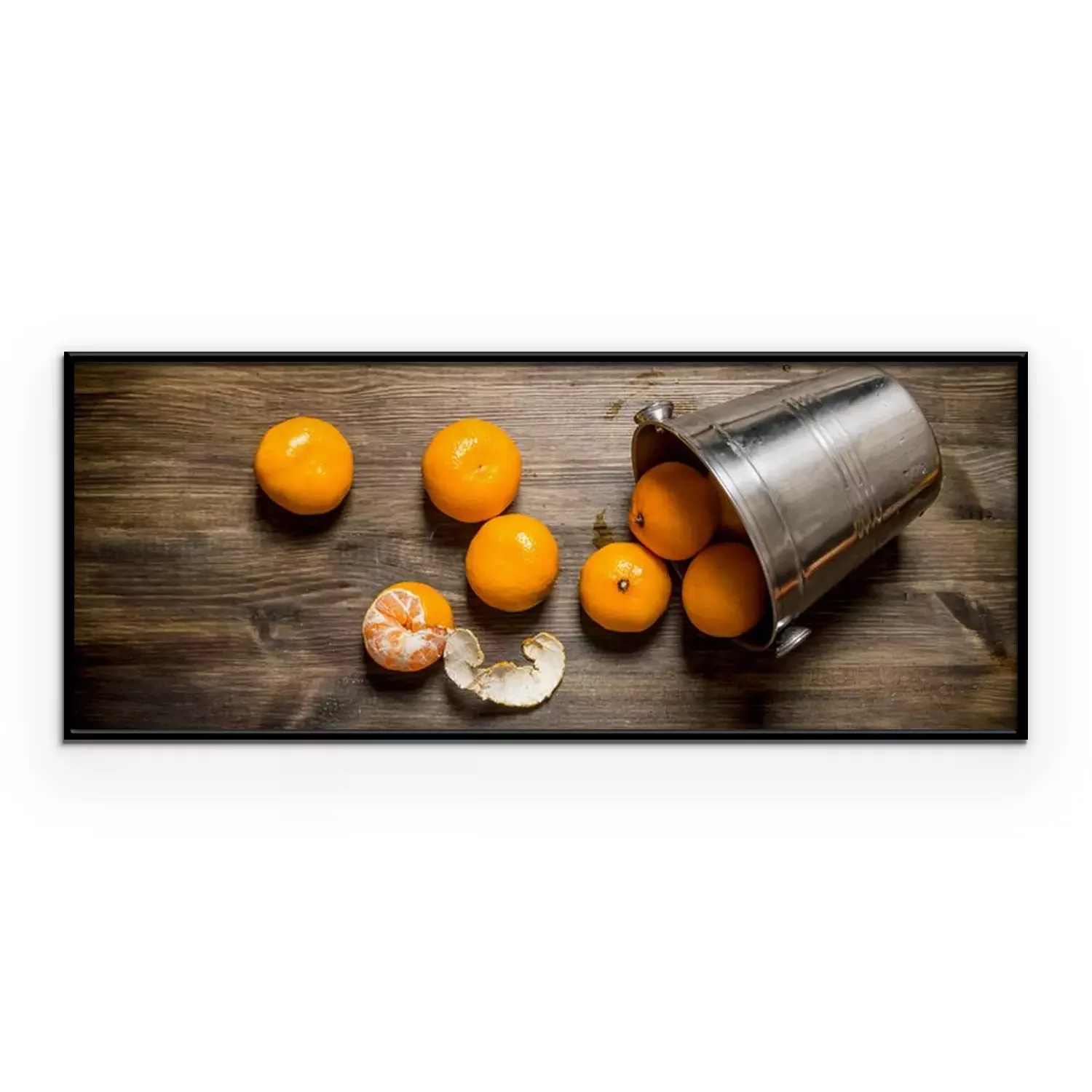 Poster: Fallen emmer met vers mandarijnen. Op houten tafel.