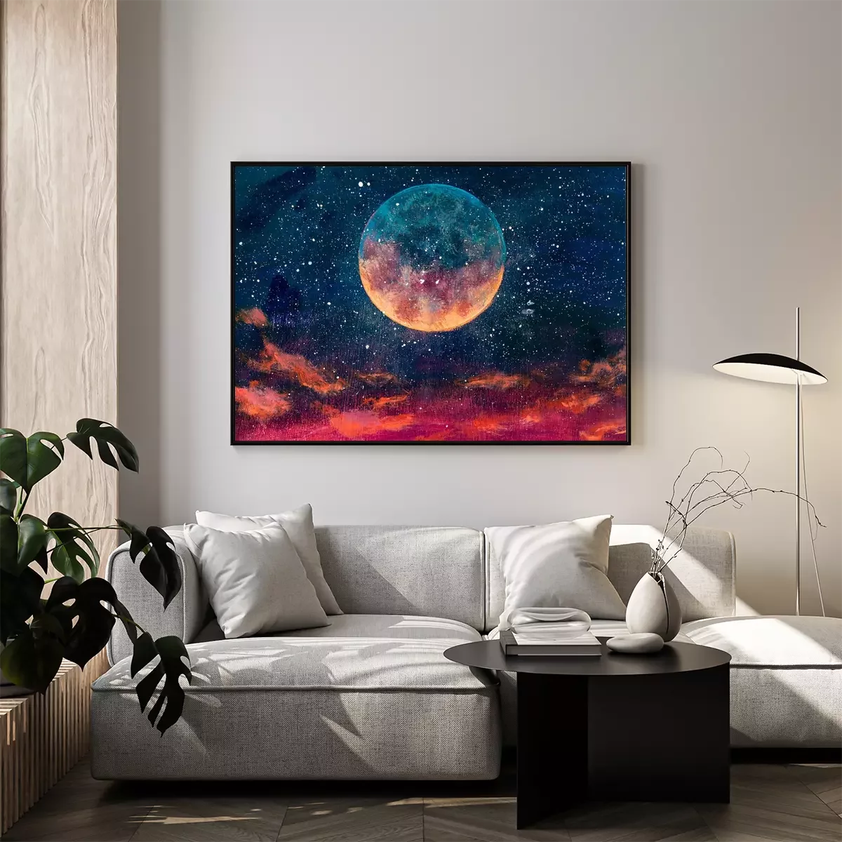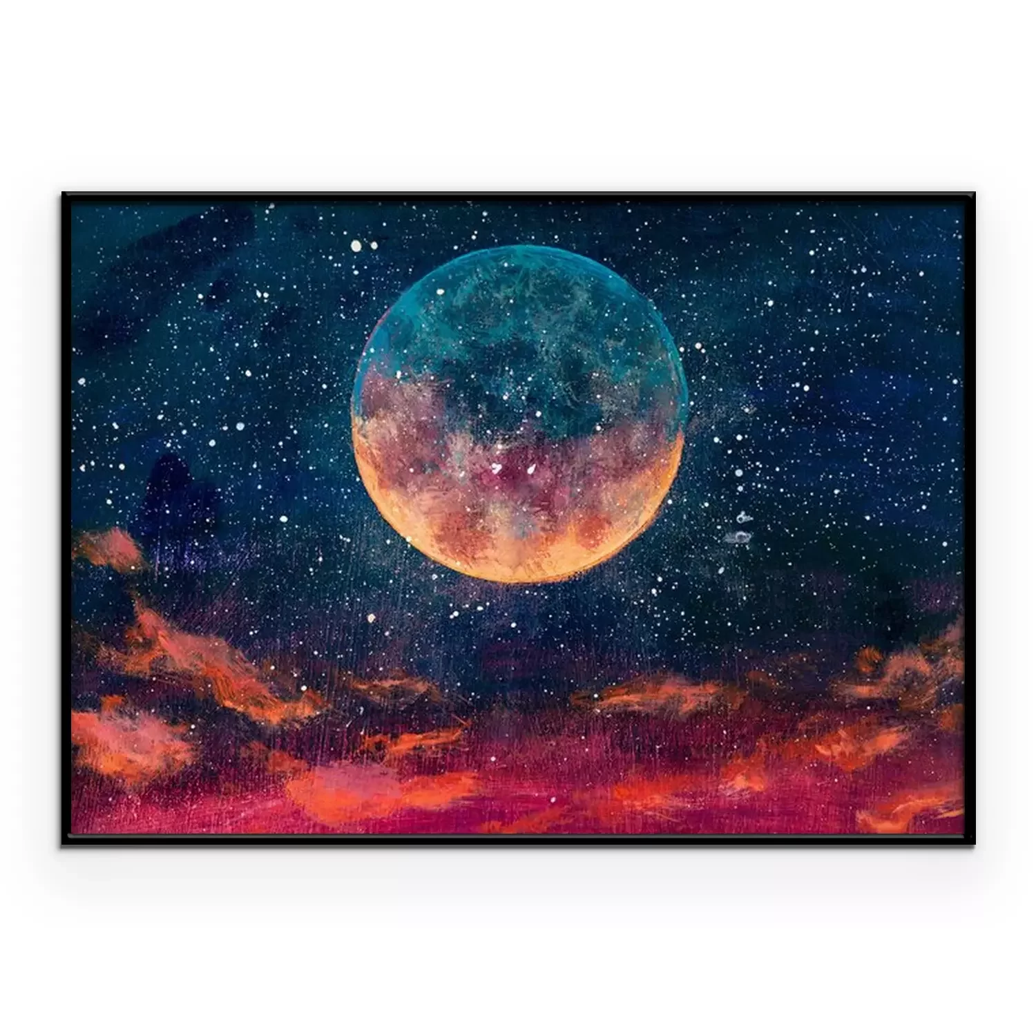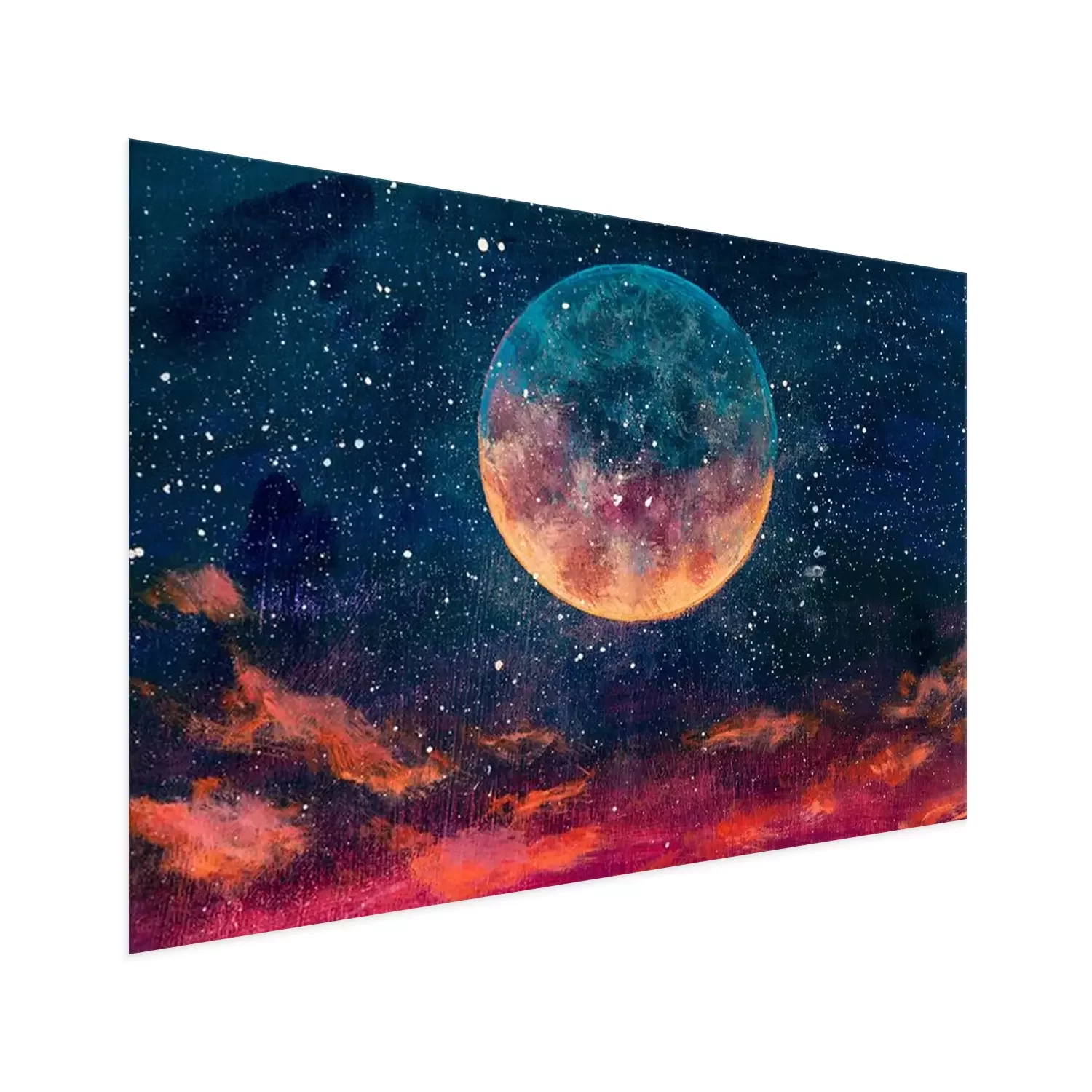 Poster: Fantastic oil painting beautiful big planet moon among stars in universe. Fantasy concept cosmos fine art paintingartwork for book illustration