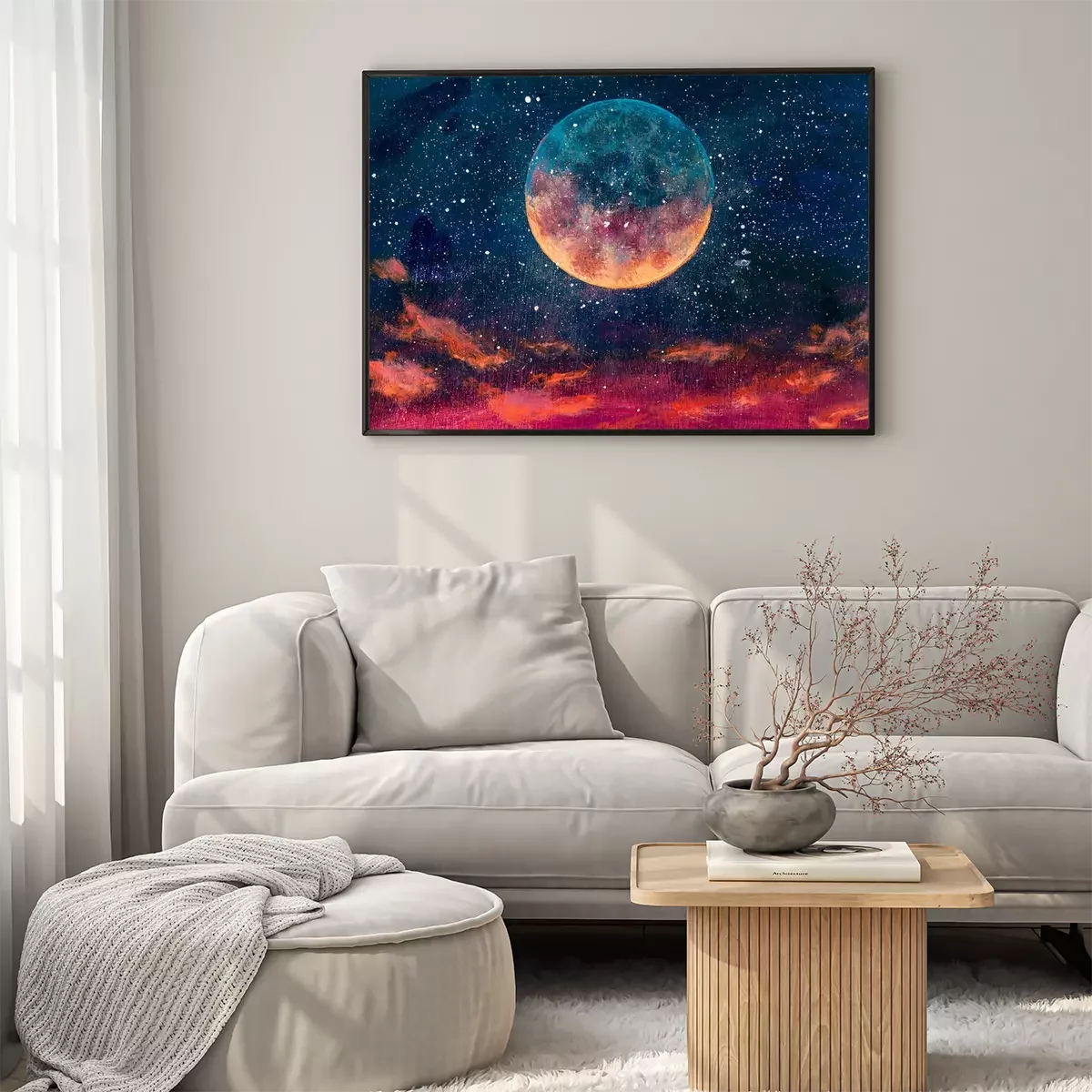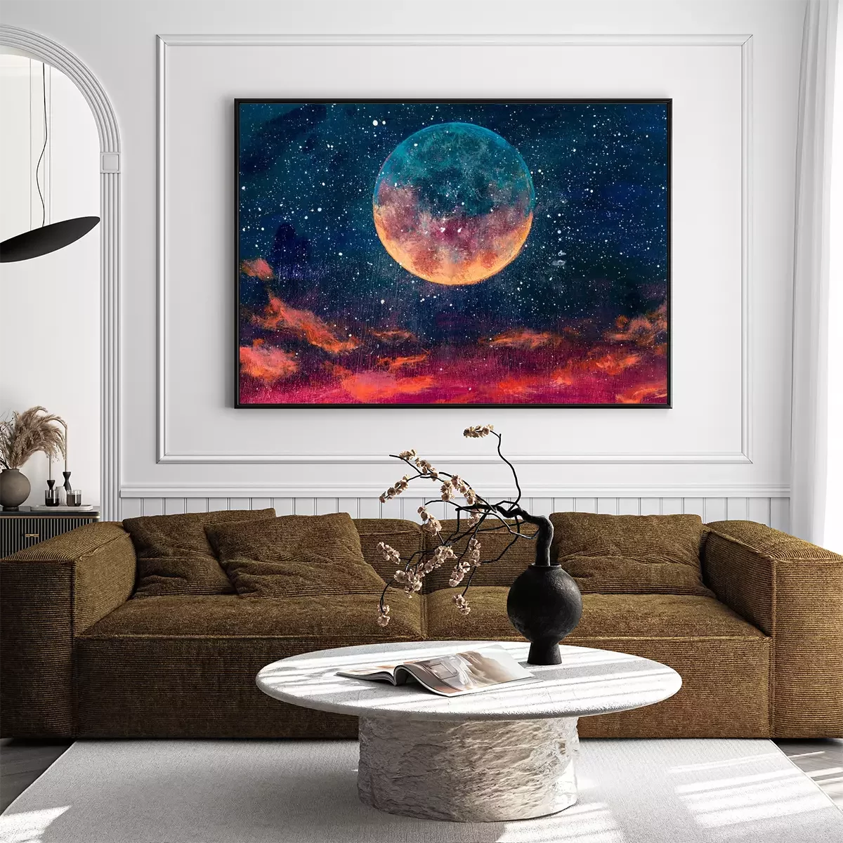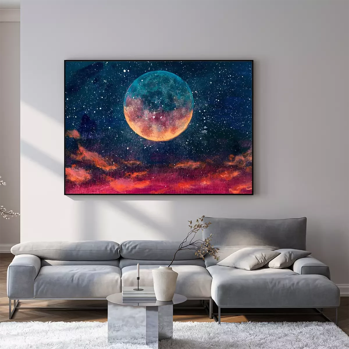 Poster: Fantastic oil painting beautiful big planet moon among stars in universe. Fantasy concept cosmos fine art paintingartwork for book illustration
