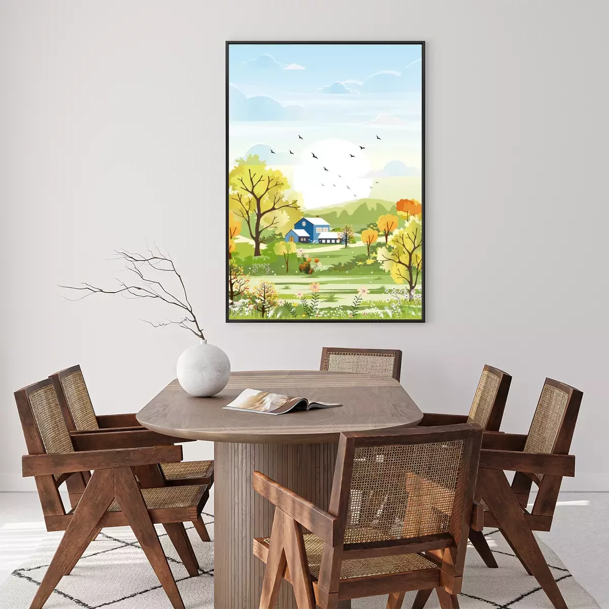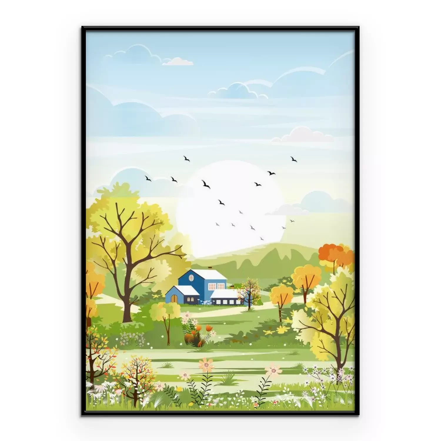 Poster: Fantasy panorama landscapes of Countryside in spring farm field, Panoramic of summer with blue sky, farm house, mountains, wild flowers in green foliage. Natural background for banner