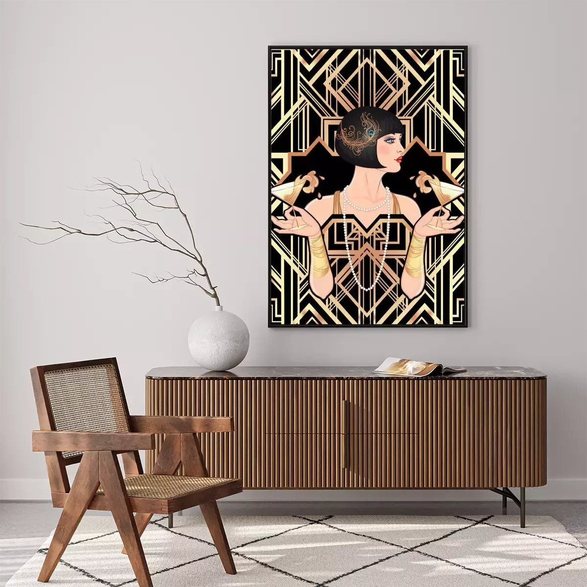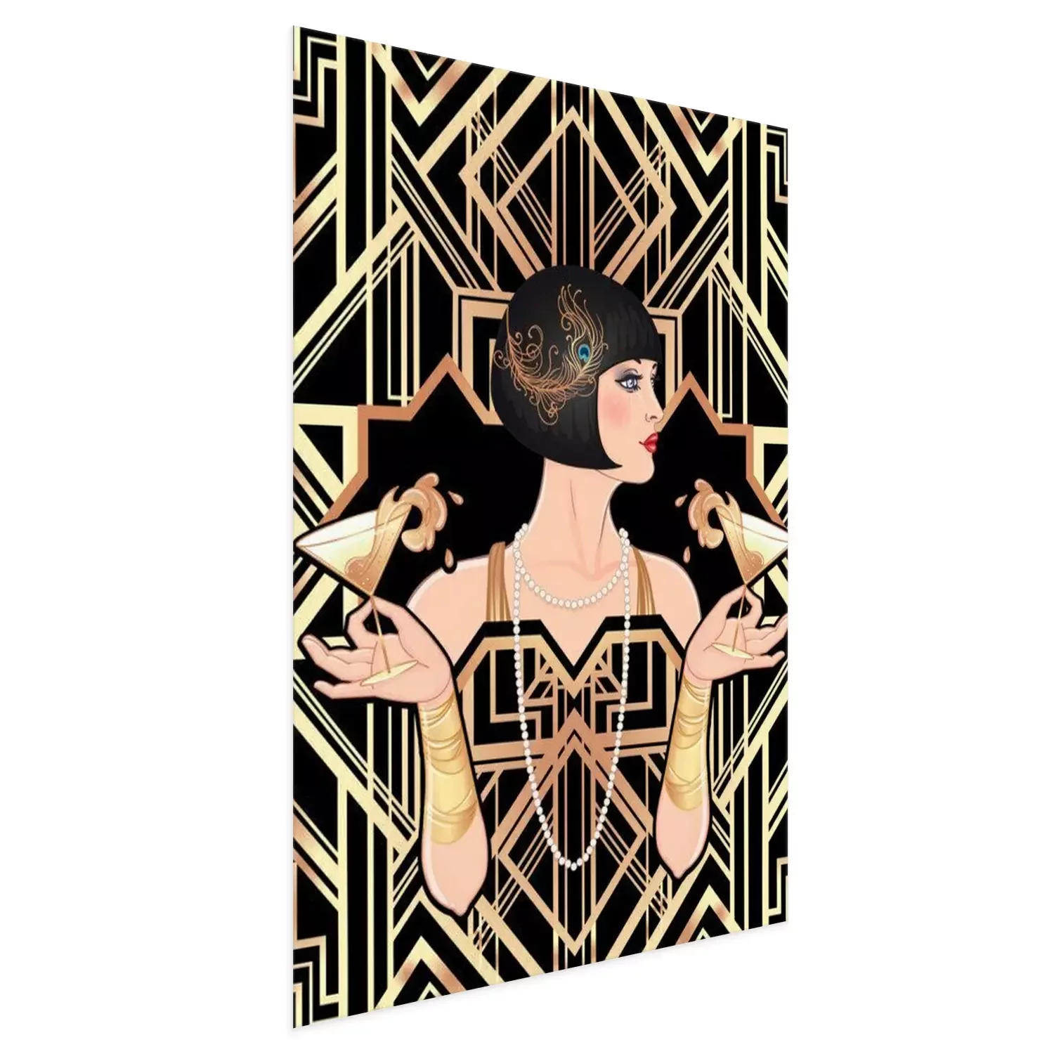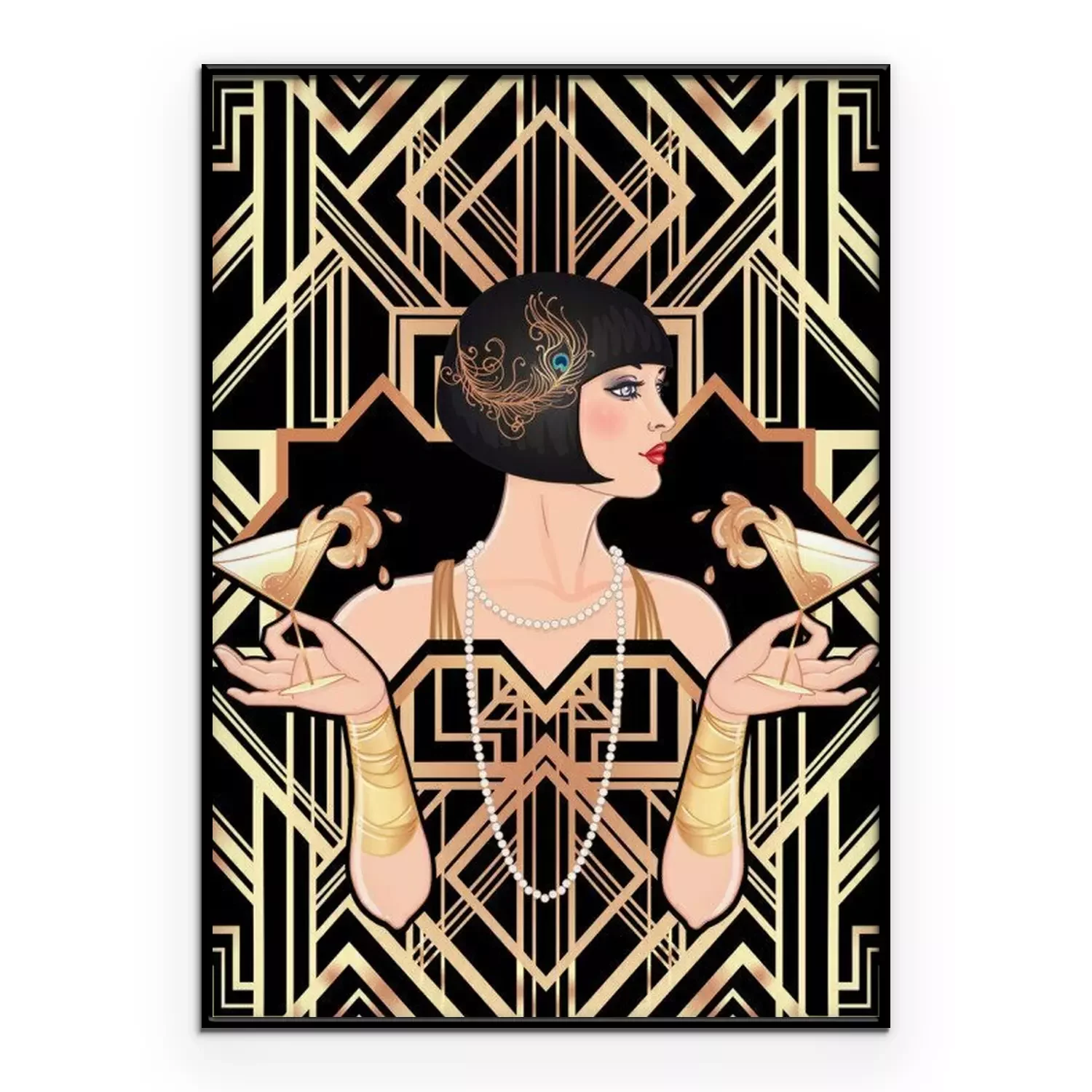 Poster Female hand holding cocktail glass with splash. Art deco (1920's style) vintage invitation template design for drink list, bar menu, glamour event, thematic wedding, jazz party flyer.